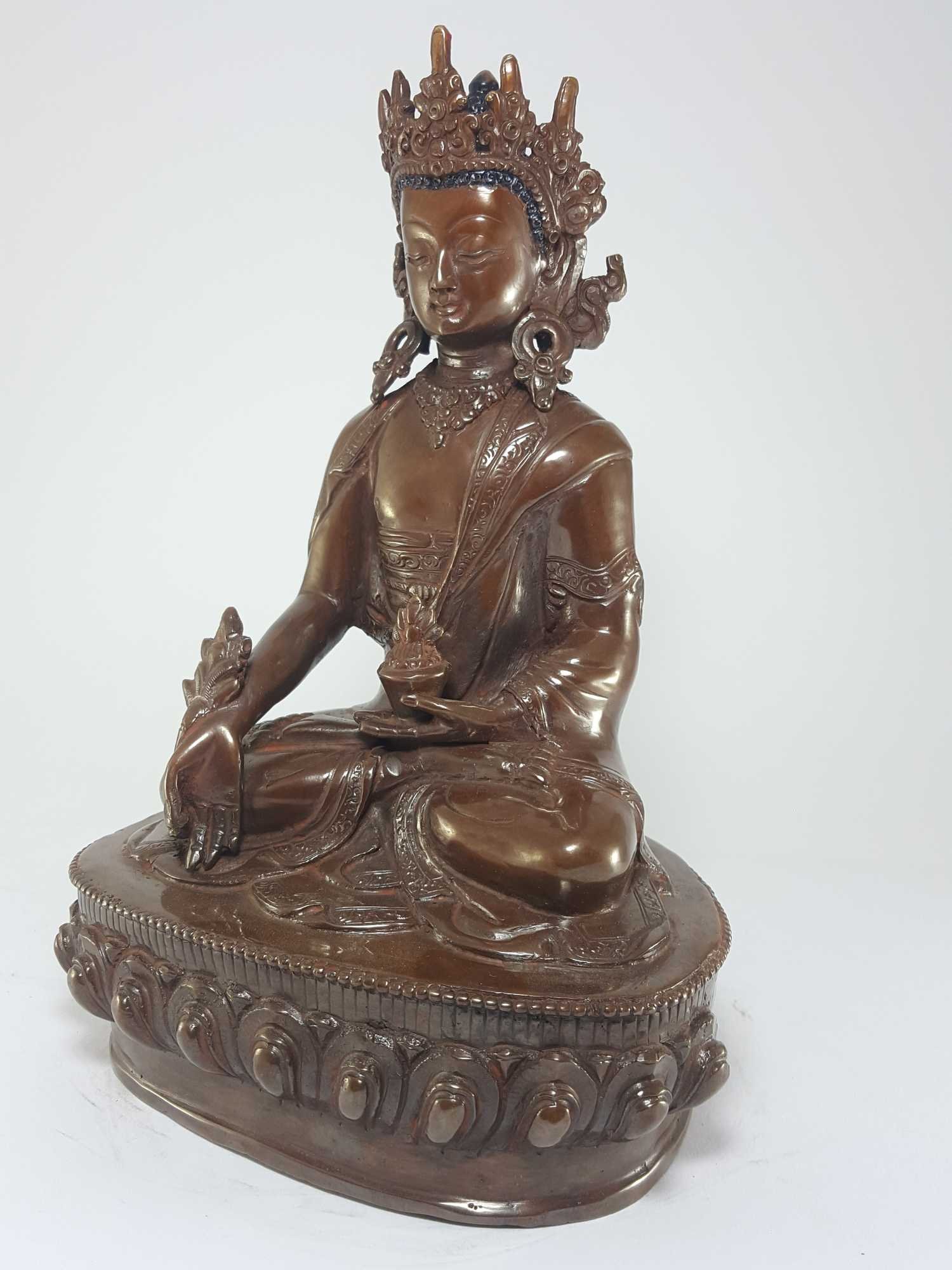 This Medicine Buddha has been meticulously treated with a chocolate color antique patina. The intention behind this patina is to replicate the appearance of a copper statue that has gracefully aged over a century. Unlike a simple coat of paint, this patina is not applied superficially and is designed to endure. It undergoes an artificial oxidation process that adds depth and character, while also serving as a protective layer against natural oxidation.