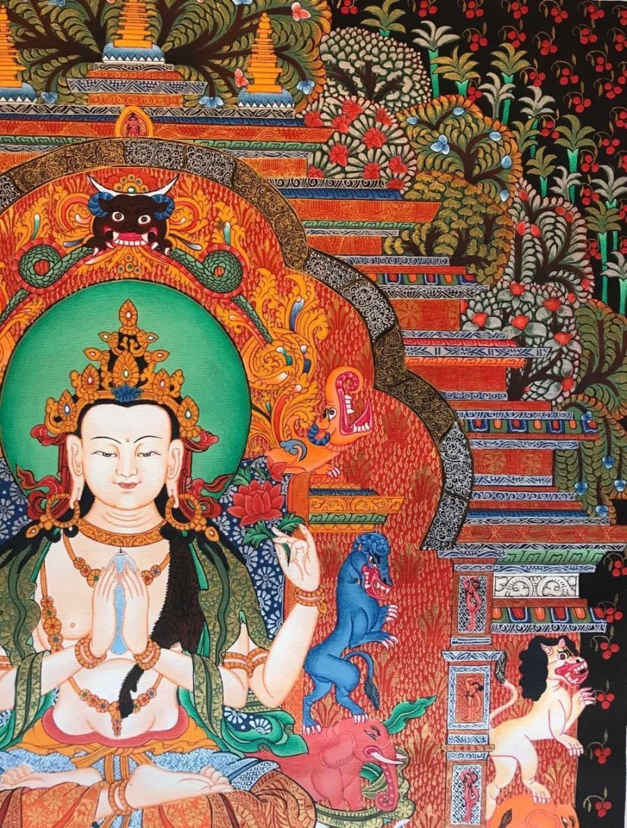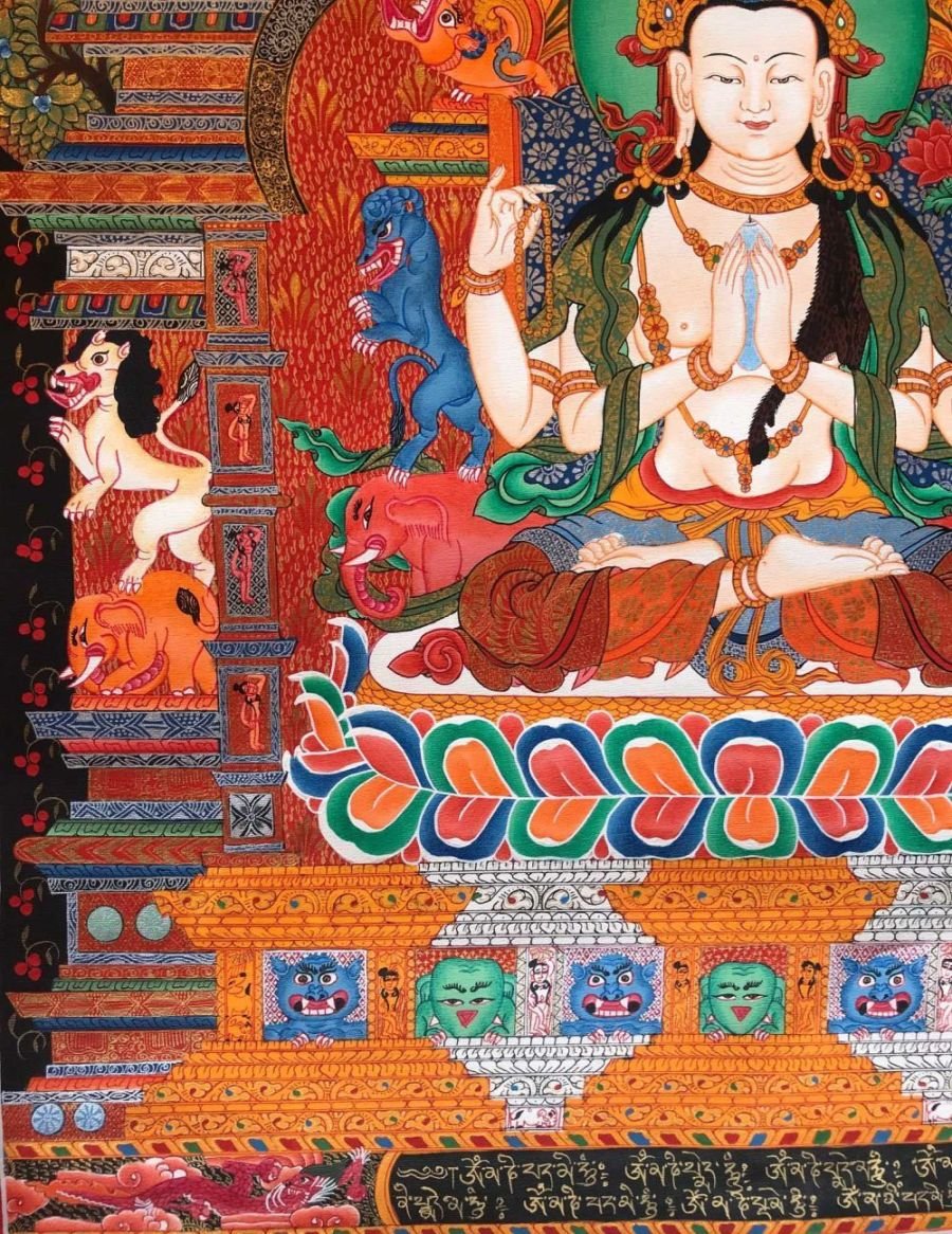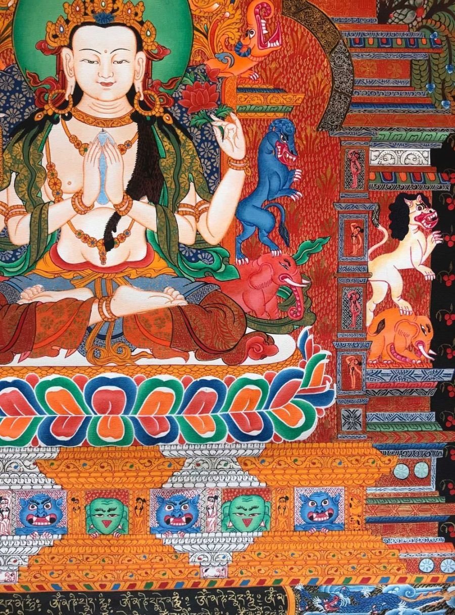 This Chenrezig is a newari thangka or Paubaha, Paubha, also known as "paubhas," is a traditional religious painting created by the Newar people of Nepal. These exquisite artworks depict various subjects, including deities, mandalas, and monuments, and serve as aids for meditation and spiritual practices. Paubhas are similar to Tibetan Thangka paintings and are highly regarded for their religious and cultural significance.
