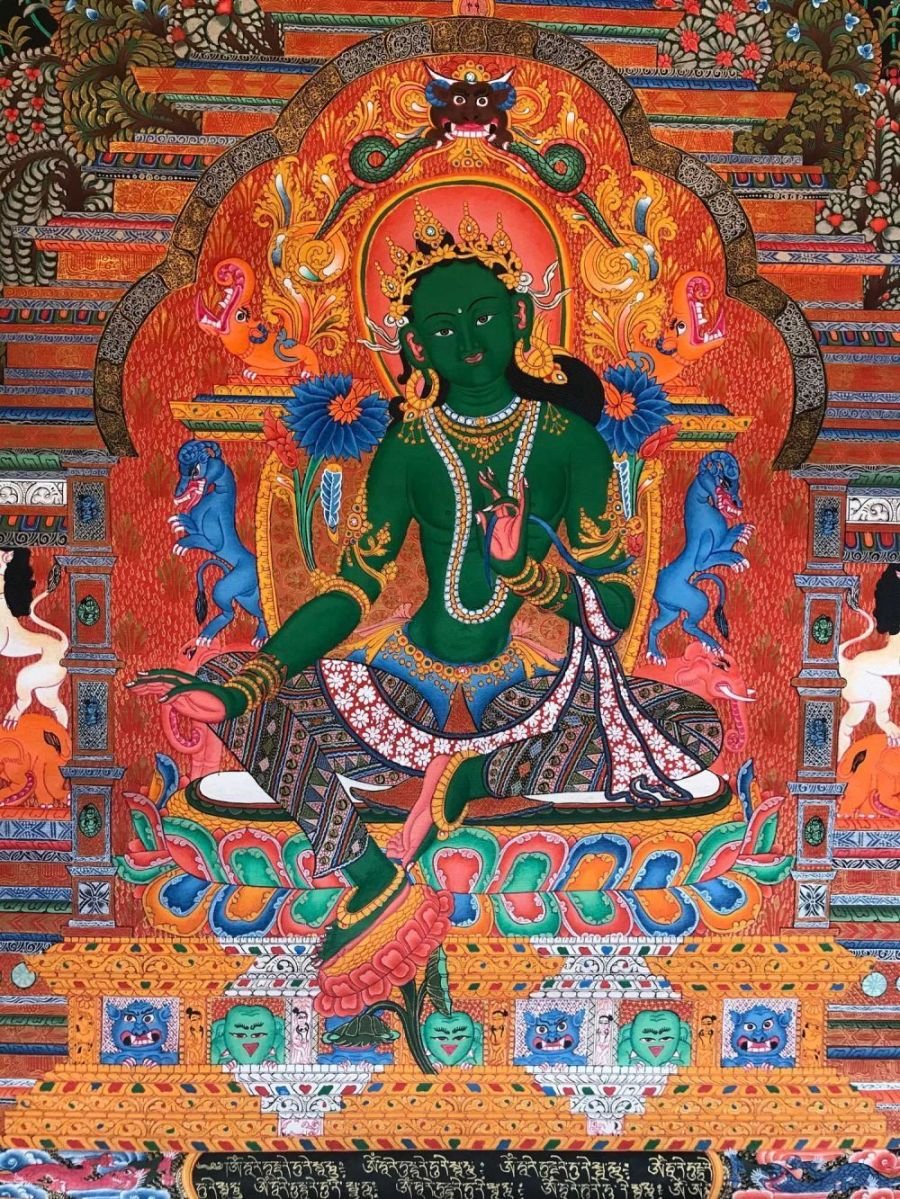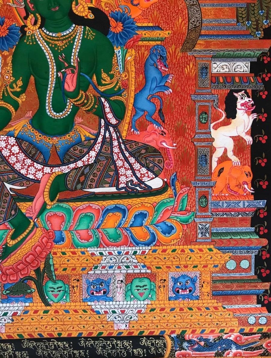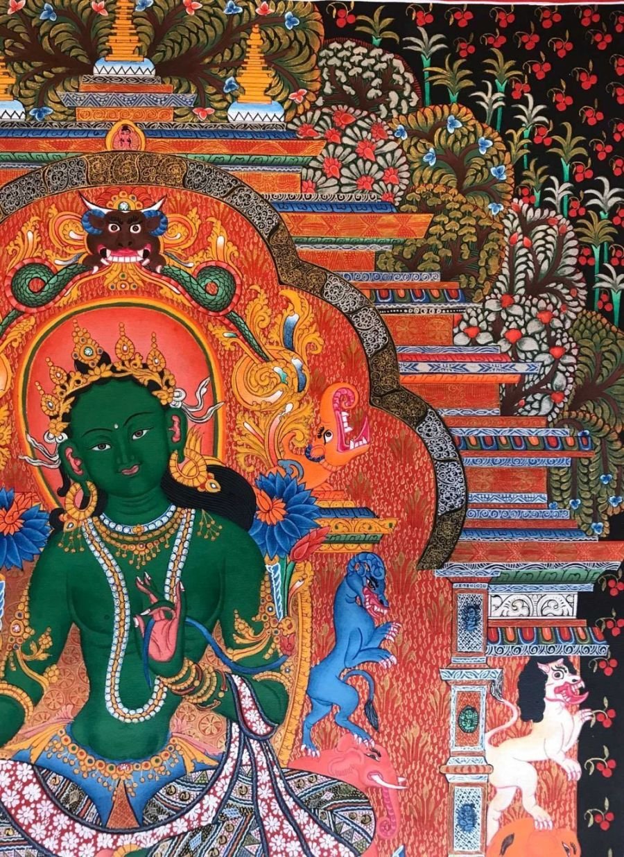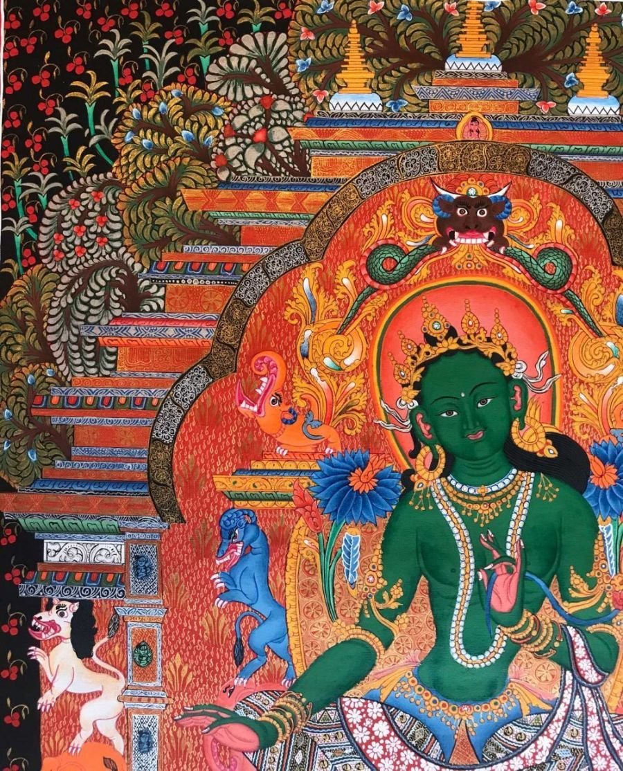 This Green Tara is a newari thangka or Paubaha, Paubha, also known as "paubhas," is a traditional religious painting created by the Newar people of Nepal. These exquisite artworks depict various subjects, including deities, mandalas, and monuments, and serve as aids for meditation and spiritual practices. Paubhas are similar to Tibetan Thangka paintings and are highly regarded for their religious and cultural significance.