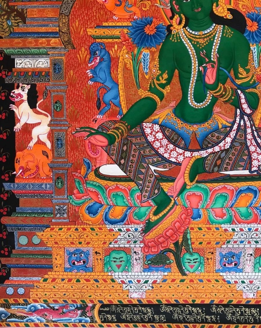 Tibetan Thangka of Green Tara In Newari Paubha, with Real Gold , Goddess of Compassion, Protection, and Swift Action