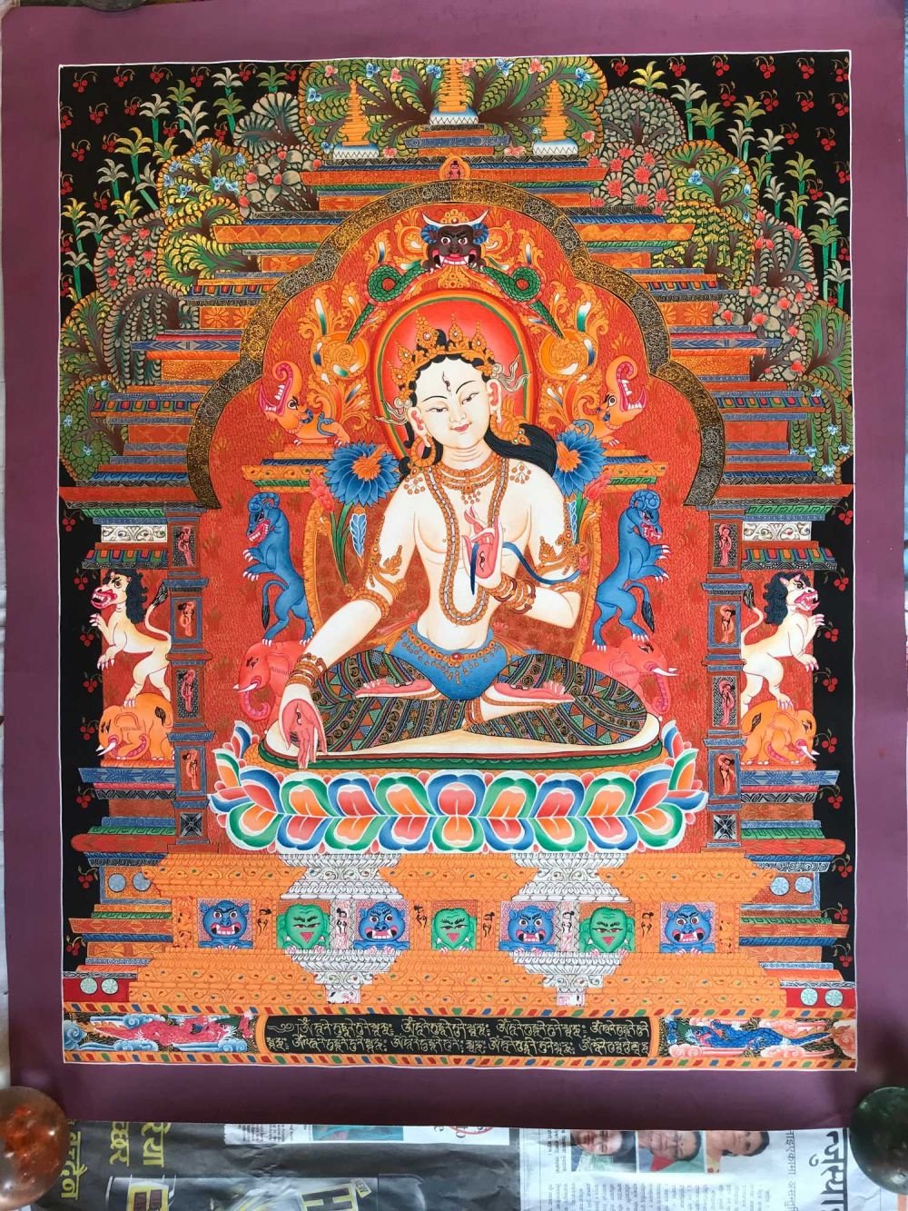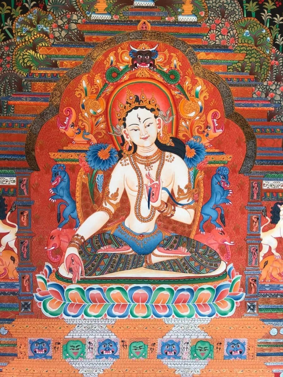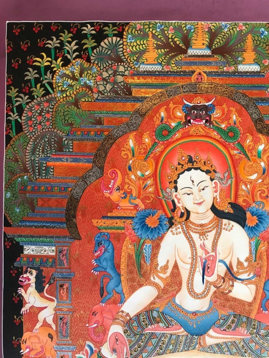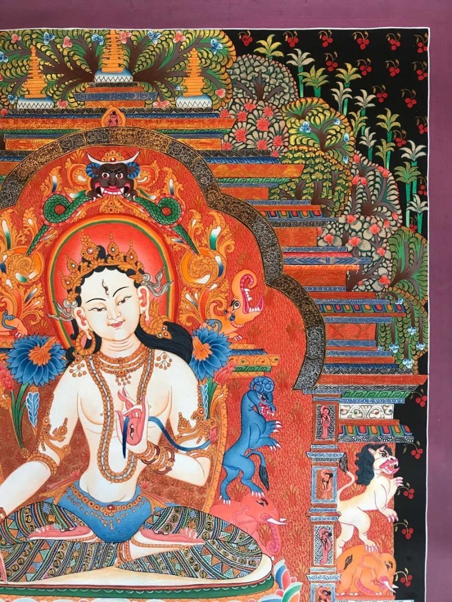 This White Tara is a newari thangka or Paubaha, Paubha, also known as "paubhas," is a traditional religious painting created by the Newar people of Nepal. These exquisite artworks depict various subjects, including deities, mandalas, and monuments, and serve as aids for meditation and spiritual practices. Paubhas are similar to Tibetan Thangka paintings and are highly regarded for their religious and cultural significance.