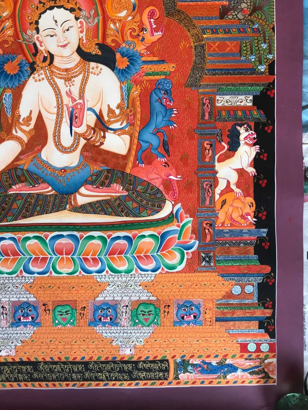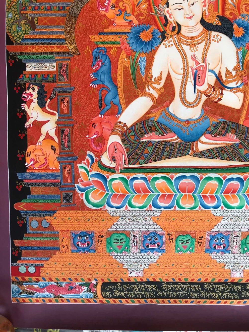 There is a lotus on her diadem bearing the Wish Granting Gem [Skt. Chintamani] surrounded by an aureole of fire symbolising auspicious blessings. The extra eye on her forehead, on the palms of her hands & soles of her feet represent her ability to see and understand the sufferings of all beings & her omniscient compassion toward the suffering. Avalokiteshvara [Tib. Chengresi] her progenitor also has a white body & extra eyes. The eyes denote psychic & supernatural power. The rainbow coloured leggings represent a mastery of Boddhi Nature [Skt. Siddhi] & a manifestation of the Sambhogakaya. The dark blue layer of clothing signifies Mantrayana practice. She is upon a white moon disk & has an orange sun aureole to representing her emanation their melting point [Skt. Nada]. There is a branch of an Ashoka Tree in the foreground. The word Ashoka means 'without sorrow' in other words she has no regrets about her behaviour. The tree linked to the Vedic God of love & sexual union Kamadeva which blossoms when a virtuous lady touches it. The triangular diamond rock formation in the foreground represents the Source of Reality [Skt. Dharmadaya] out of which deities arise & which is generated from emptiness by the seed syllable E. In the Indian language is a Triangular shaped letter D & so expressed in the triangular rock formations.