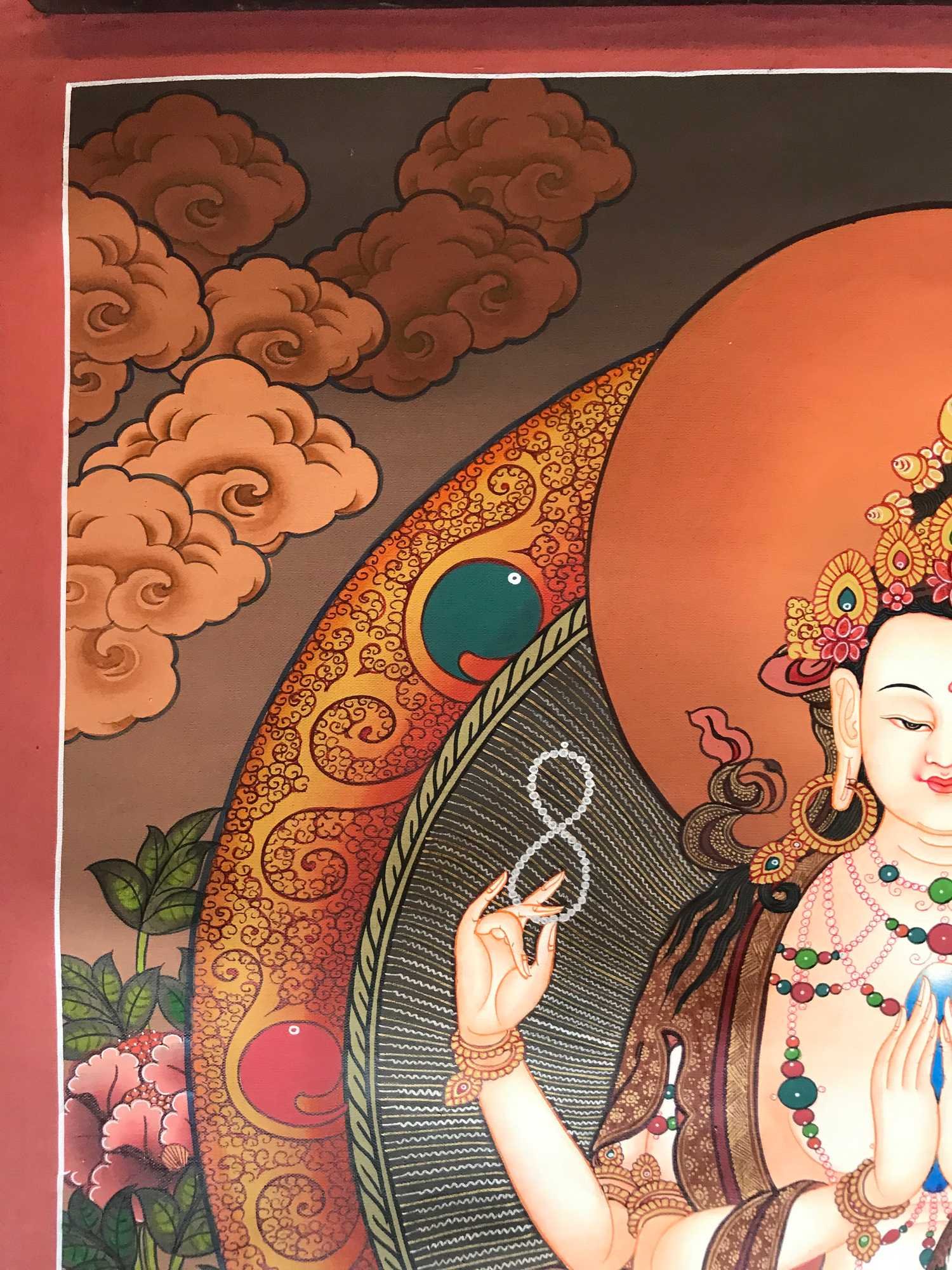 In the outer right hand, Chenrezig is holding crystal beads and moving them the way we use a mala to count mantras. This symbolizes that there is not one moment when Chenrezig does not benefit beings. Like the steady movement of counting the beads, Chenrezig is continuously benefiting sentient beings and turning the wheel of enlightened activity.