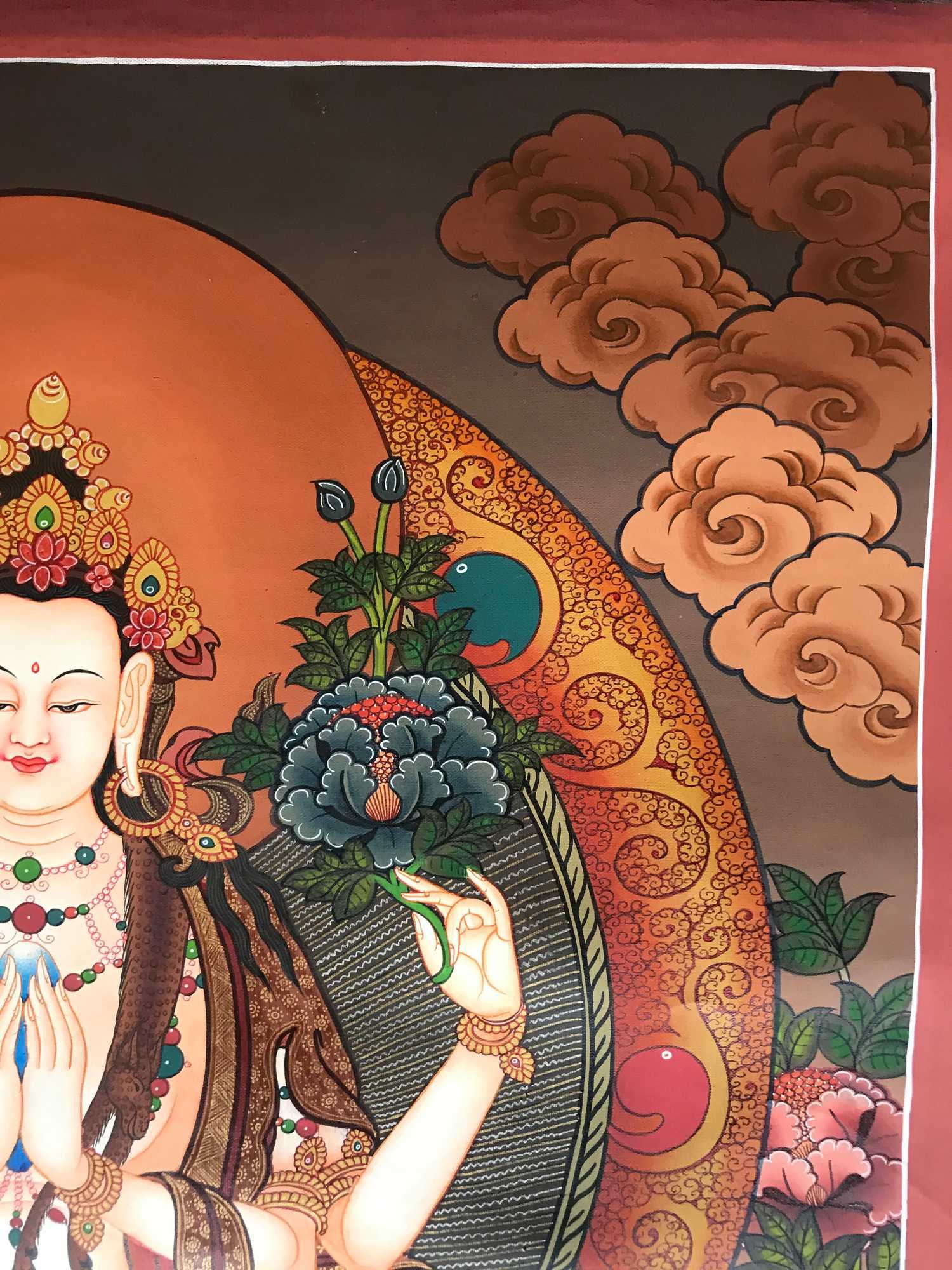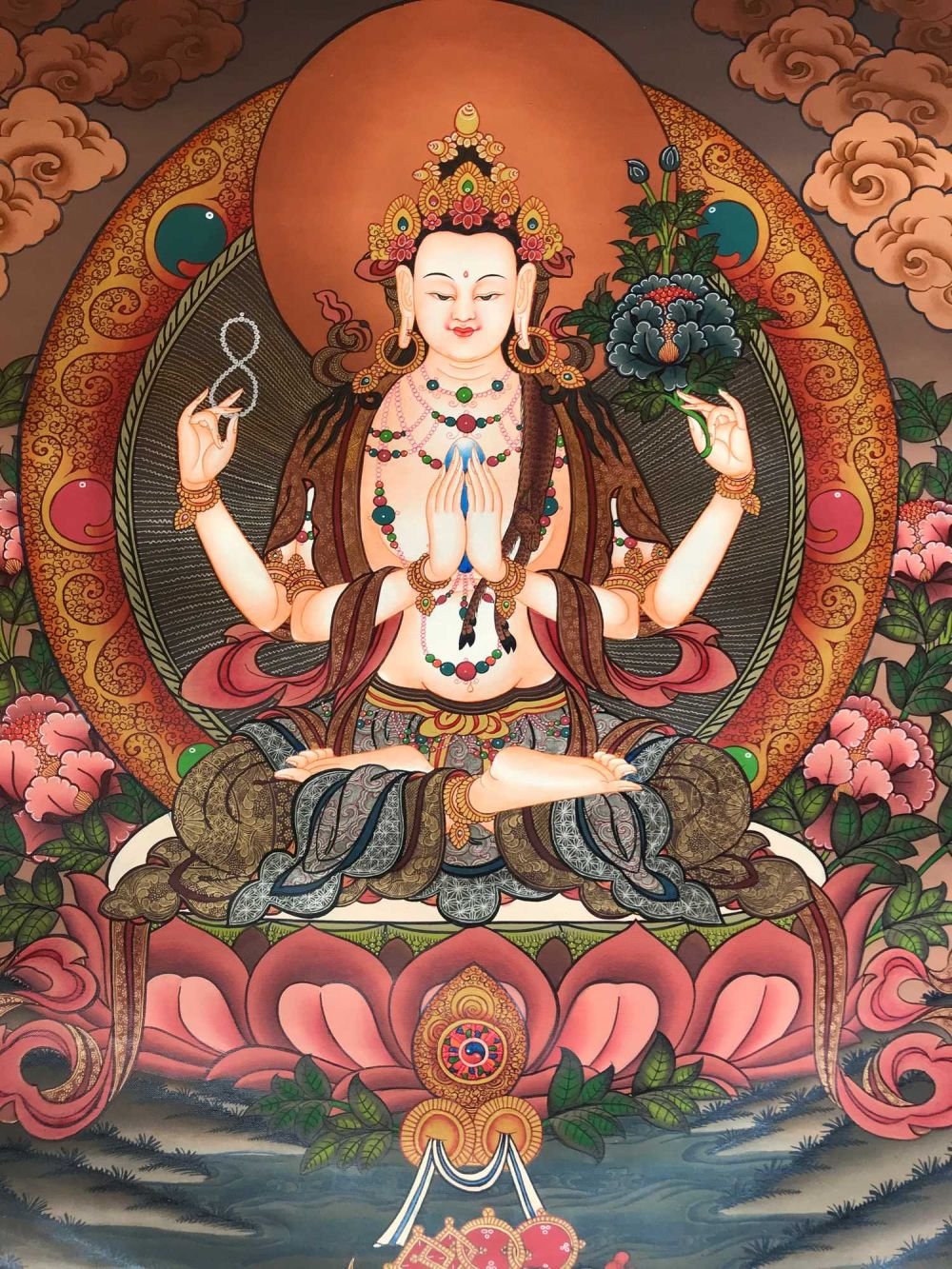 The first two, the inner arms, have palms joined at the heart, holding a sky-blue, and wish fulfilling jewel. This symbolizes that in whatever way Chenrezig manifests to benefit beings, the quality of Chenrezig's mind is never separate from the all-pervasive primal wisdom.