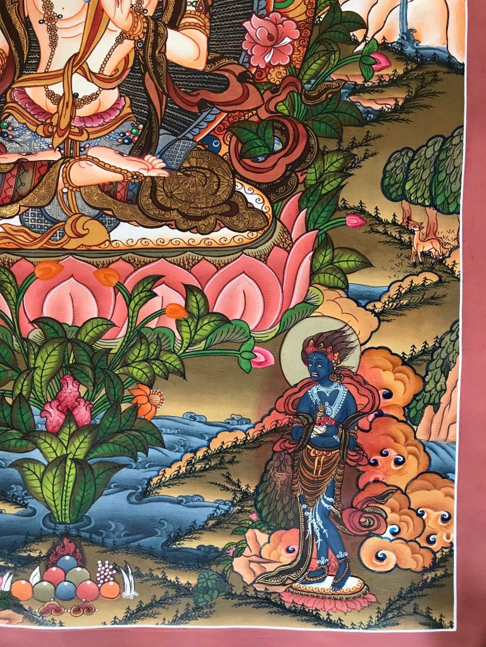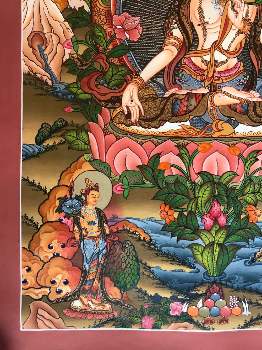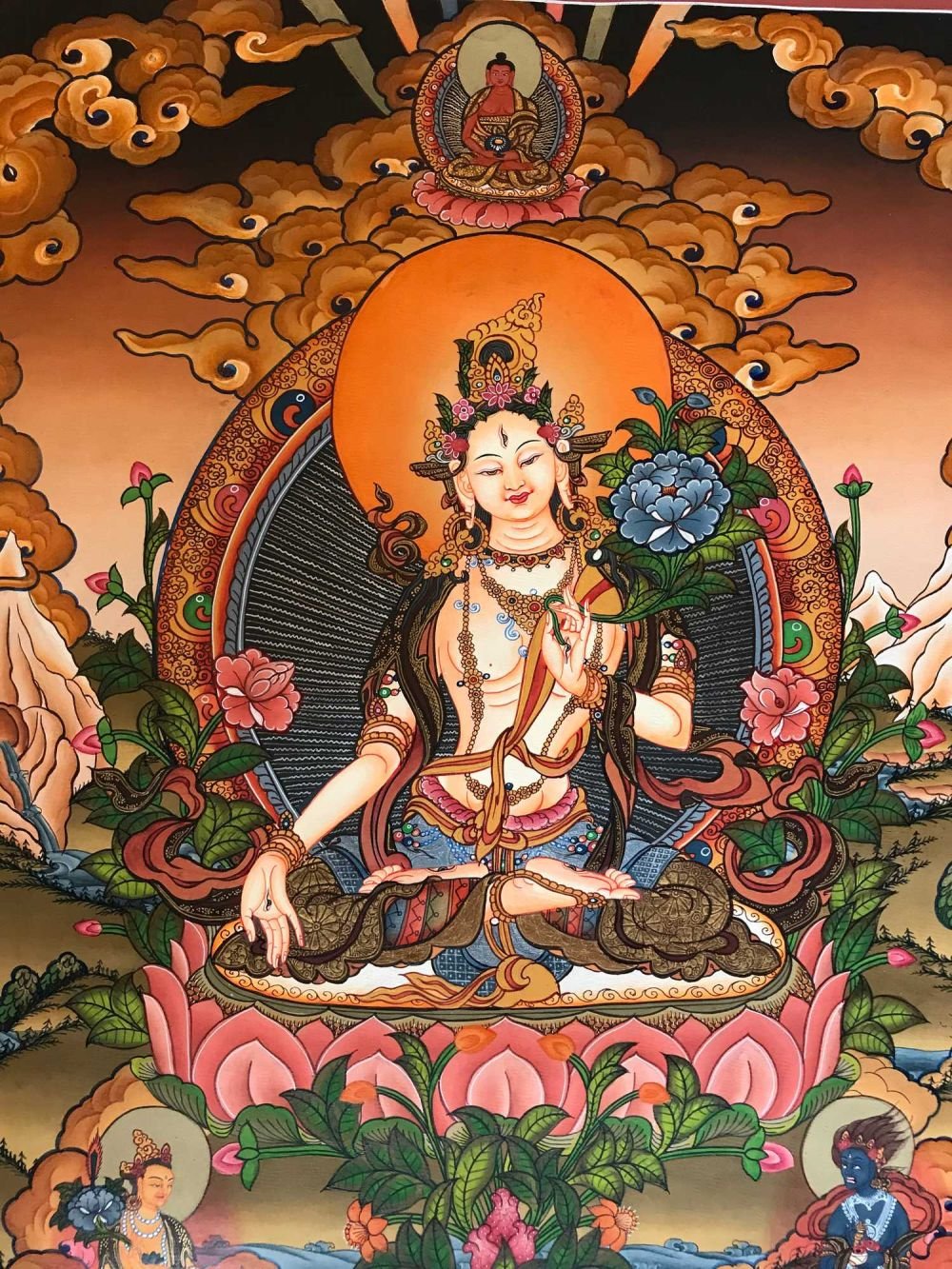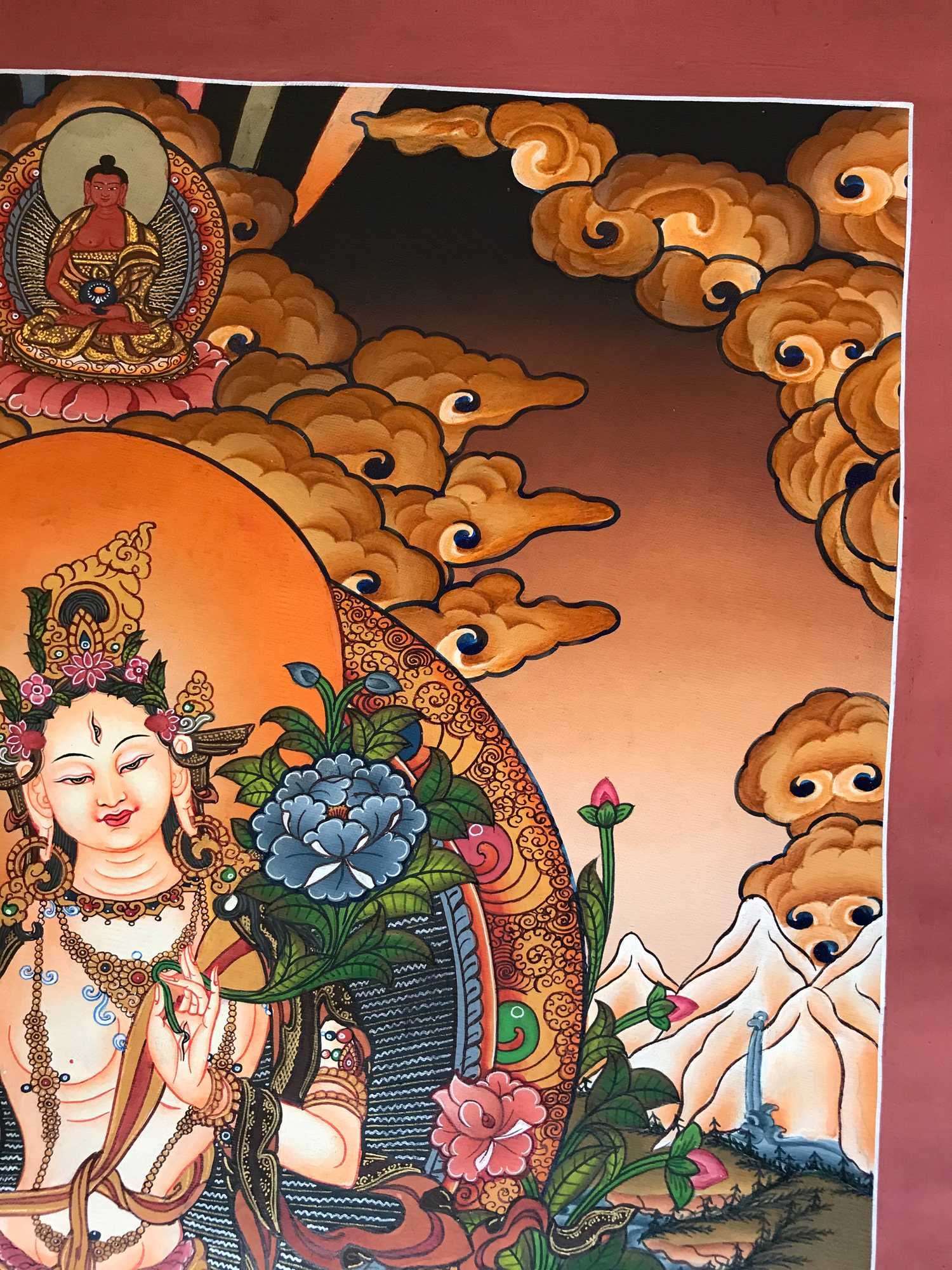 This thangka of White Tara has real gold painted on its surface along with other paints. This is an ancient process of decorating the thangka in Tibetan Buddhism, Here gold is ground into gold dust, which is then mixed with other undisclosed material to make it paintable on the canvas. this mixture is then mixed with transparent glue and painted on the thangka. Read More