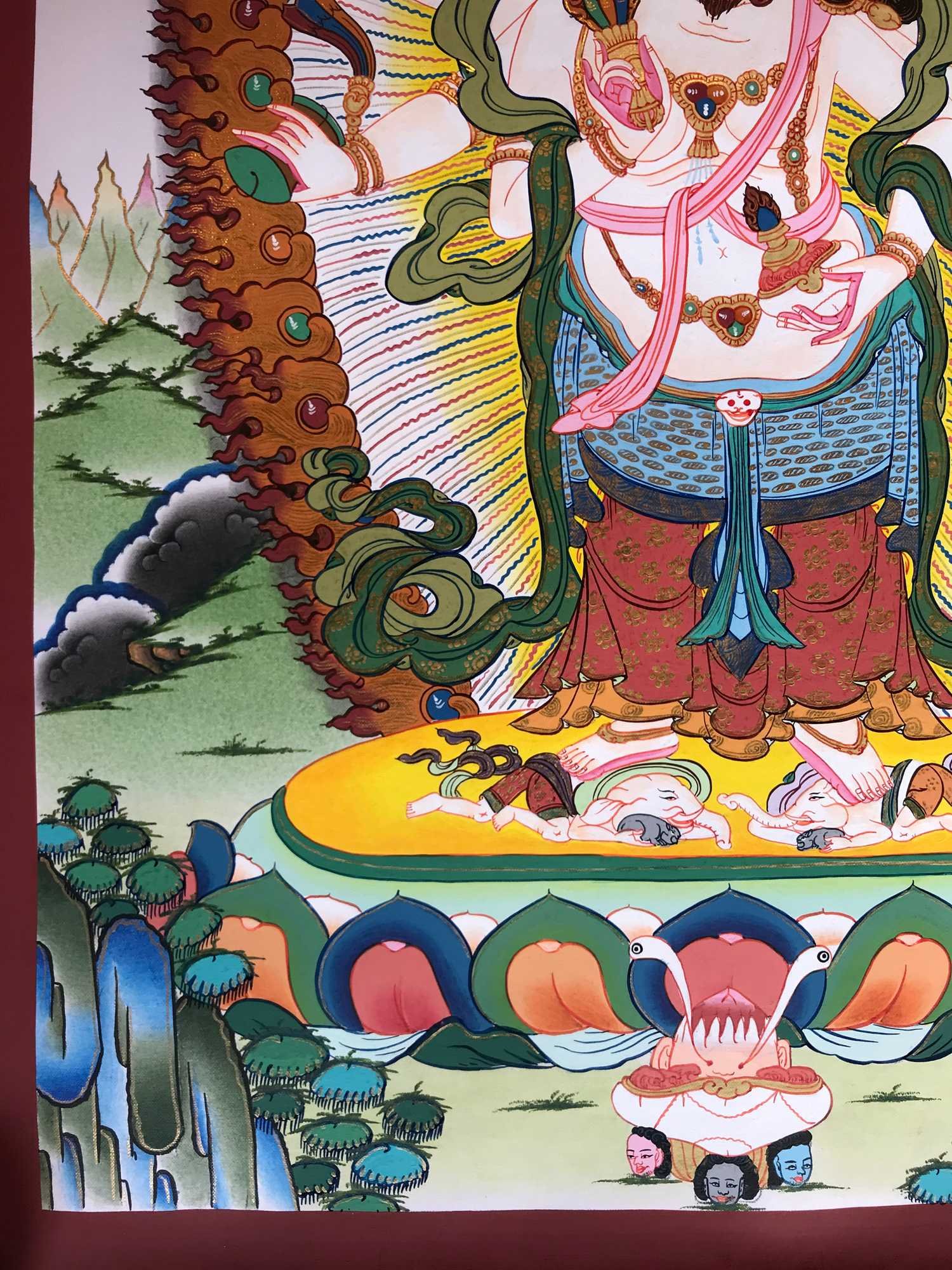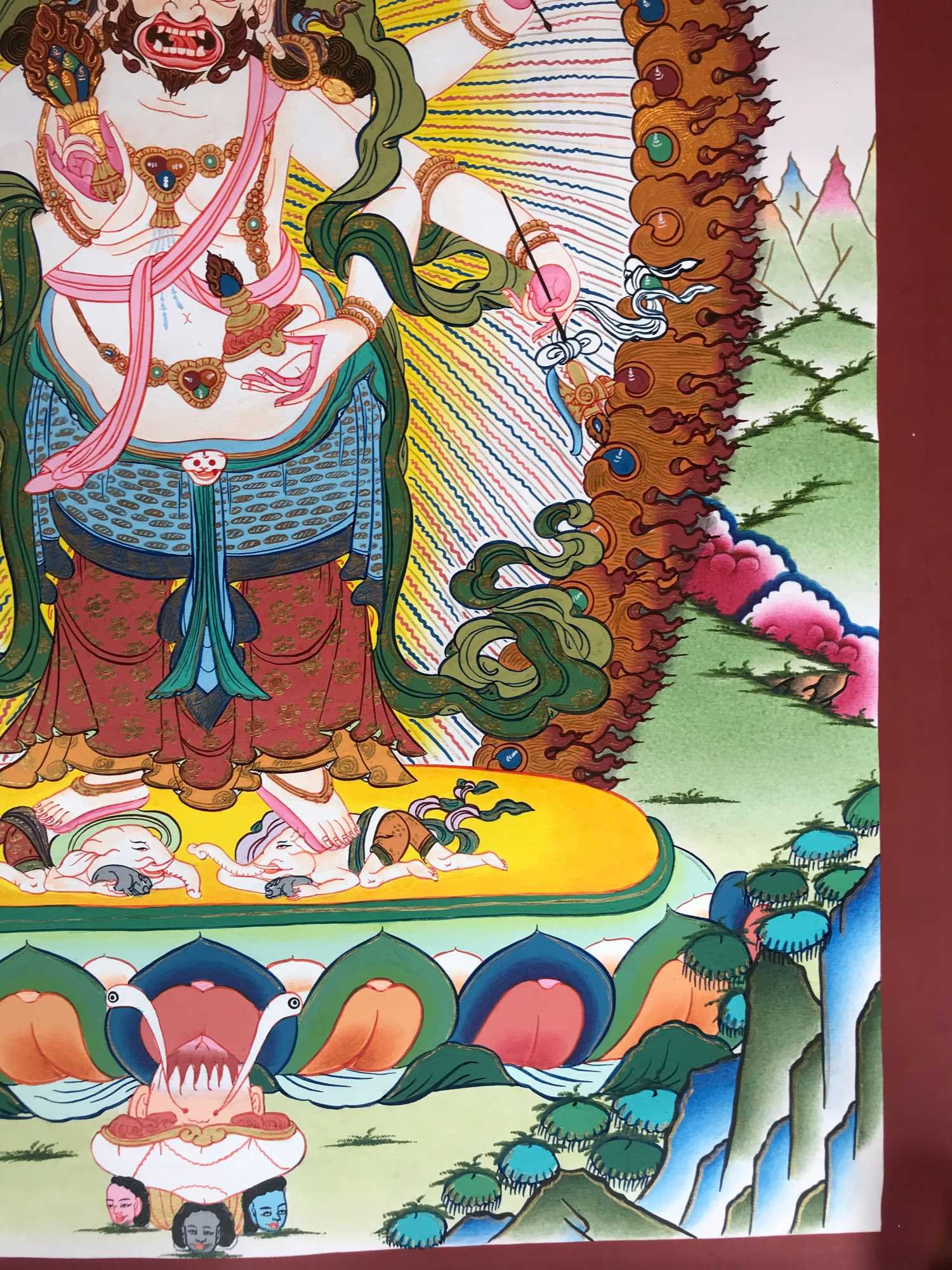 This thangka of White Mahakala has real gold painted on its surface along with other paints. This is an ancient process of decorating the thangka in Tibetan Buddhism, Here gold is ground into gold dust, which is then mixed with other undisclosed material to make it paintable on the canvas. this mixture is then mixed with transparent glue and painted on the thangka. Read More