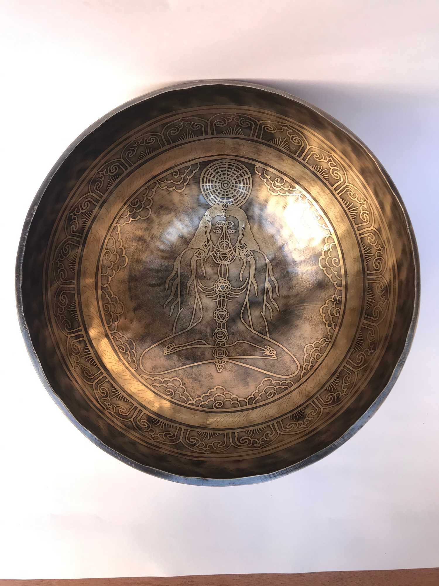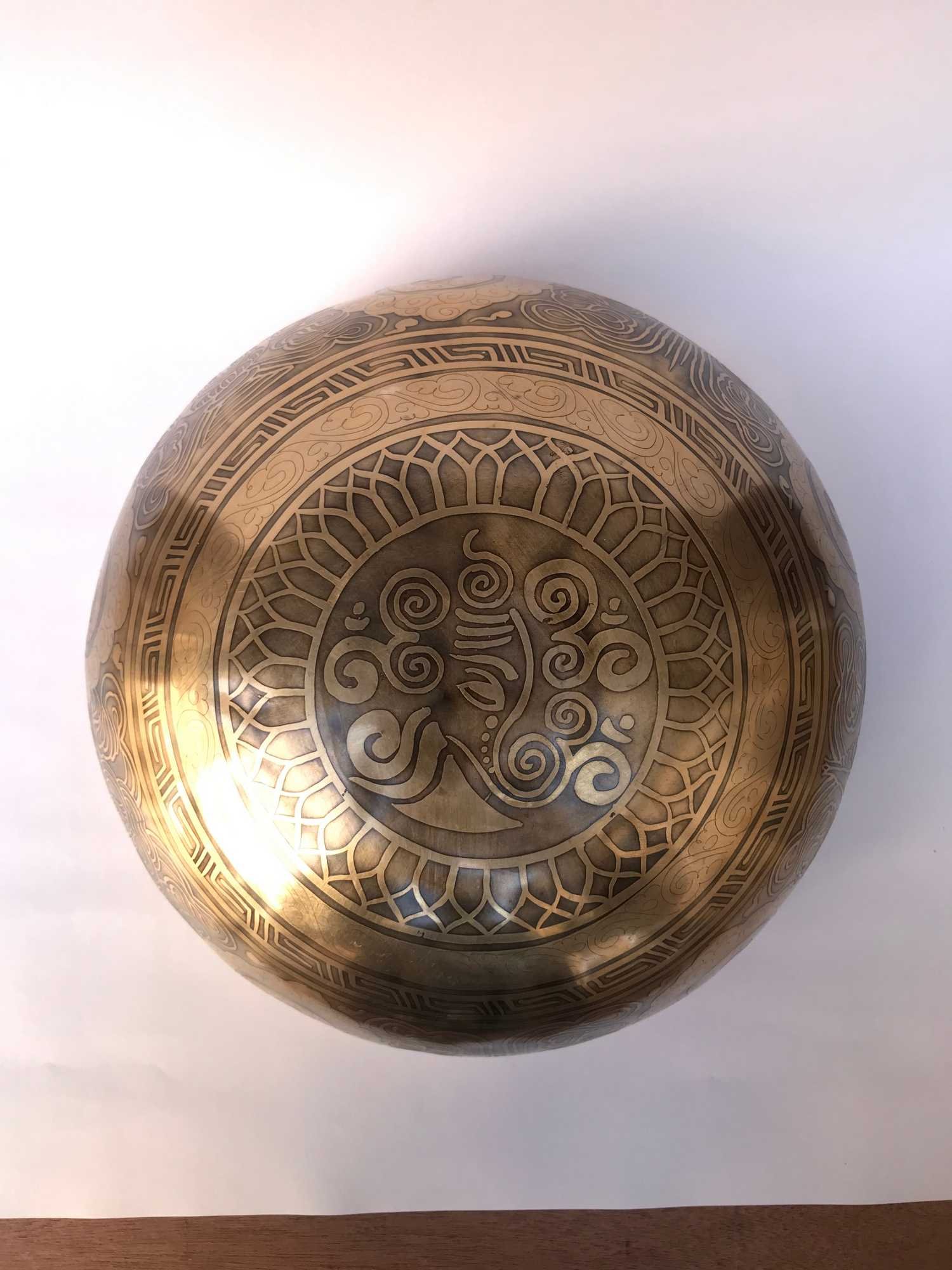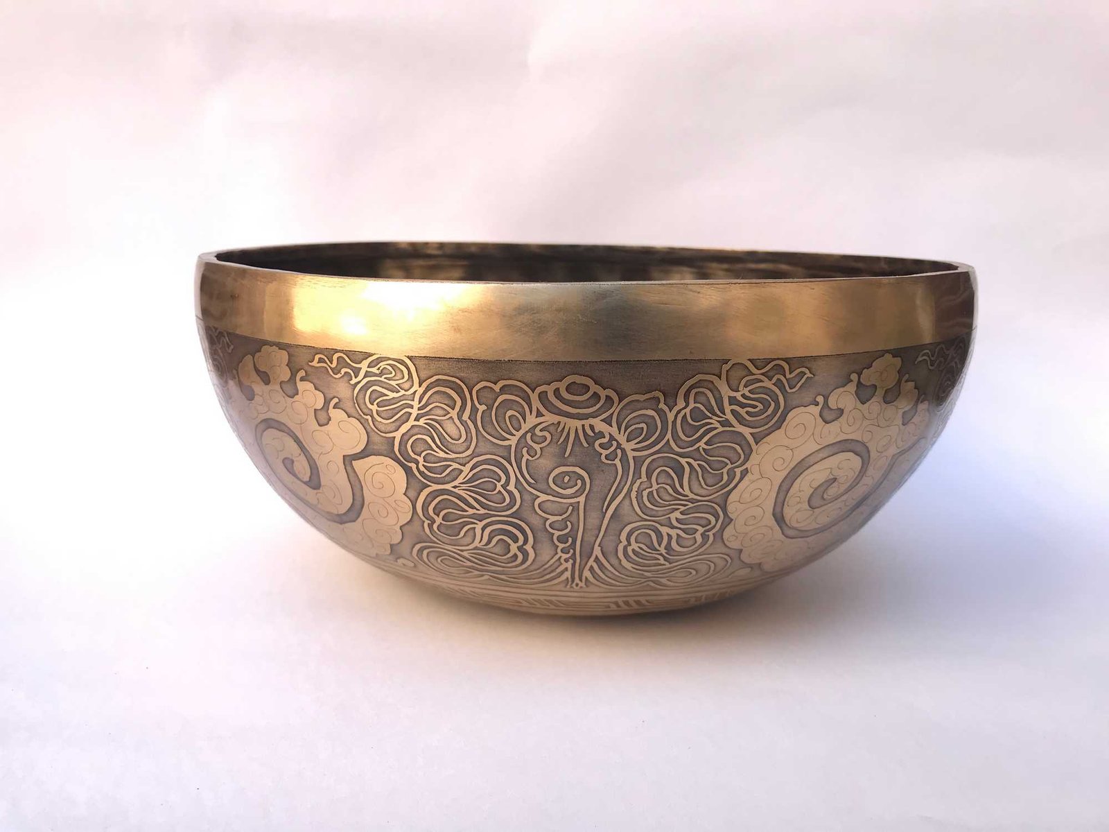 Hand Beaten Bronze Singing Bowl with Etching Carving, Select Accessories , A bowl used for meditation and healing, producing a soothing sound that promotes relaxation and mindfulness