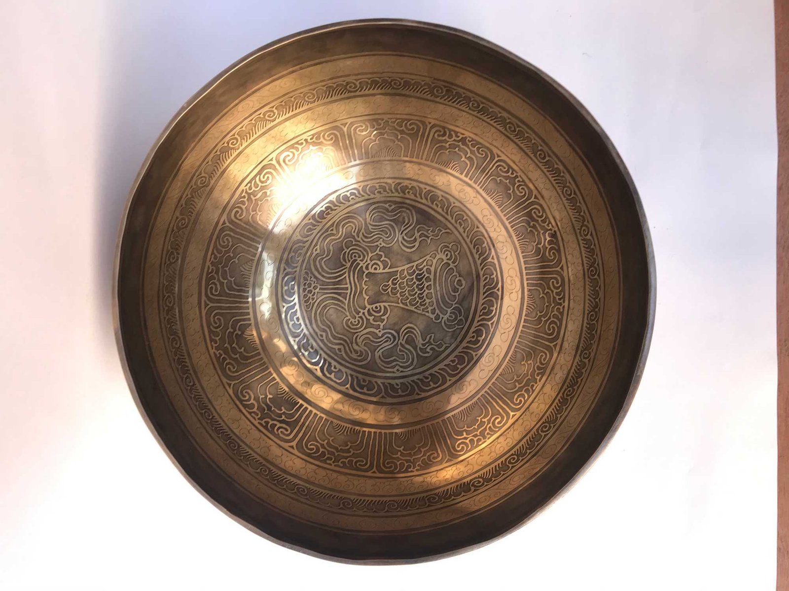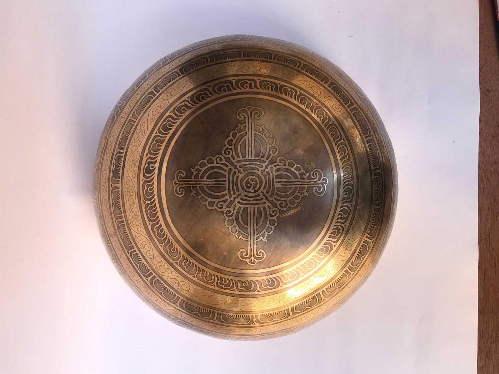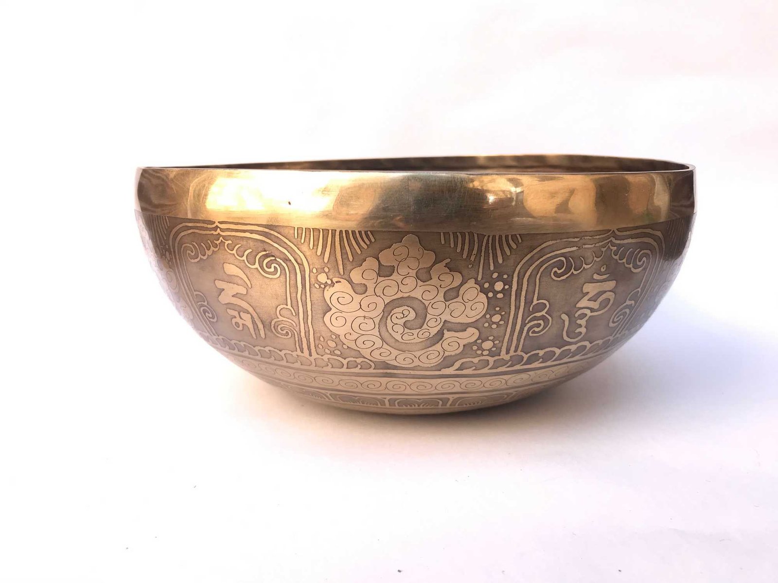 Hand Beaten Bronze Singing Bowl with Etching Carving, Select Accessories , A bowl used for meditation and healing, producing a soothing sound that promotes relaxation and mindfulness