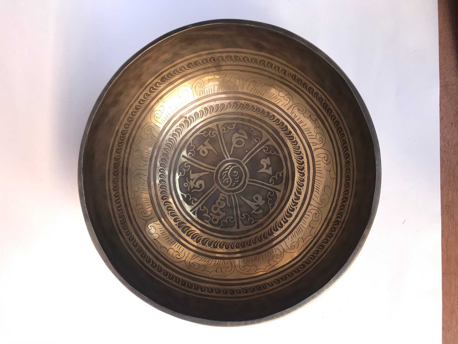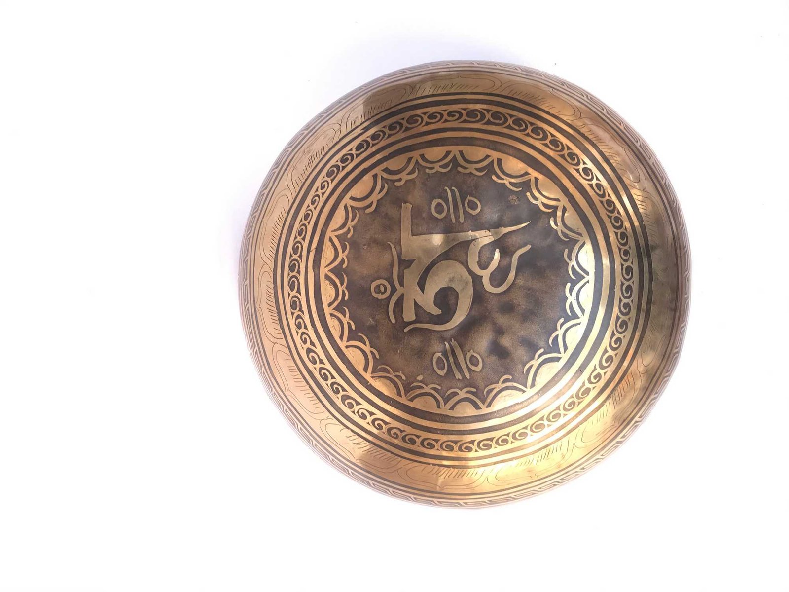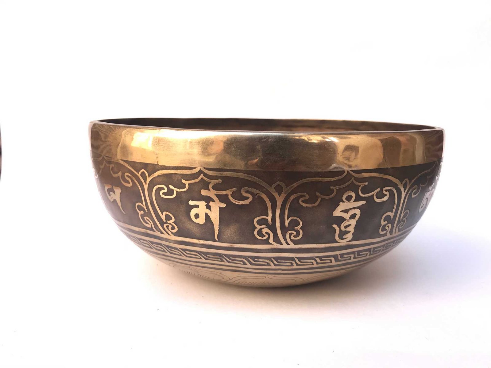 Hand Beaten Bronze Singing Bowl with Etching Carving, Select Accessories , A bowl used for meditation and healing, producing a soothing sound that promotes relaxation and mindfulness