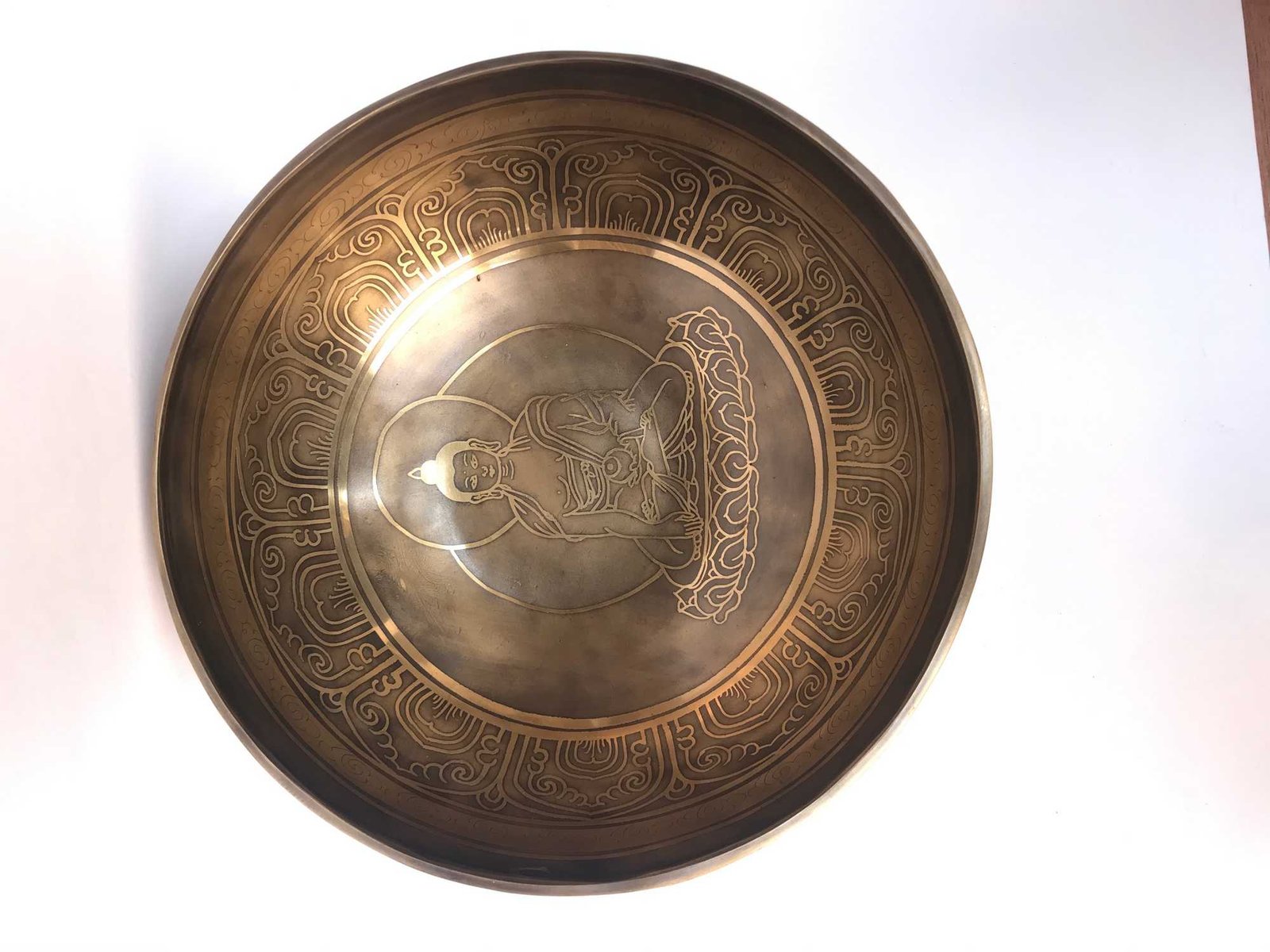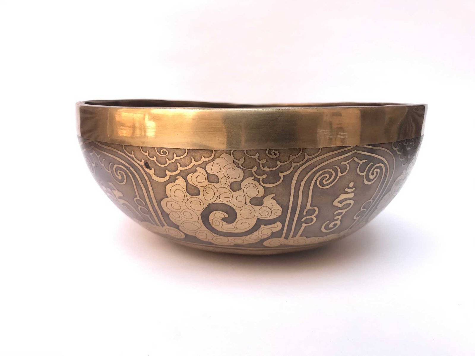 Hand Beaten Bronze Singing Bowl with Etching Carving, Select Accessories , A bowl used for meditation and healing, producing a soothing sound that promotes relaxation and mindfulness
