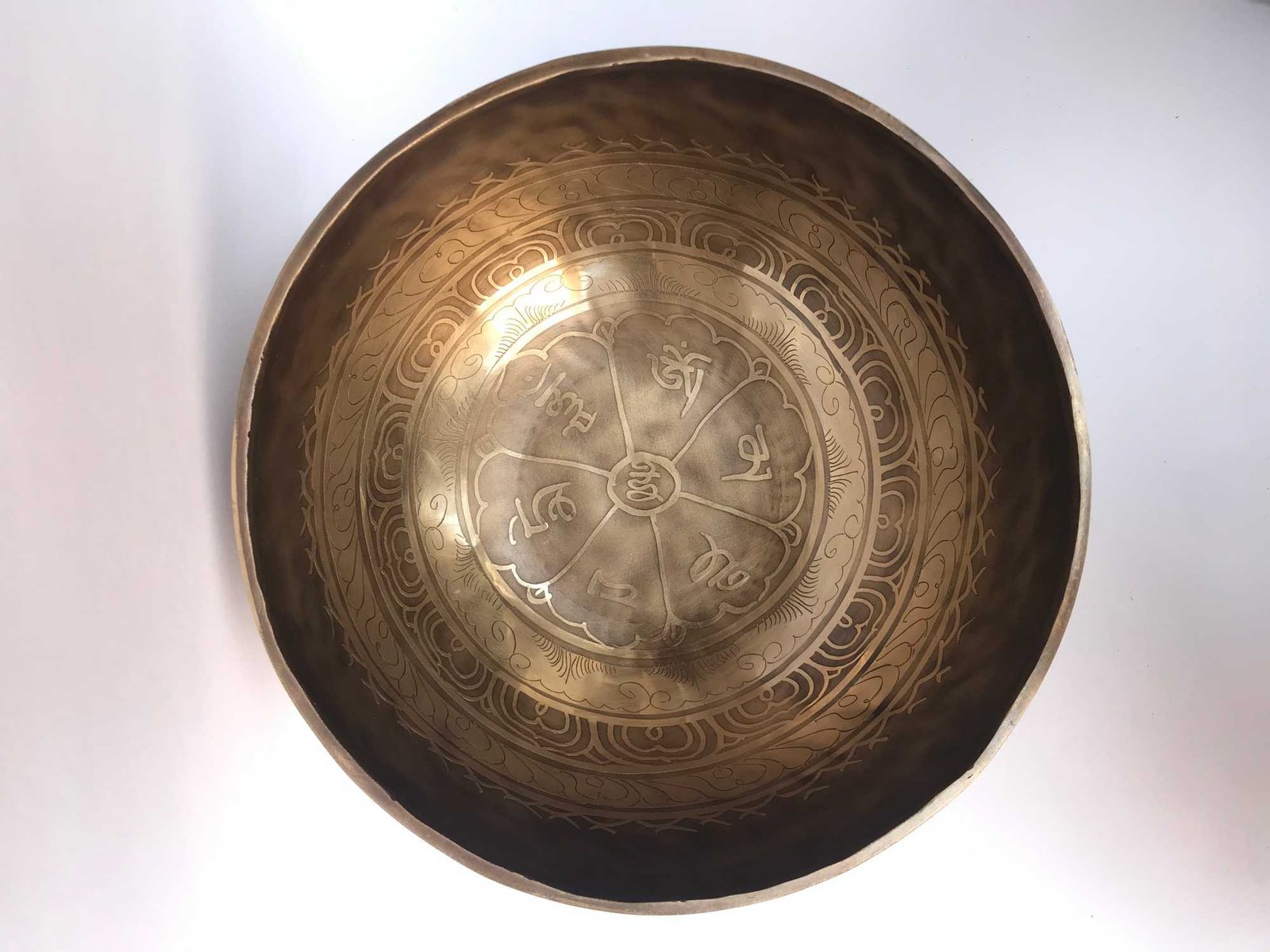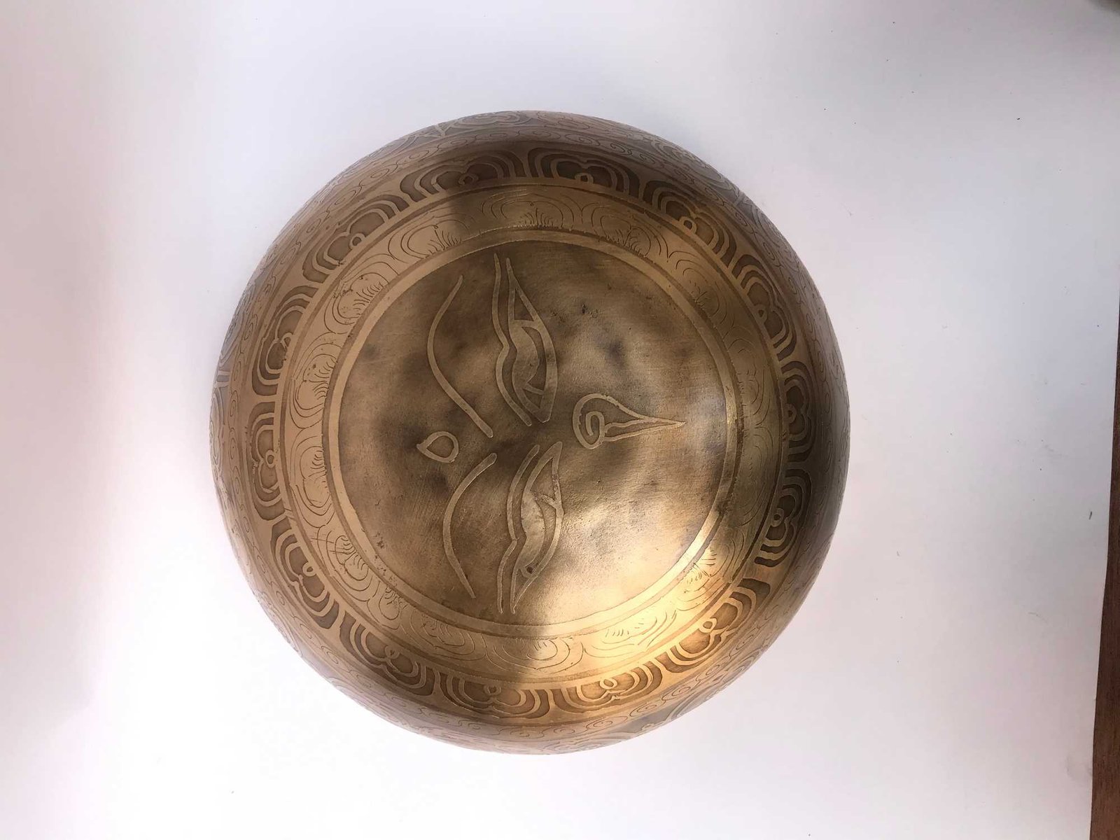 Hand Beaten Bronze Singing Bowl with Etching Carving, Select Accessories , A bowl used for meditation and healing, producing a soothing sound that promotes relaxation and mindfulness