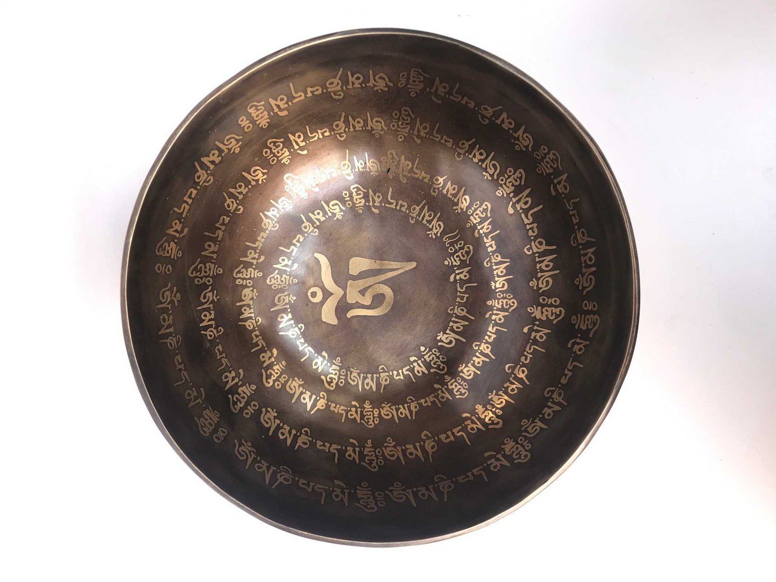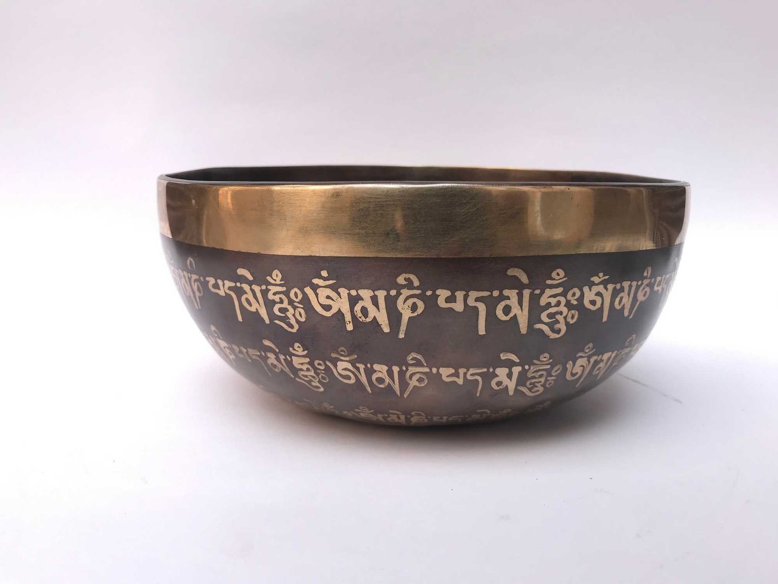 Hand Beaten Bronze Singing Bowl with Etching Carving, Select Accessories , A bowl used for meditation and healing, producing a soothing sound that promotes relaxation and mindfulness
