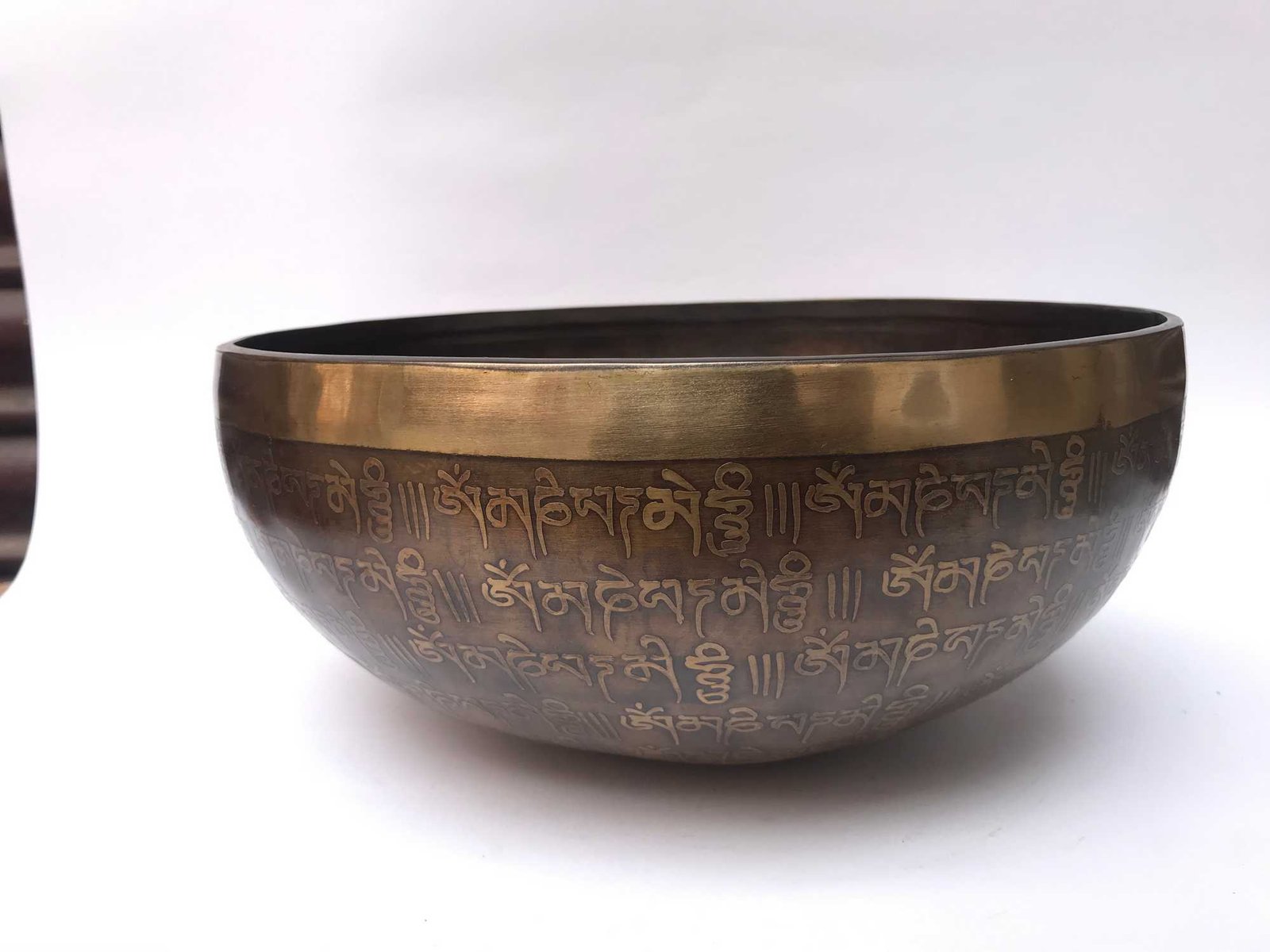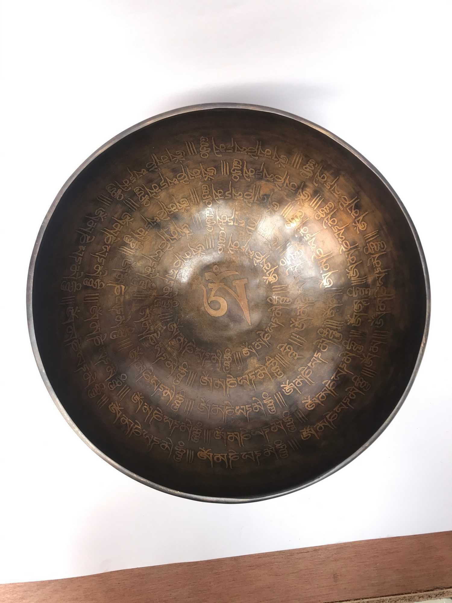 Hand Beaten Bronze Singing Bowl with Om Mani Padme Hum Design, Etching Carving, Select Accessories , A bowl used for meditation and healing, producing a soothing sound that promotes relaxation and mindfulness
