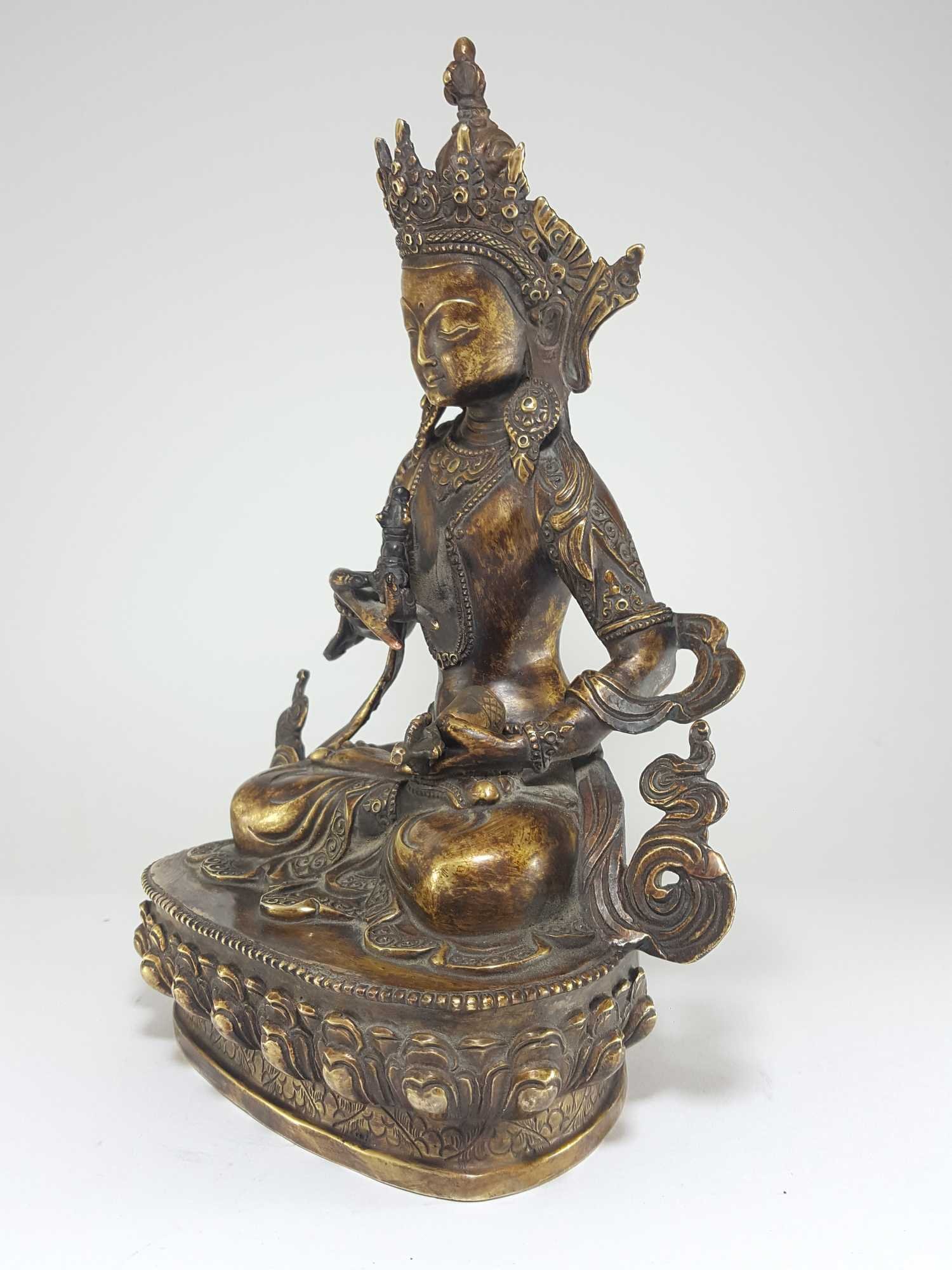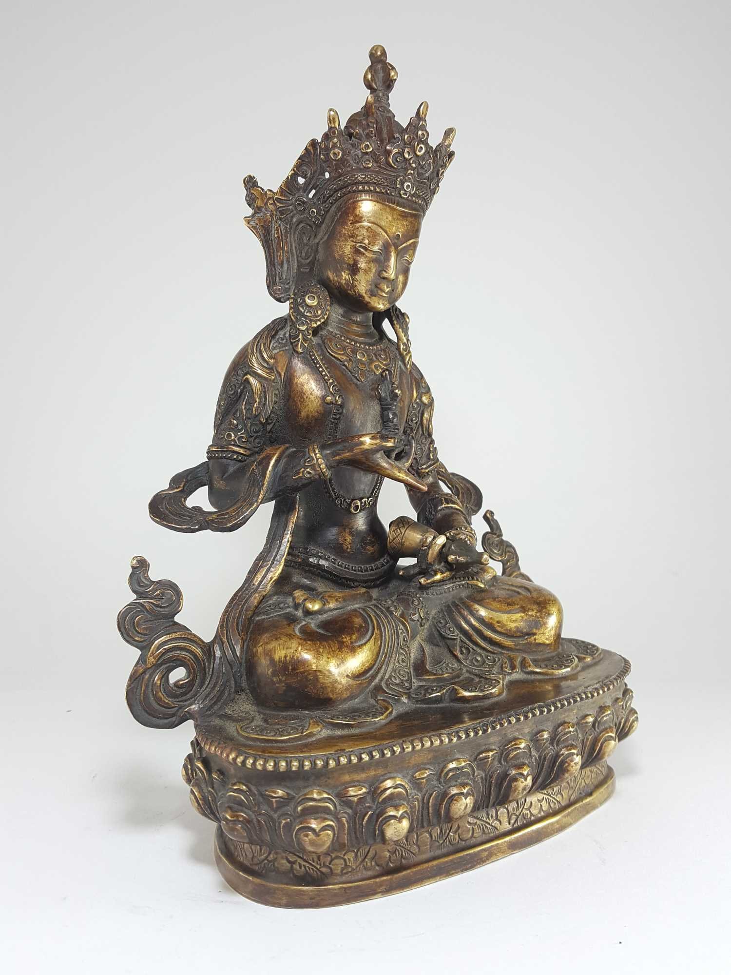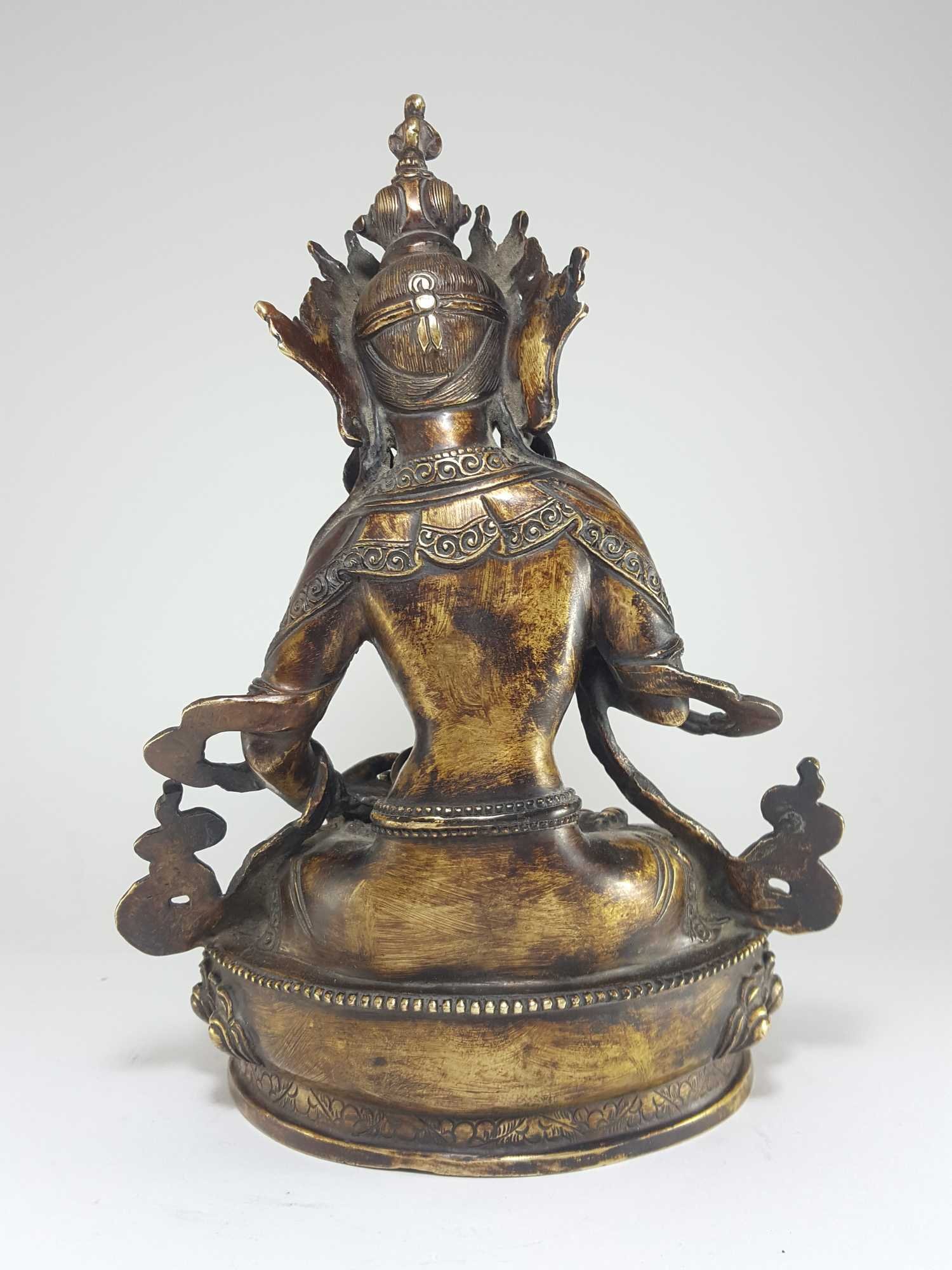 This Vajrasattva product features a stunning Bronze patina finish. Our store takes pride in offering this exclusive patina, which involves a meticulous process utilizing organic materials such as butter and vegetable color. The aim is to recreate the appearance of an aged bronze statue, evoking a sense of timeless elegance.