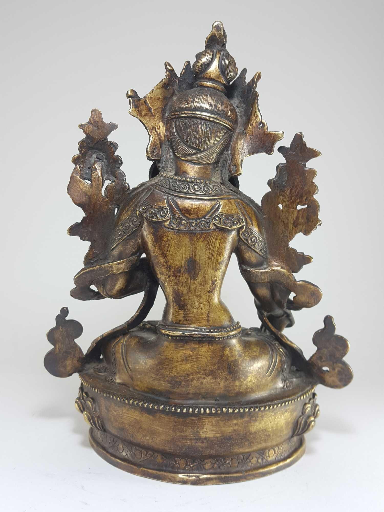 This White Tara product features a stunning Bronze patina finish. Our store takes pride in offering this exclusive patina, which involves a meticulous process utilizing organic materials such as butter and vegetable color. The aim is to recreate the appearance of an aged bronze statue, evoking a sense of timeless elegance.