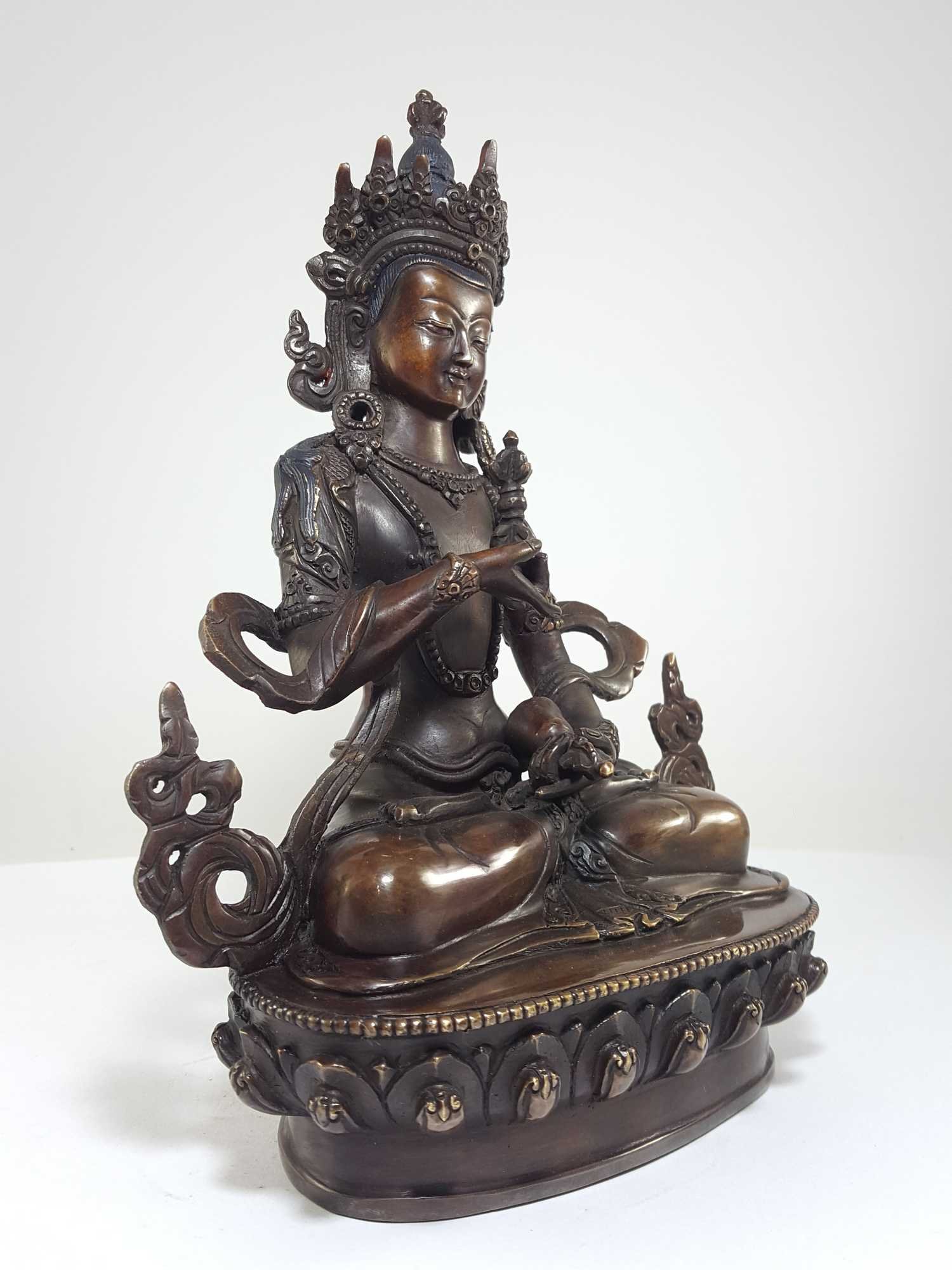 This Vajrasattva has been meticulously treated with a chocolate color antique patina. The intention behind this patina is to replicate the appearance of a copper statue that has gracefully aged over a century. Unlike a simple coat of paint, this patina is not applied superficially and is designed to endure. It undergoes an artificial oxidation process that adds depth and character, while also serving as a protective layer against natural oxidation.