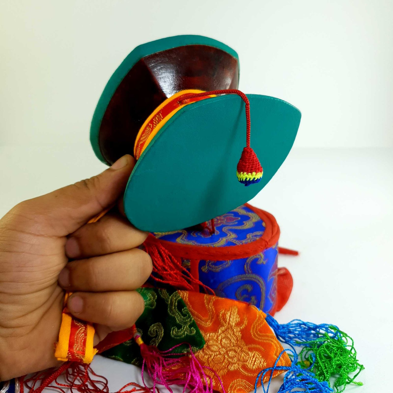 Tibetan Chod Damaru, Small, Wooden and Leather, with Brocade Damaru Drum Cover and Damaru Brocade Tail , symbolizing the sound of creation and the rhythm of the universe