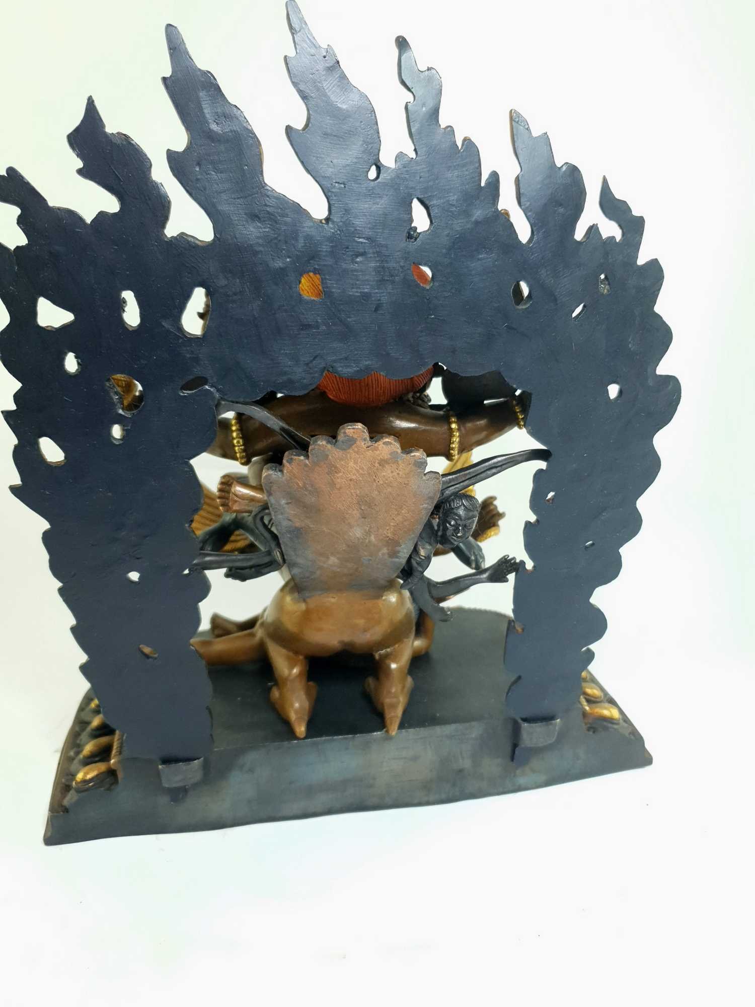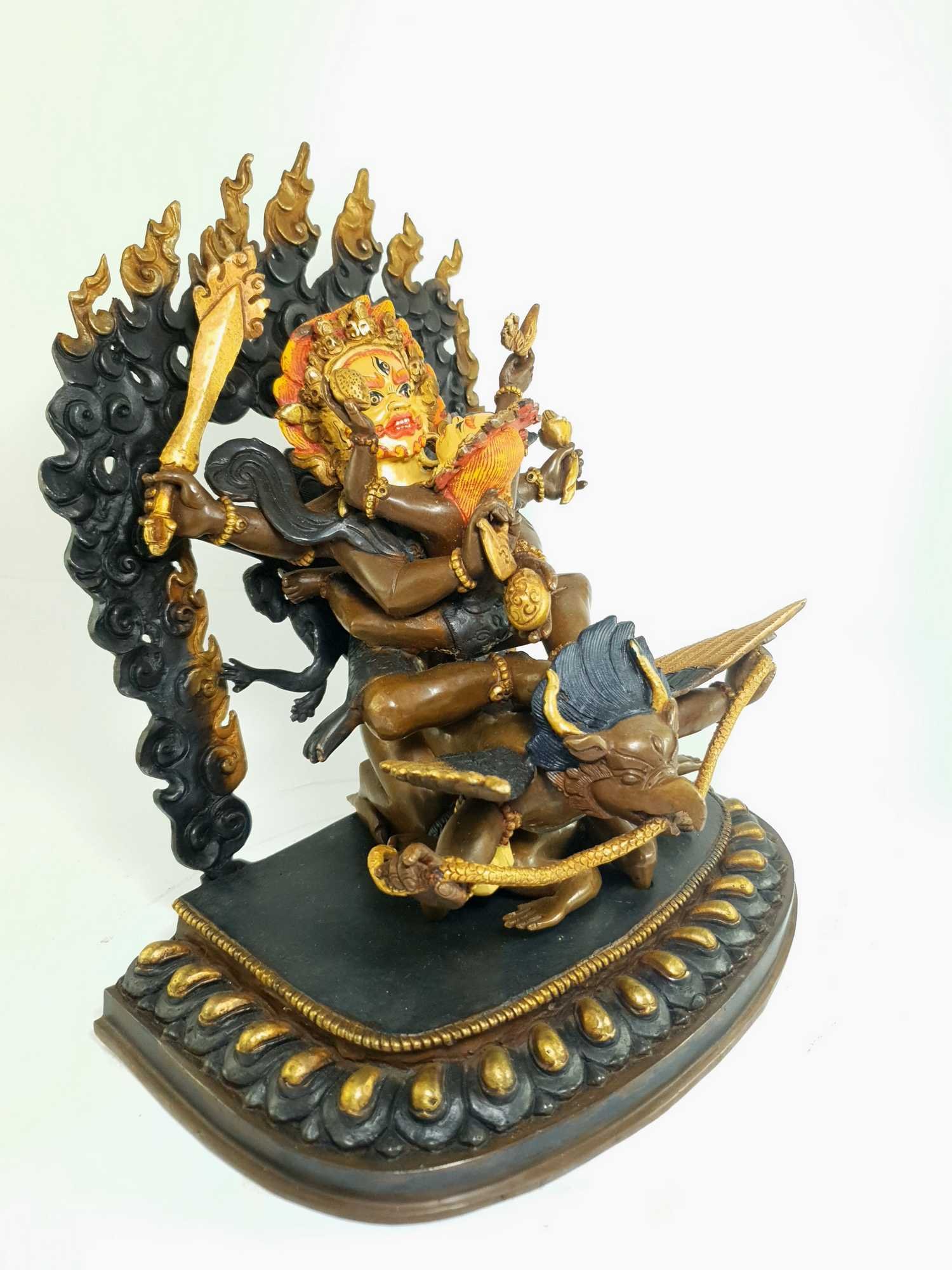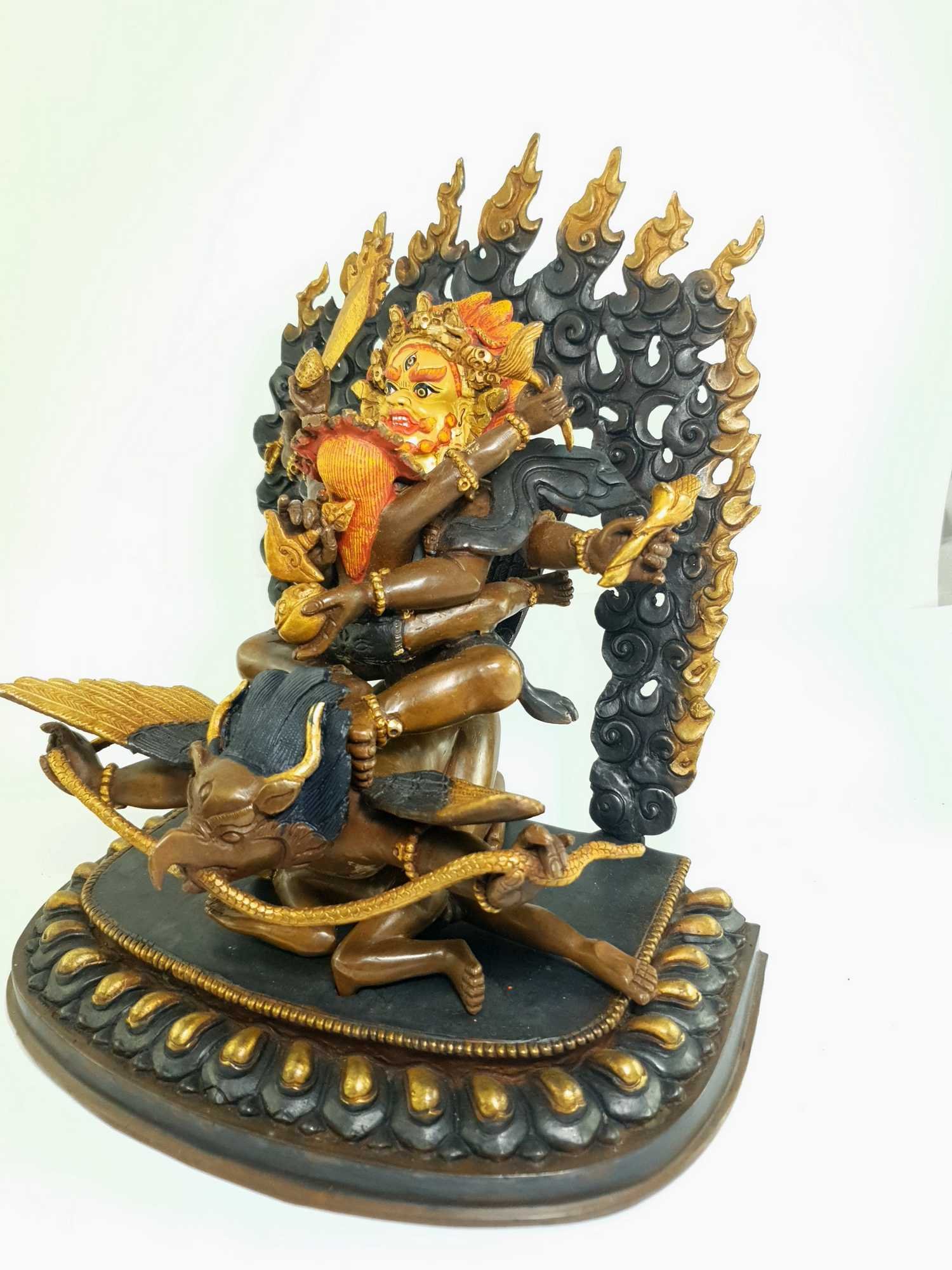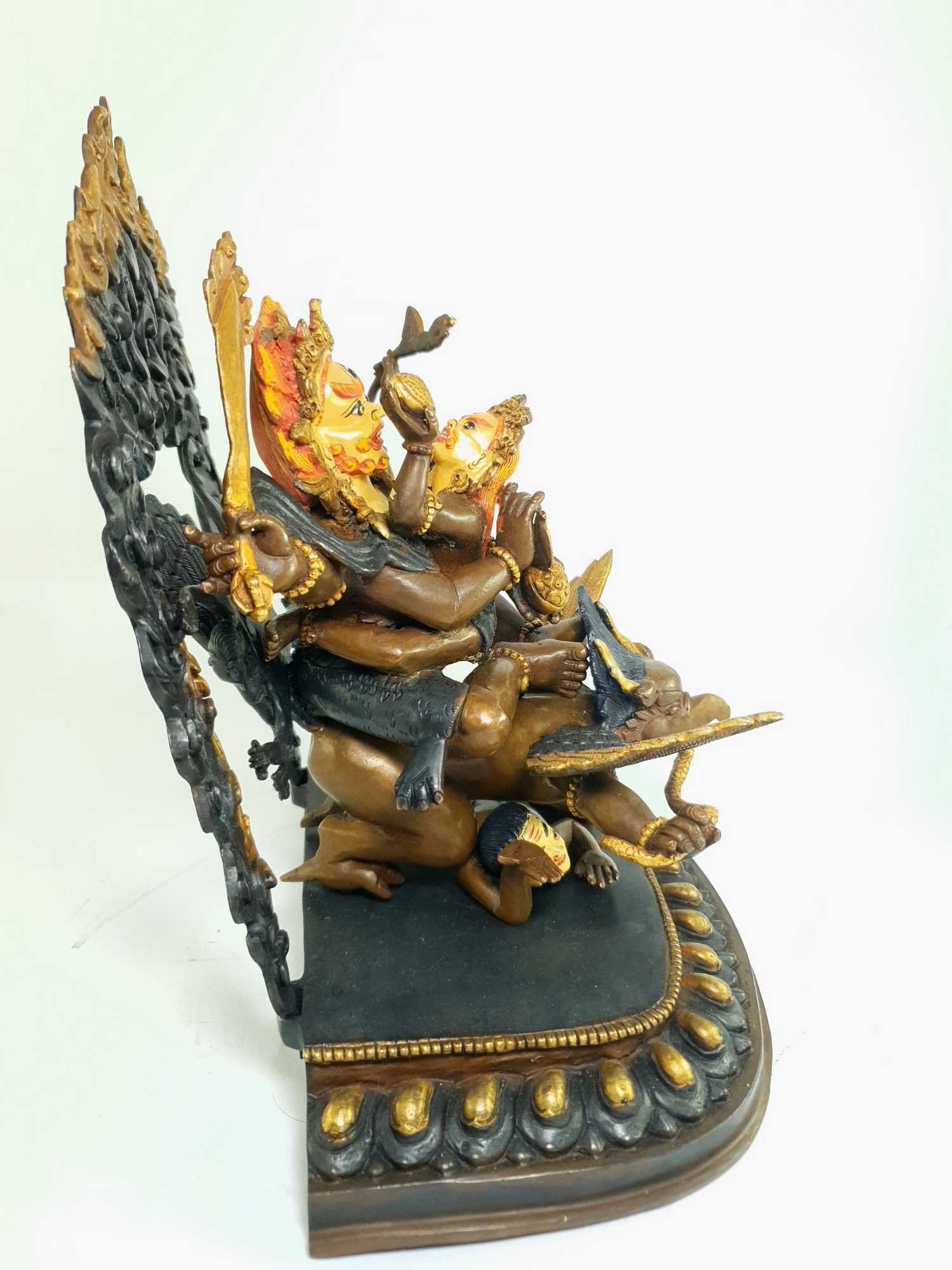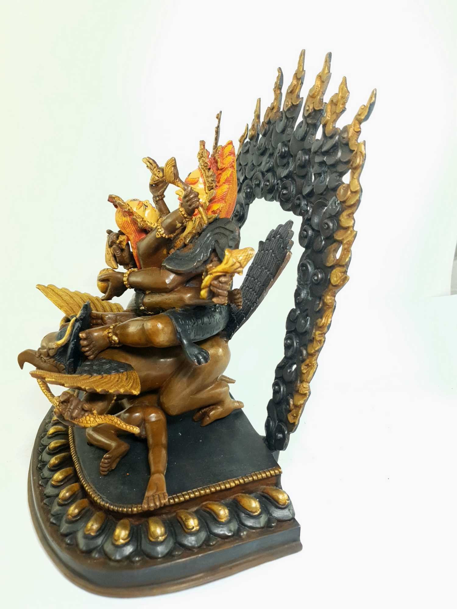 This Marutse has a Partly gold-plated finish. Partly fire gold gilding, a common practice in Nepali handicrafts. This technique is skillfully employed by artisans to create intricate designs on various metal objects, including statues, jewelry, and decorative items. Through a process, a mask or resist is applied to safeguard specific areas from the gold plating. The object is then subjected to high temperatures, allowing the gold to beautifully adhere to exposed surfaces using a combination of heat and pressure.
