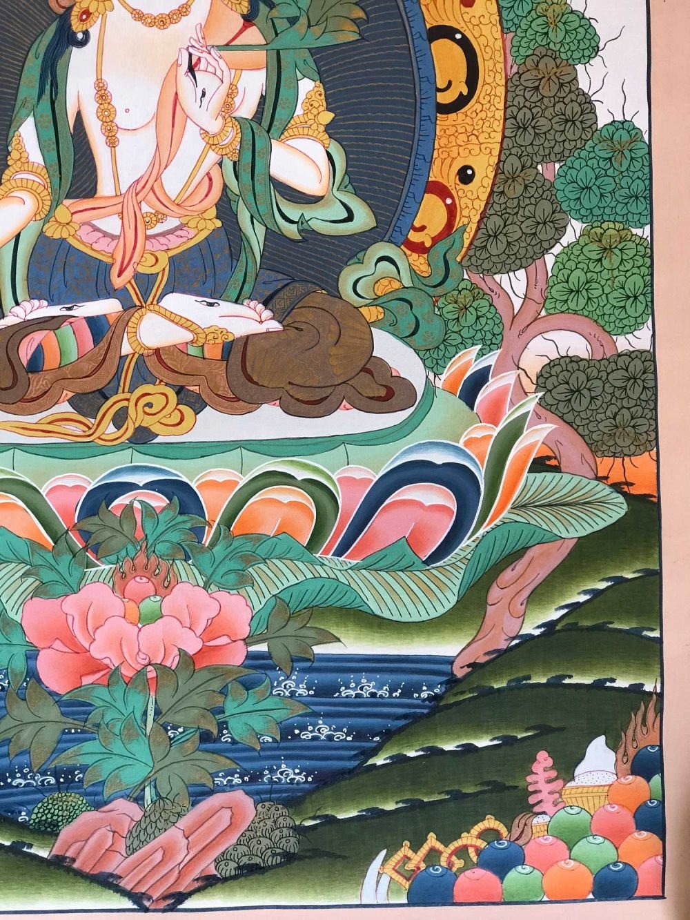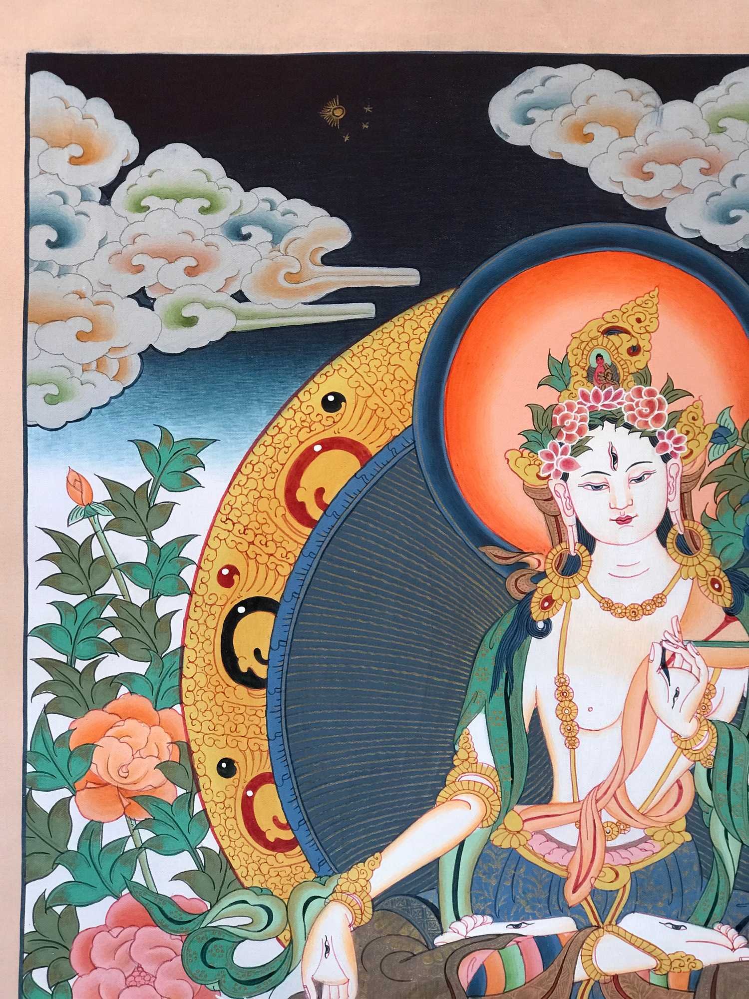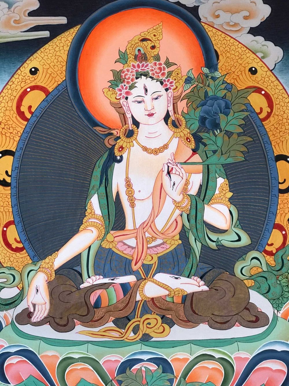 Her left hand is gracefully lowered in an empty open palm boon granting gesture [Skt. Varada Mudra]. White Tara has a blooming pink lotus & an unopened bud on either side of her body. The lotus in the painting is stylised as a peony & a chrysanthemum to provide artistic contrast with her lotus throne. The open blossom represents the present and the bud represents the future situations & Buddhas yet to be born. The future also refers to beneficial changes circumstances that she will help bring about. Her right hand wisdom hand is in the gesture of giving refuge [Skt. Sharanagamana]. The word refuge refers to the teaching of compassionate understanding which she imparts. The third finger touches the thumb to create a circle representing the union of wisdom and compassion, and the three extended fingers symbolise the Three Jewels of Buddhism A. The Buddha State B. The Body of teachings [Skt. Sangha] C. The Principles of the Universal form [Skt. Dharma]. The same hand holds the stem of a blue lotus [Skt. Utpala] representing change. The lower part of the stem below the bend represents the root of the lotus in the mud. The allegory of the Lotus refers to the something that grows from the obscurity of the mud & which eventually bursts open in the light. The lotus journey is one of inner awakening & enlightenment analogous to the human spirit. Buddhism shows us how to grow towards the light with profound teachings which help us to navigate away from burdens and sufferings which we may have by being materially minded, bitter & confused.