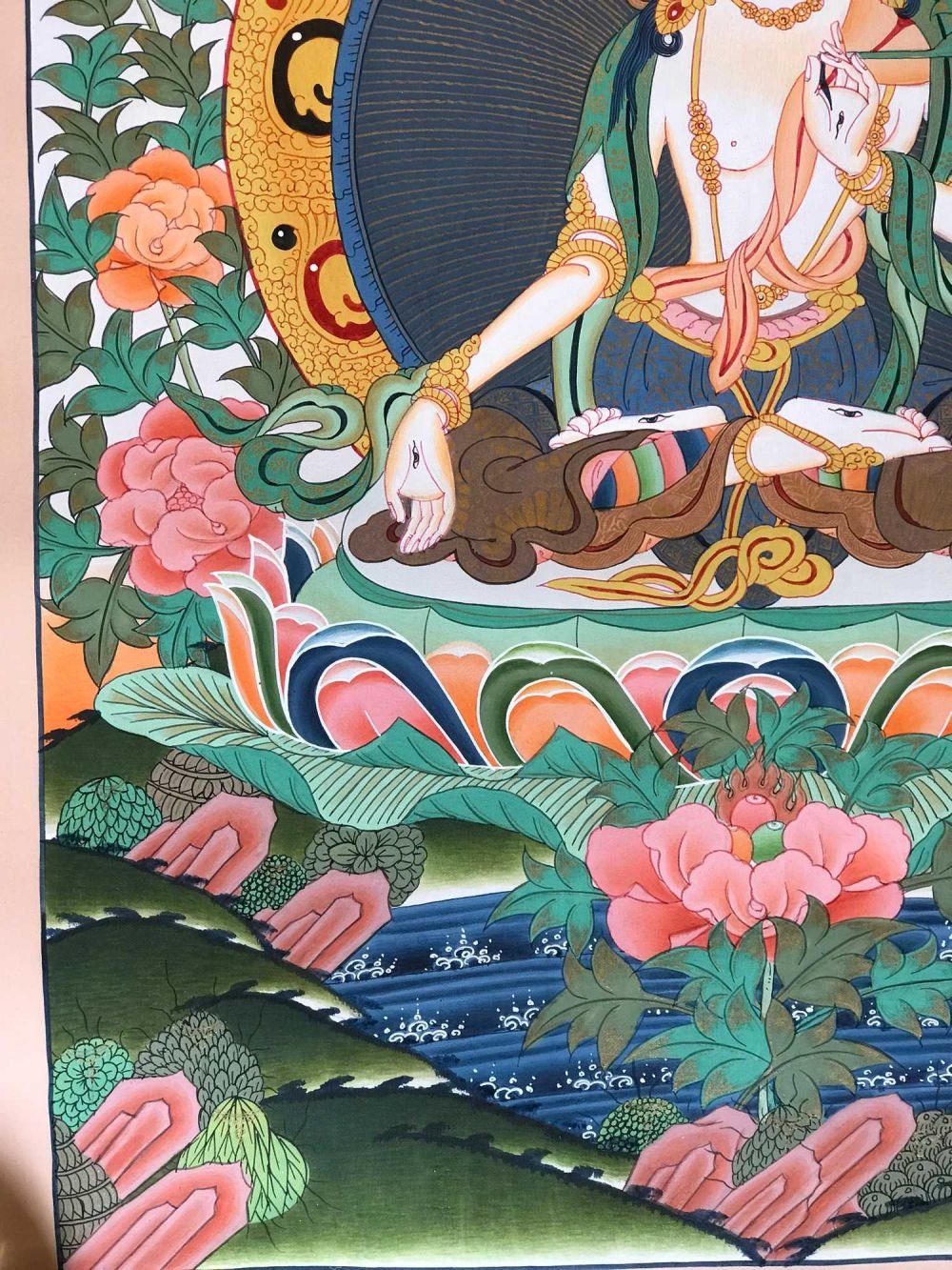 This thangka of White Tara has real gold painted on its surface along with other paints. This is an ancient process of decorating the thangka in Tibetan Buddhism, Here gold is ground into gold dust, which is then mixed with other undisclosed material to make it paintable on the canvas. this mixture is then mixed with transparent glue and painted on the thangka. Read More