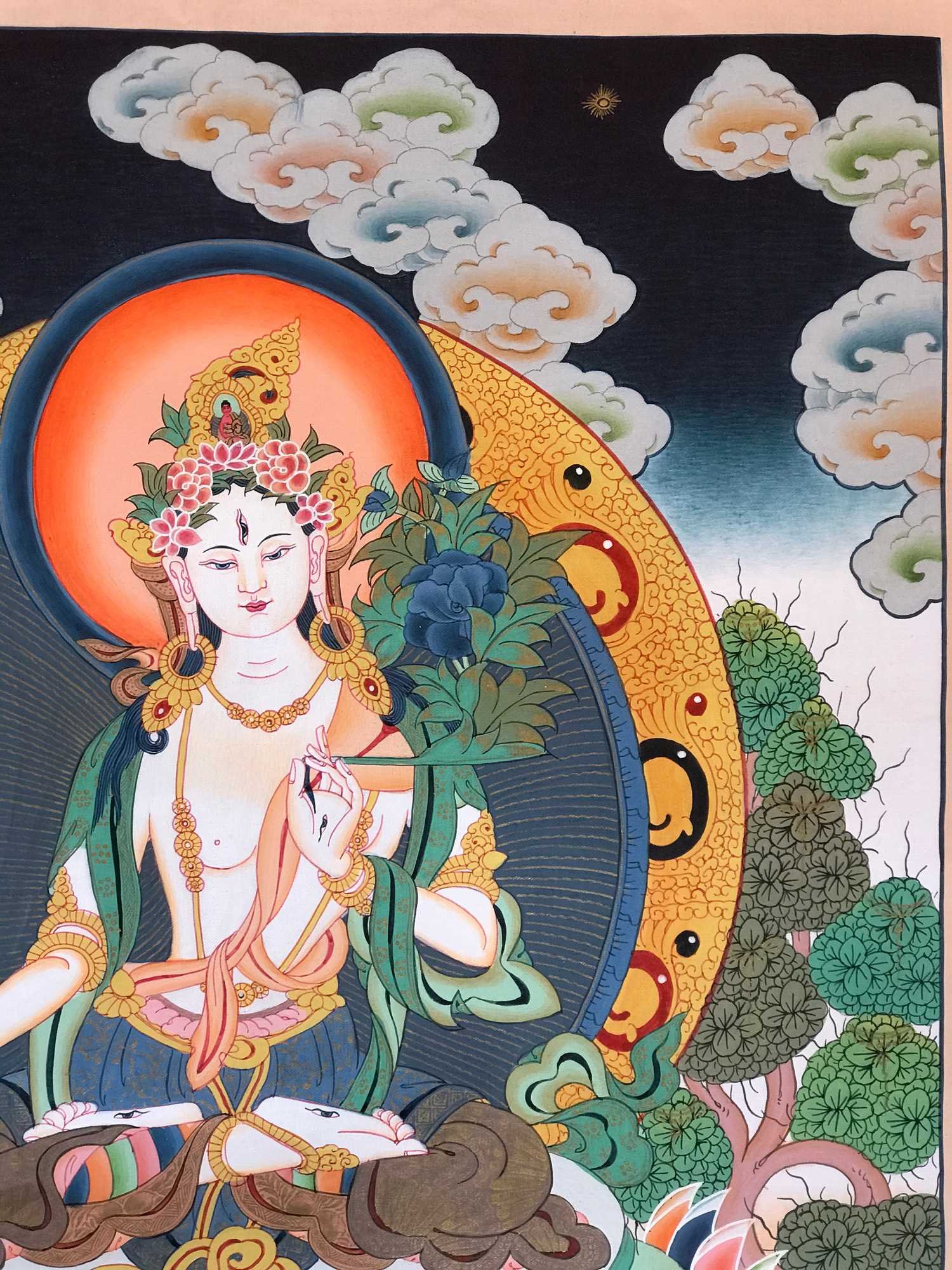 There is a lotus on her diadem bearing the Wish Granting Gem [Skt. Chintamani] surrounded by an aureole of fire symbolising auspicious blessings. The extra eye on her forehead, on the palms of her hands & soles of her feet represent her ability to see and understand the sufferings of all beings & her omniscient compassion toward the suffering. Avalokiteshvara [Tib. Chengresi] her progenitor also has a white body & extra eyes. The eyes denote psychic & supernatural power. The rainbow coloured leggings represent a mastery of Boddhi Nature [Skt. Siddhi] & a manifestation of the Sambhogakaya. The dark blue layer of clothing signifies Mantrayana practice. She is upon a white moon disk & has an orange sun aureole to representing her emanation their melting point [Skt. Nada]. There is a branch of an Ashoka Tree in the foreground. The word Ashoka means 'without sorrow' in other words she has no regrets about her behaviour. The tree linked to the Vedic God of love & sexual union Kamadeva which blossoms when a virtuous lady touches it. The triangular diamond rock formation in the foreground represents the Source of Reality [Skt. Dharmadaya] out of which deities arise & which is generated from emptiness by the seed syllable E. In the Indian language is a Triangular shaped letter D & so expressed in the triangular rock formations.