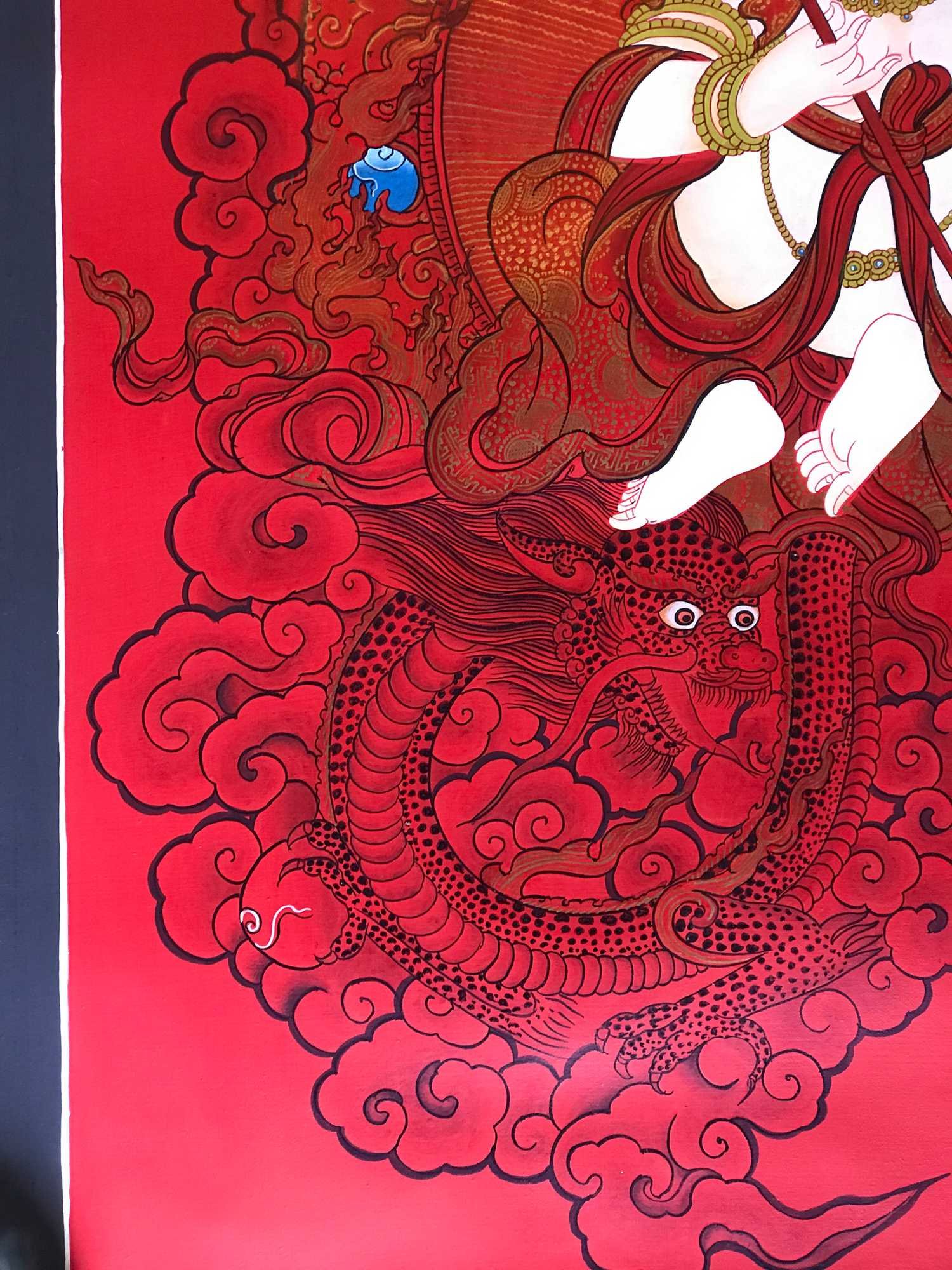 Tibetan Thangka of White Jambal, Red , Wealth deity, granting prosperity and financial stability