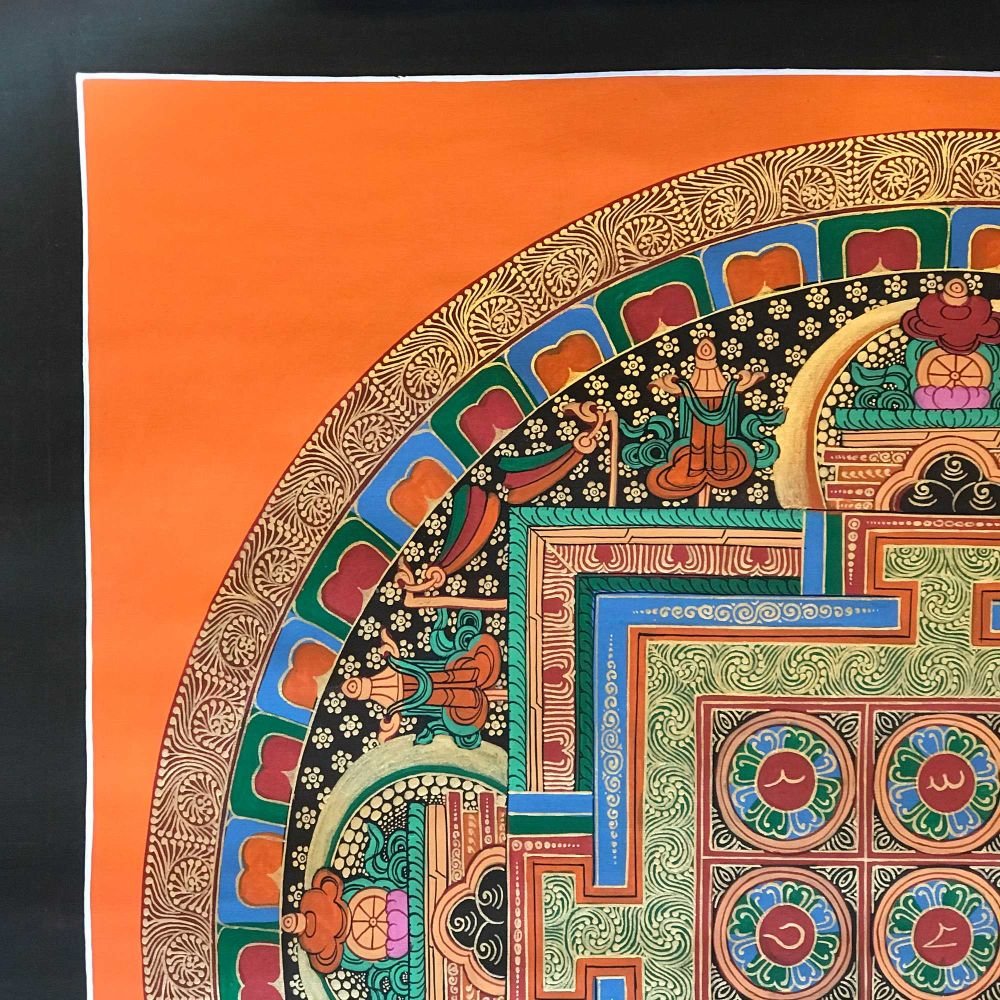 OM MANI PADME HUM is also inscribed in Mandala paintings. Those kinds of mandala have OM MANI PADME HUM in a circular fashion, and mantras are painted in concentric circles from the surface to the center of the circle. They come under the categories of the Mantra Mandala. These mandalas are usually found hanging on the walls of Buddhist monasteries and are often used in meditation halls for focus and concentration purposes.