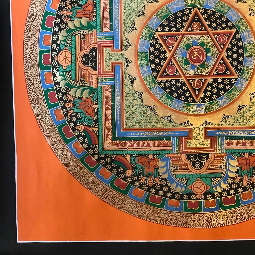 OM MANI PADME HUM is also inscribed in Mandala paintings. Those kinds of mandala have OM MANI PADME HUM in a circular fashion, and mantras are painted in concentric circles from the surface to the center of the circle. They come under the categories of the Mantra Mandala. These mandalas are usually found hanging on the walls of Buddhist monasteries and are often used in meditation halls for focus and concentration purposes.