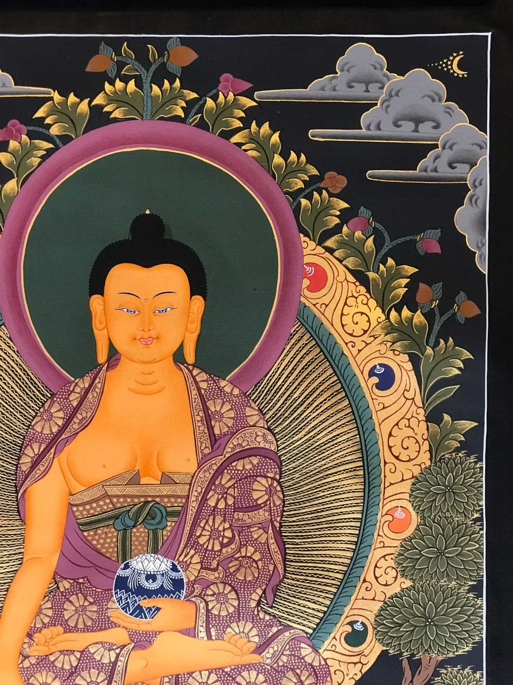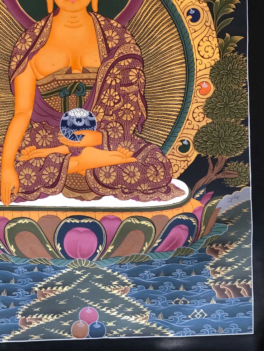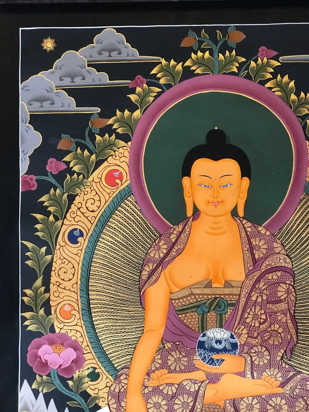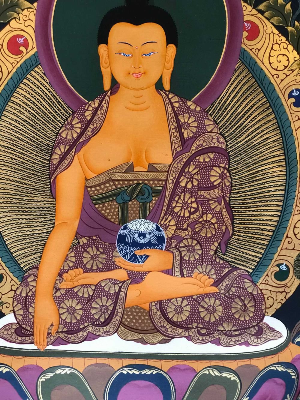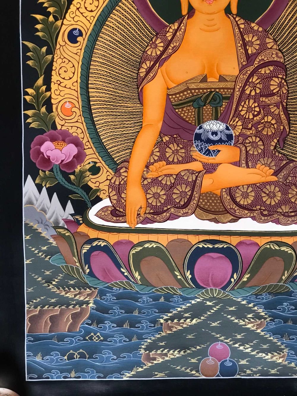 Gautama is painted with golden skin sitting in a lotus seat [Skt. Padmasana] also called the meditative seat [Skt. Dhyanasana] & upon a white moon disc which represents the male principle of method which itself is upon a lotus throne. His left hand touches the ground in what is called bhumisparse mudra which symbolises his own recognition of enlightened mind in one of the most iconic images in all Buddhism. The palm always faces inwards. His feet are deliberately drawn level with one another & enlarged, being specific marks of a Buddha. His right hand supports an alms bowl [Skt. Patra], containing the liquid elixir of eternal life. Somehow the simple image of the bowl reflects his overwhelming humility & kindness. He wears the traditionally maroon gold monk's patched robe [Skt. Samghati] made of twenty five pieces of cloth which the first Buddhist monks sewed together. The Buddha has a green nimbus and blue aureole around his body signifying the highest level of understanding. Siddhartha is surrounded by Pink Lotuses [Skt. Padma]. This kind of lotus is connected with loving kindness & a flowering of pure consciousness. The closed bud to his right side represents the past or originating mind, the blooming flower represents the present & the buds represents the future Buddha Maitreya and forthcoming realisations. His elongated earlobes depict his royal connection; his knotted black hair & topknot symbolise his abandonment of worldly possessions; the dot [Skt. Urna] on his brow on the command chakra [Skt. Ajna] represents his transcendent wisdom, the 31st mark of a Buddha.