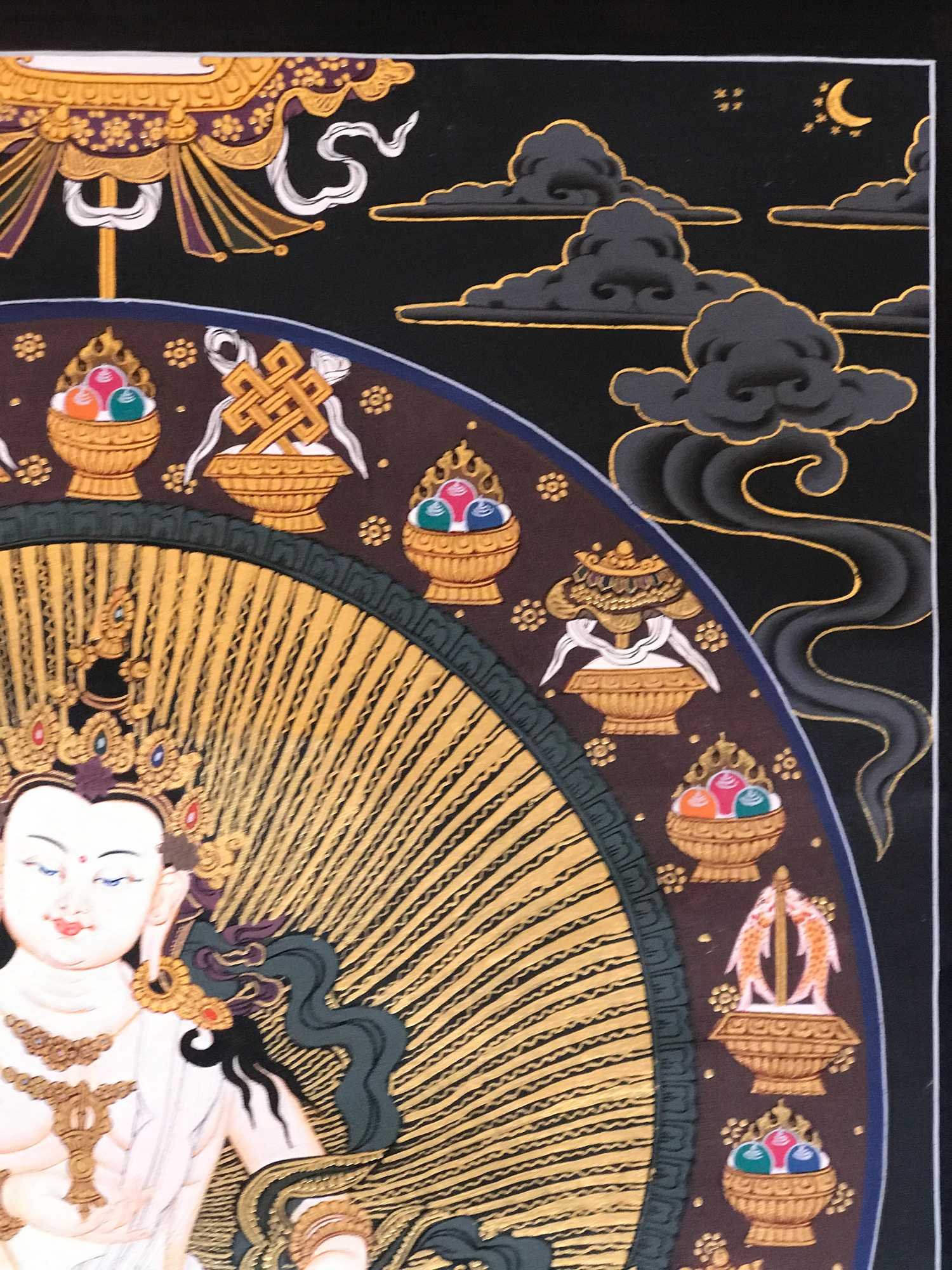 A thangka, also known as tangka, thanka, or tanka, is a vibrant and intricate Tibetan Buddhist painting that serves as a visual representation of spiritual teachings. Crafted with meticulous detail on cotton or silk appliqué, thangkas depict a wide range of subjects including Buddhist deities, sacred scenes, mandalas, and narrative stories. These sacred artworks are traditionally kept unframed and rolled up for storage, resembling ancient scrolls. To protect their delicate nature, thangkas are mounted on textile backings and often adorned with a silk cover on the front. Proper preservation in dry environments is crucial to maintain the integrity and longevity of the silk. Read More