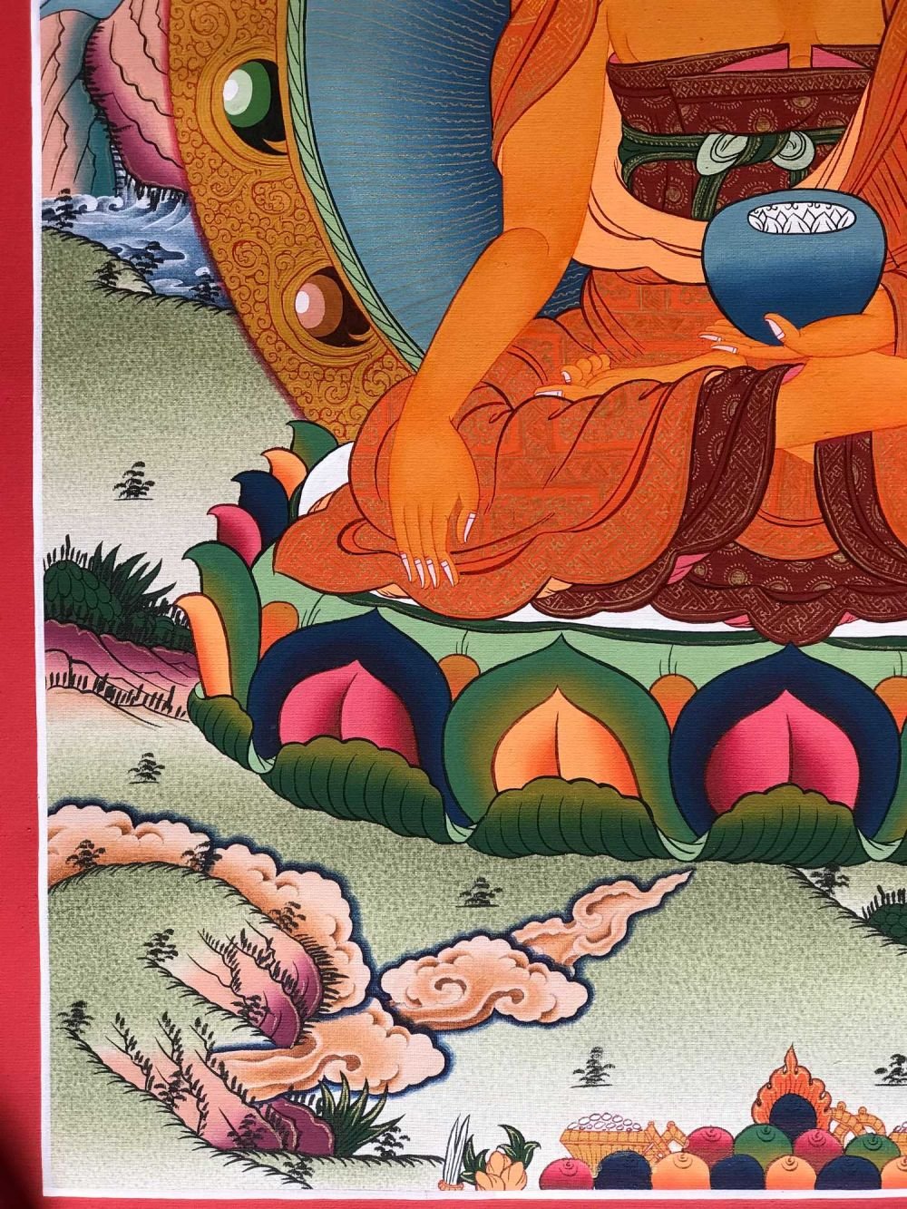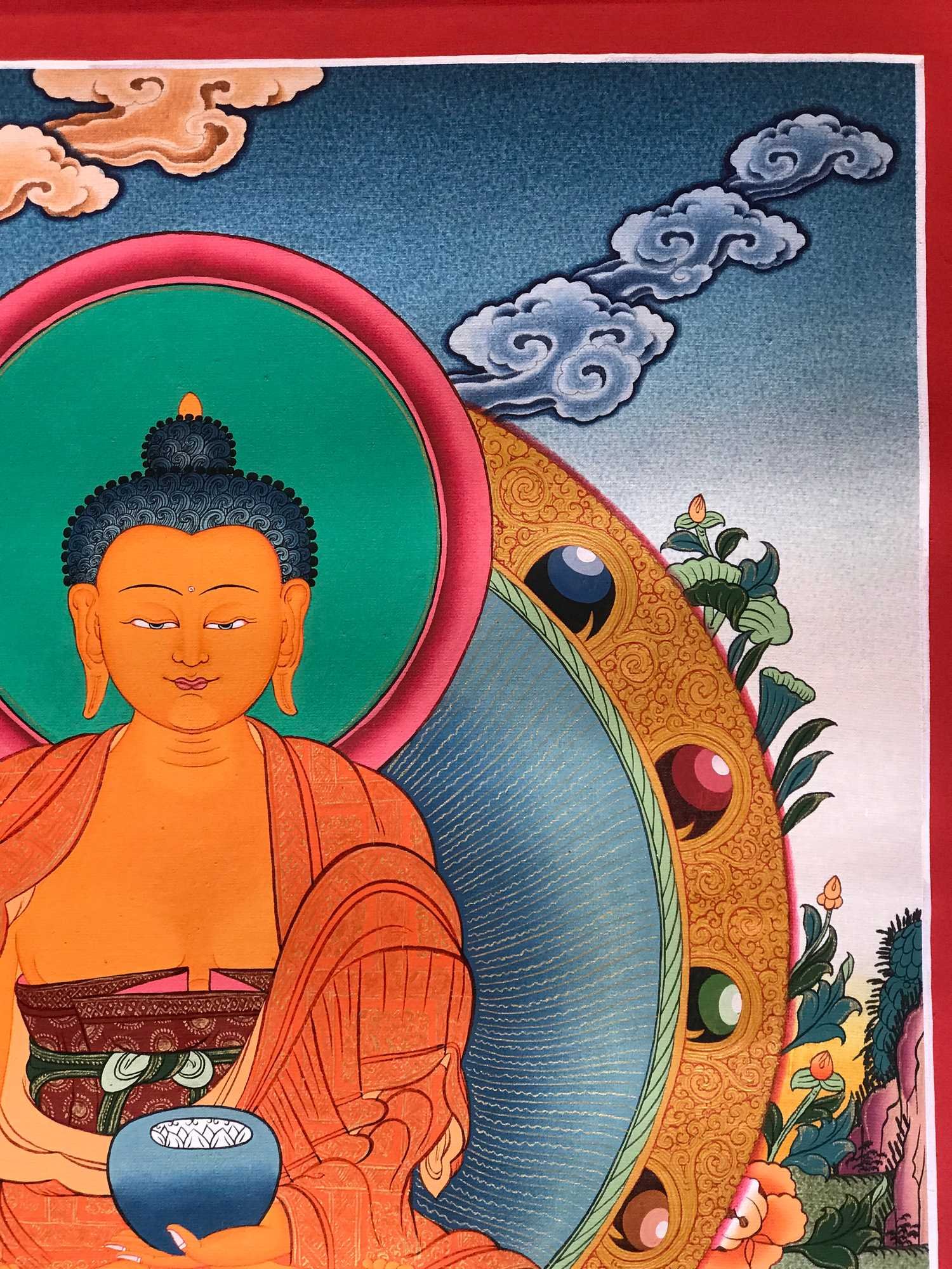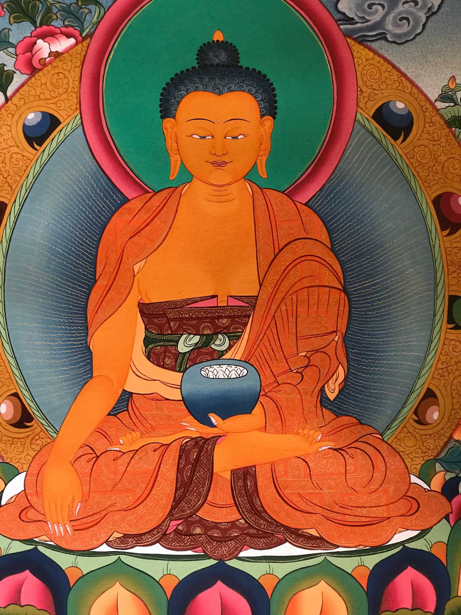 Gautama is painted with golden skin sitting in a lotus seat [Skt. Padmasana] also called the meditative seat [Skt. Dhyanasana] & upon a white moon disc which represents the male principle of method which itself is upon a lotus throne. His left hand touches the ground in what is called bhumisparse mudra which symbolises his own recognition of enlightened mind in one of the most iconic images in all Buddhism. The palm always faces inwards. His feet are deliberately drawn level with one another & enlarged, being specific marks of a Buddha. His right hand supports an alms bowl [Skt. Patra], containing the liquid elixir of eternal life. Somehow the simple image of the bowl reflects his overwhelming humility & kindness. He wears the traditionally maroon gold monk's patched robe [Skt. Samghati] made of twenty five pieces of cloth which the first Buddhist monks sewed together. The Buddha has a green nimbus and blue aureole around his body signifying the highest level of understanding. Siddhartha is surrounded by Pink Lotuses [Skt. Padma]. This kind of lotus is connected with loving kindness & a flowering of pure consciousness. The closed bud to his right side represents the past or originating mind, the blooming flower represents the present & the buds represents the future Buddha Maitreya and forthcoming realisations. His elongated earlobes depict his royal connection; his knotted black hair & topknot symbolise his abandonment of worldly possessions; the dot [Skt. Urna] on his brow on the command chakra [Skt. Ajna] represents his transcendent wisdom, the 31st mark of a Buddha.