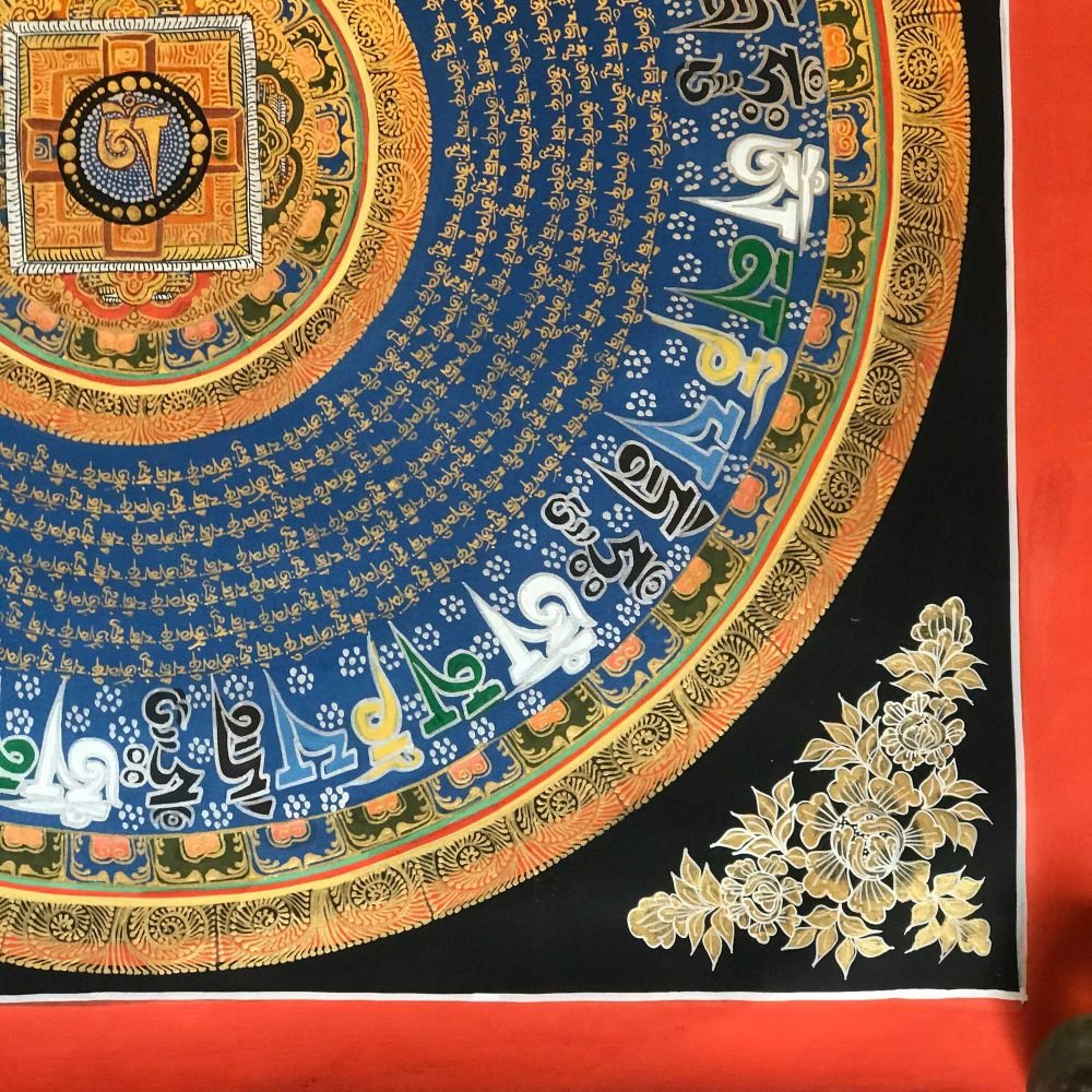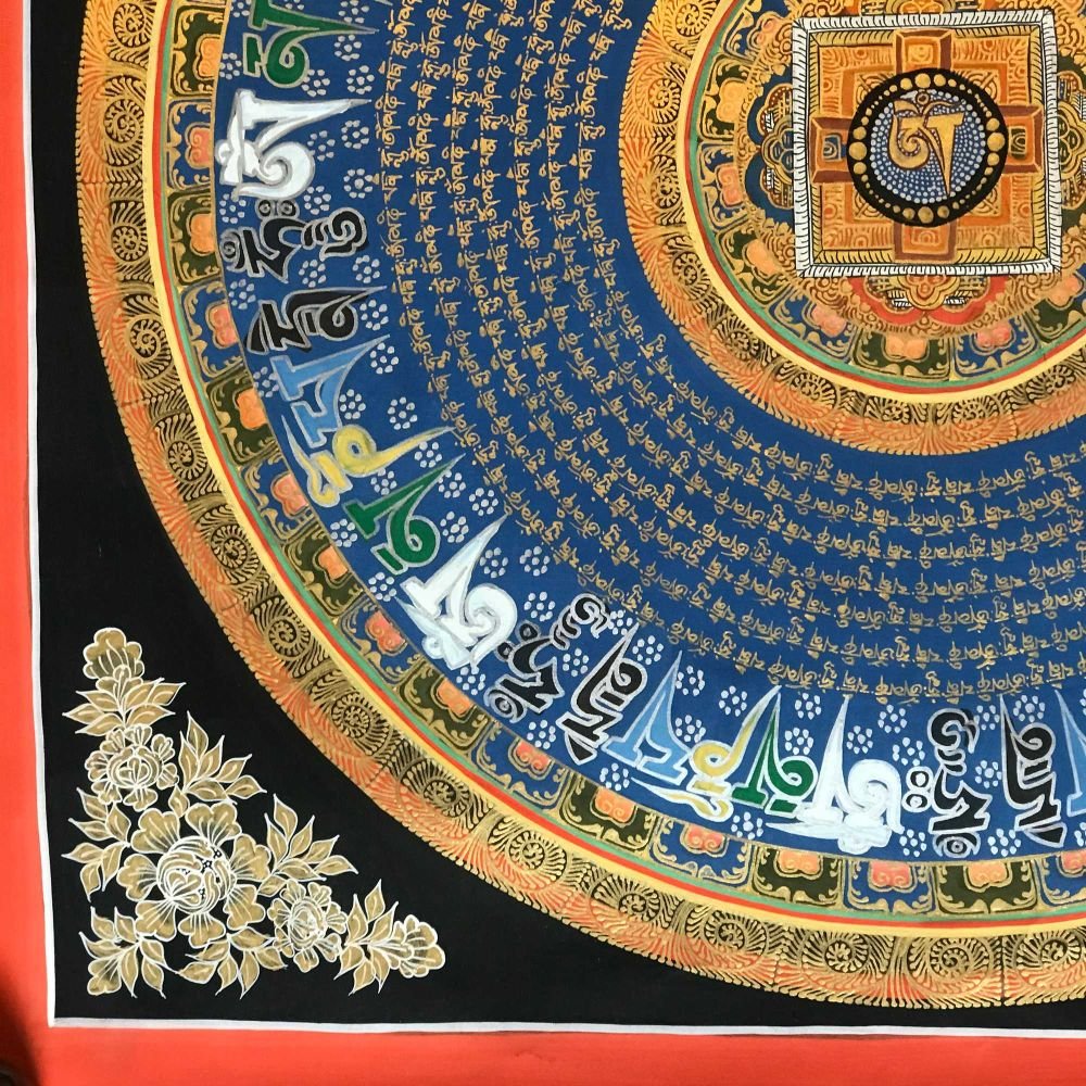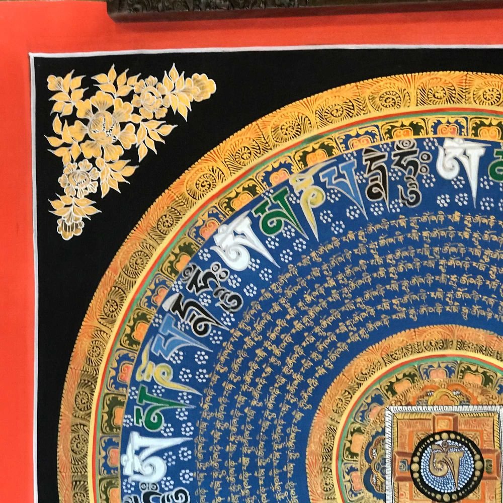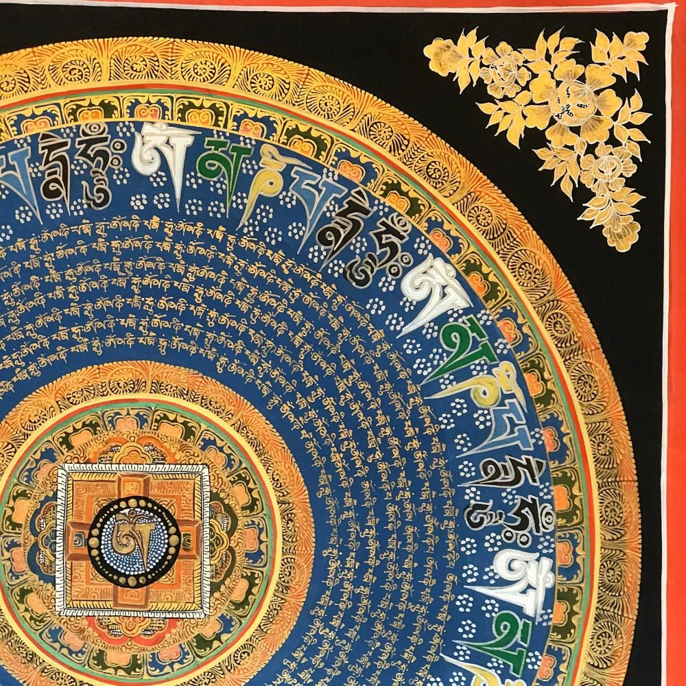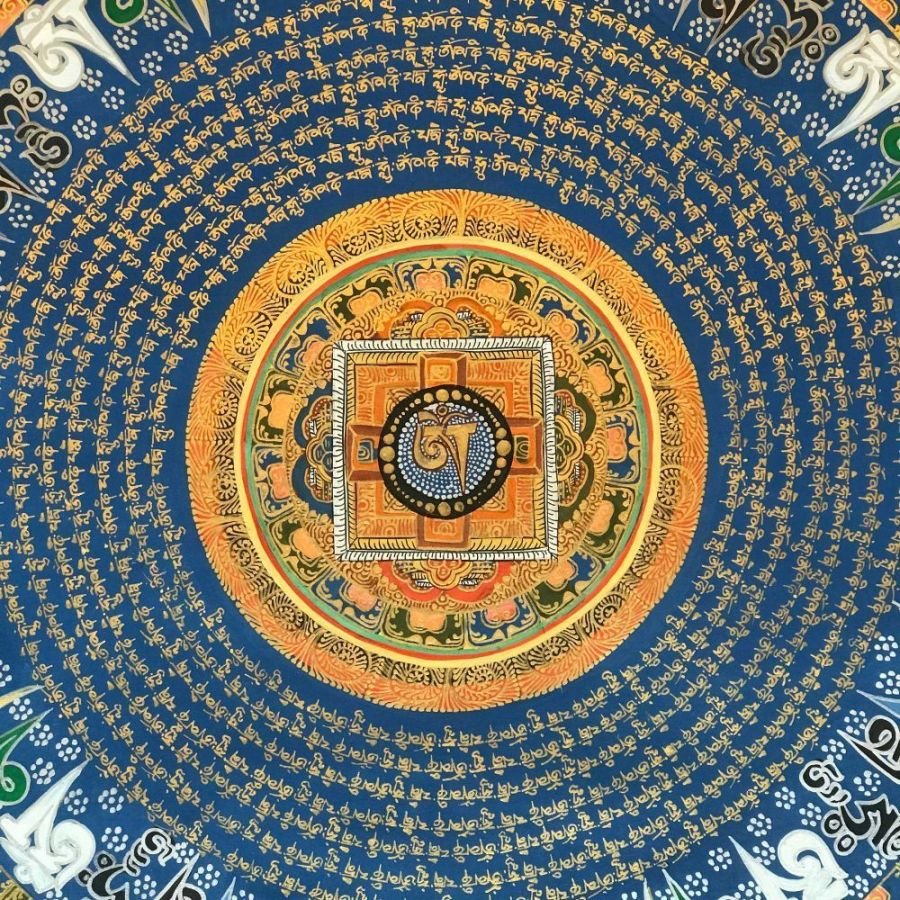 OM MANI PADME HUM is also inscribed in Mandala paintings. Those kinds of mandala have OM MANI PADME HUM in a circular fashion, and mantras are painted in concentric circles from the surface to the center of the circle. They come under the categories of the Mantra Mandala. These mandalas are usually found hanging on the walls of Buddhist monasteries and are often used in meditation halls for focus and concentration purposes.