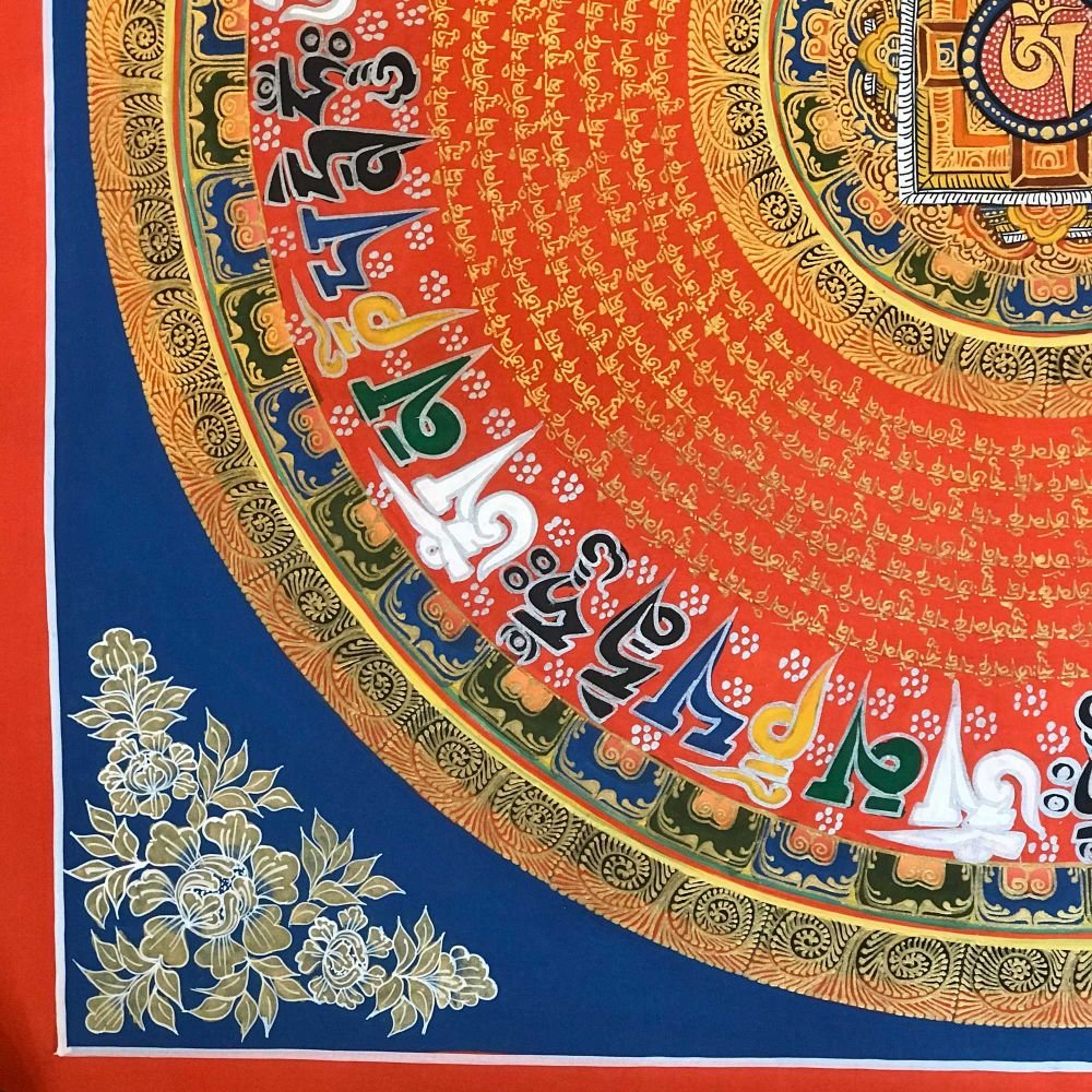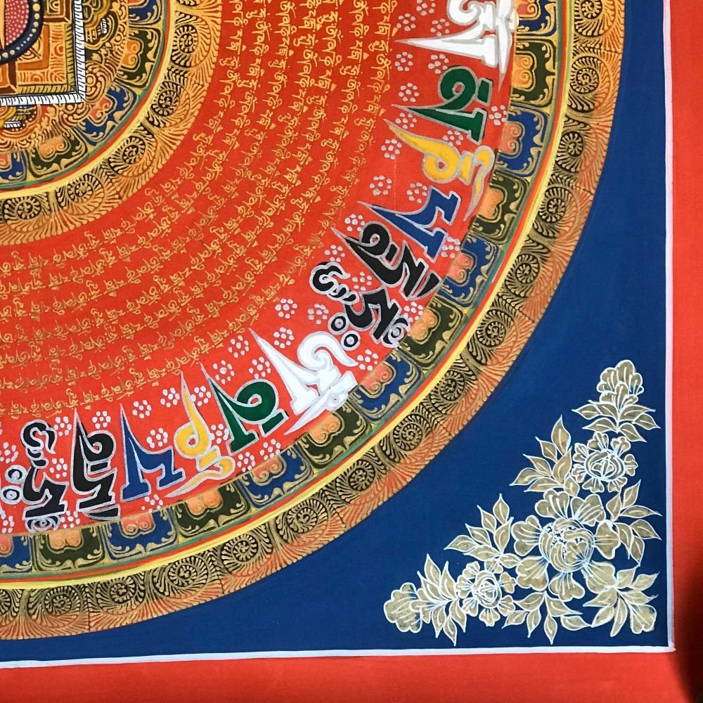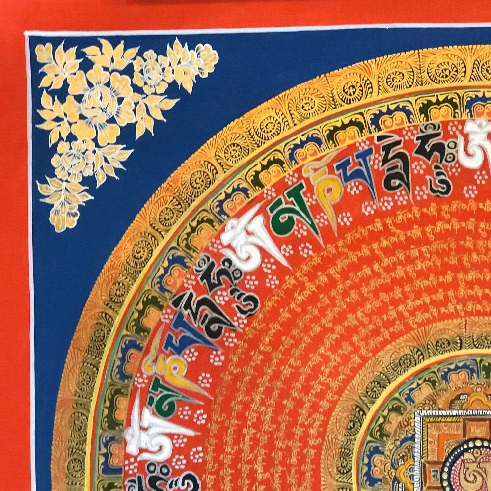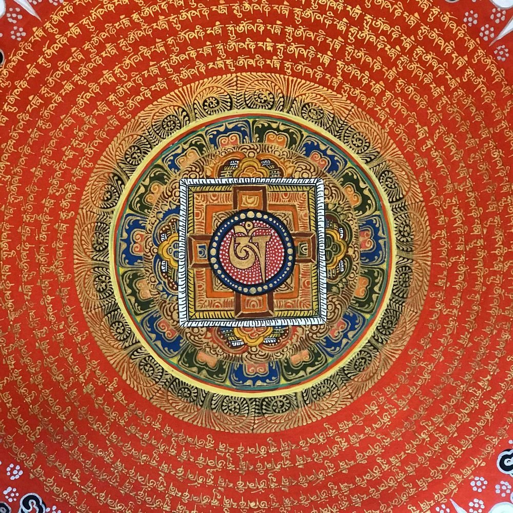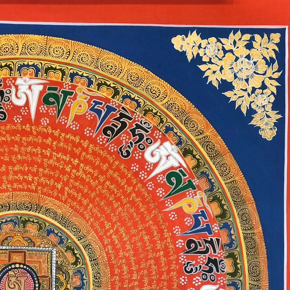 OM MANI PADME HUM is also inscribed in Mandala paintings. Those kinds of mandala have OM MANI PADME HUM in a circular fashion, and mantras are painted in concentric circles from the surface to the center of the circle. They come under the categories of the Mantra Mandala. These mandalas are usually found hanging on the walls of Buddhist monasteries and are often used in meditation halls for focus and concentration purposes.