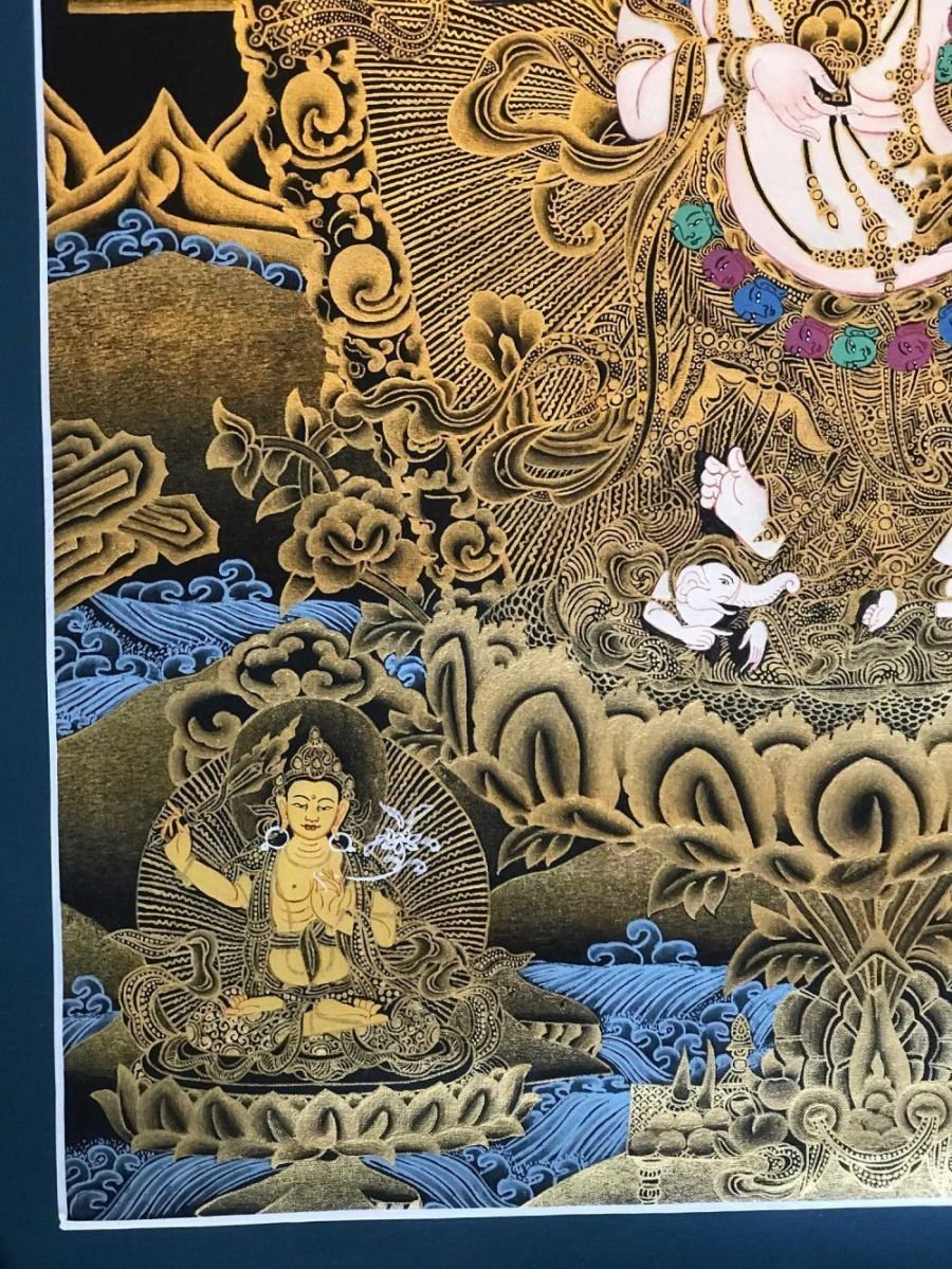 A thangka, also known as tangka, thanka, or tanka, is a vibrant and intricate Tibetan Buddhist painting that serves as a visual representation of spiritual teachings. Crafted with meticulous detail on cotton or silk appliqué, thangkas depict a wide range of subjects including Buddhist deities, sacred scenes, mandalas, and narrative stories. These sacred artworks are traditionally kept unframed and rolled up for storage, resembling ancient scrolls. To protect their delicate nature, thangkas are mounted on textile backings and often adorned with a silk cover on the front. Proper preservation in dry environments is crucial to maintain the integrity and longevity of the silk. Read More