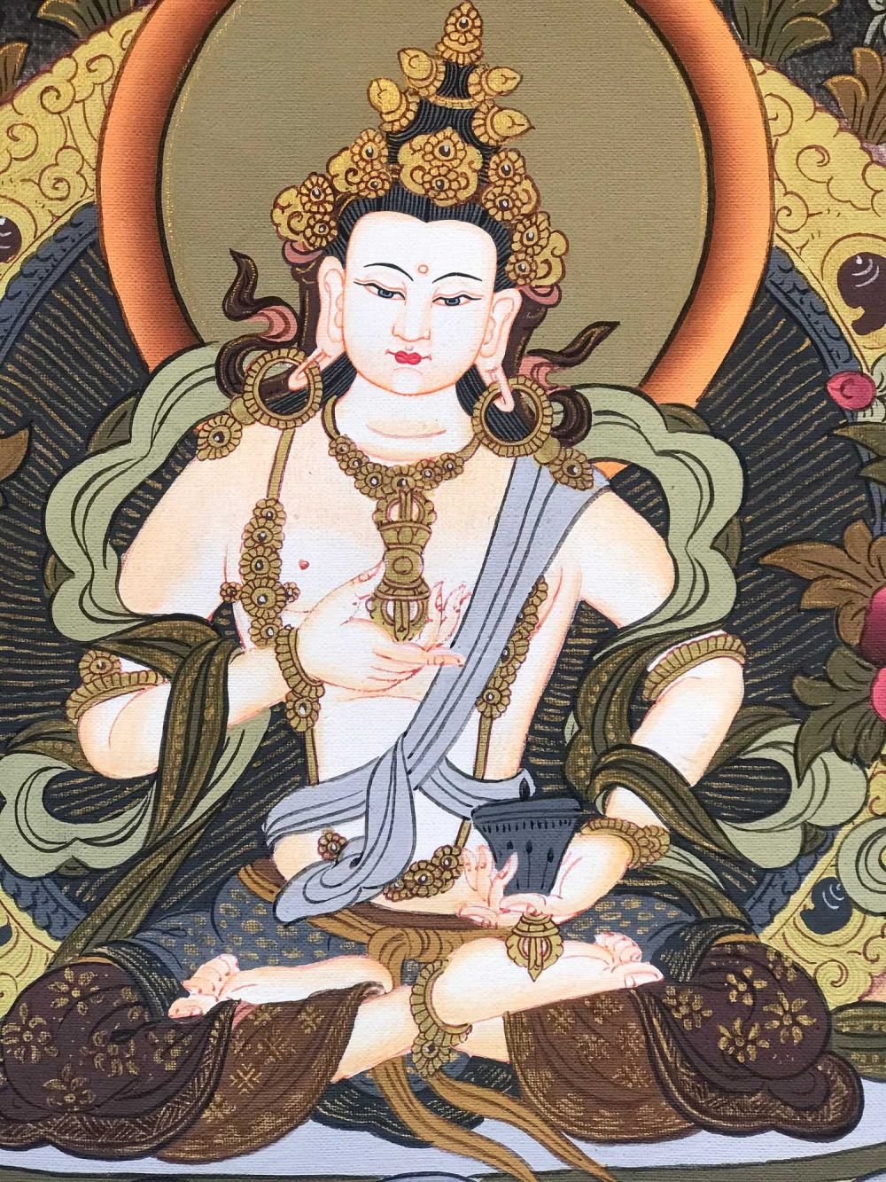 He is depicted as a young man in the prime of life, with all the silks and jewels of a wealthy prince. In his right hand he delicately balances a vajra at his heart. In his left had he holds a bell at his waist. The vajra represents Reality, and Compassion; while the bell represents Wisdom.