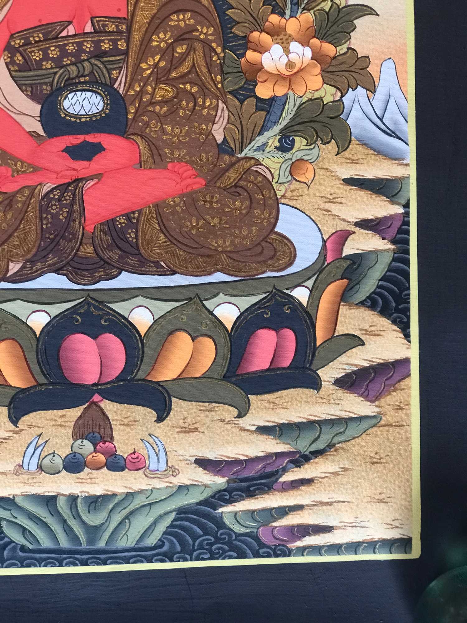 The Mount Kailash Thangka, including the black margin (which can also facilitate the fastening of a traditional brocade frame), is now complete. Only the background gold must be compacted in the places where it is later intended to exhibit a sheen.