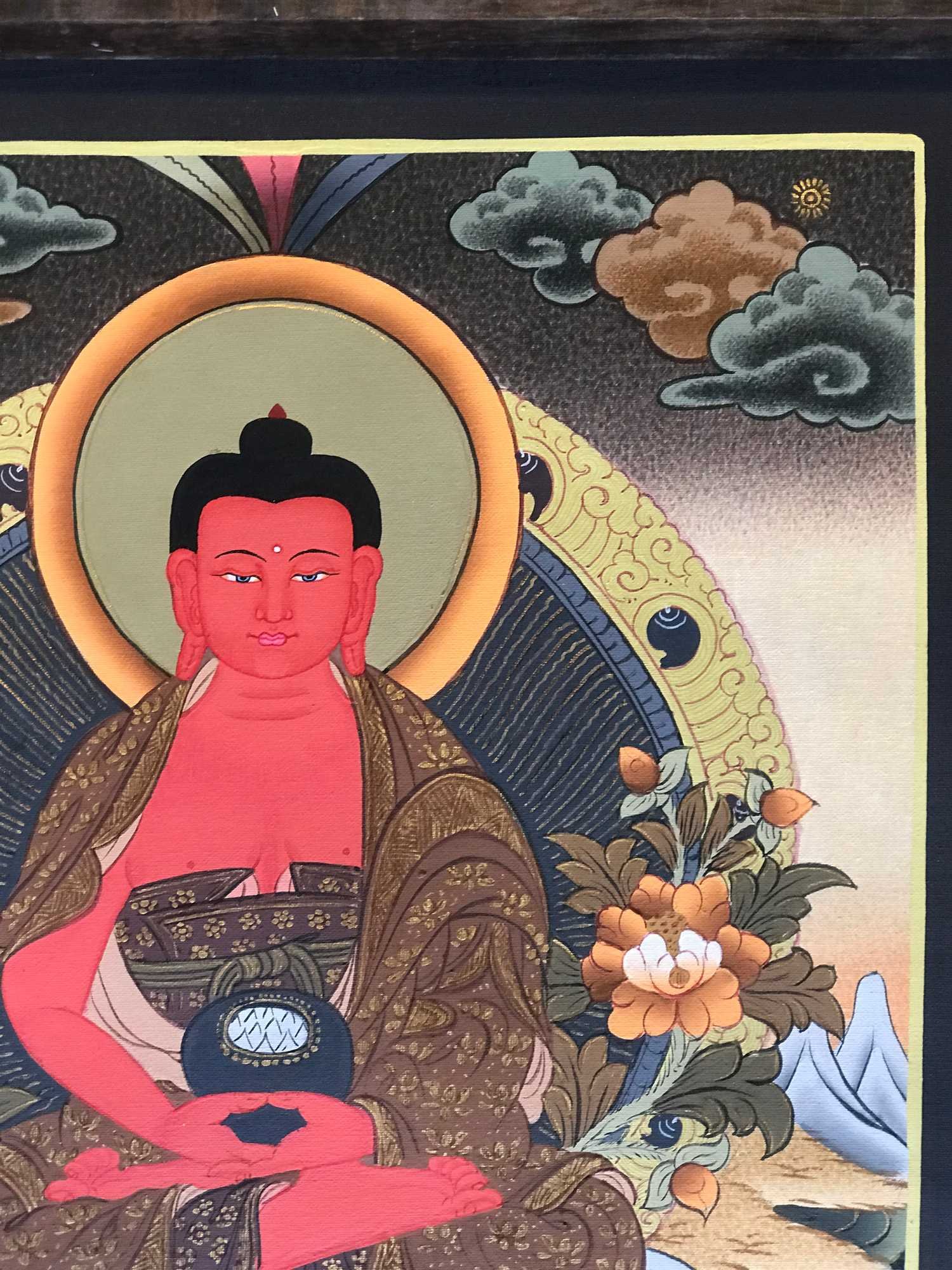In this way, through partial compaction of the gold or refraining from compaction, nearly three-dimensional effects can be achieved. The glorious sheen of gold artistically treated in this way richly rewards the beholder or meditator with a Thangka possessed of an extraordinarily aesthetic aura.