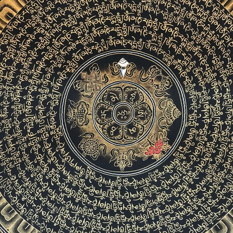 OM MANI PADME HUM is also inscribed in Mandala paintings. Those kinds of mandala have OM MANI PADME HUM in a circular fashion, and mantras are painted in concentric circles from the surface to the center of the circle. They come under the categories of the Mantra Mandala. These mandalas are usually found hanging on the walls of Buddhist monasteries and are often used in meditation halls for focus and concentration purposes.