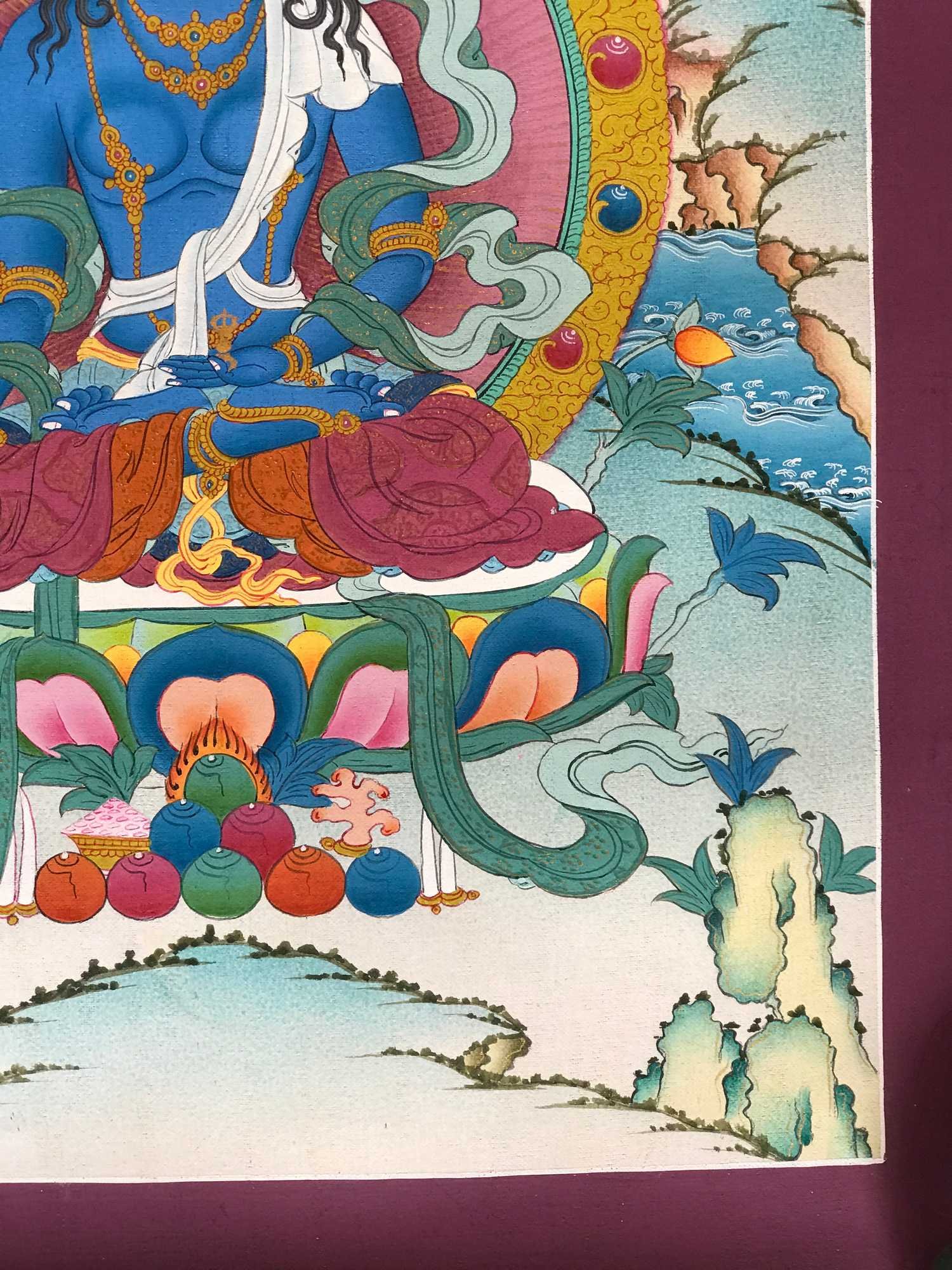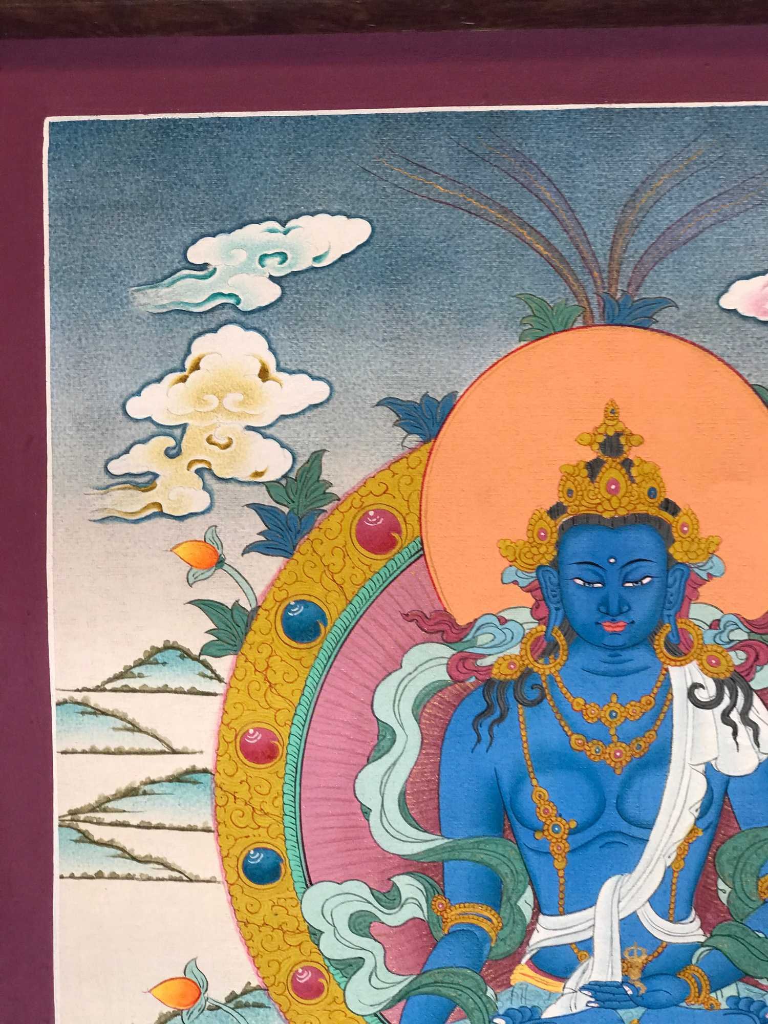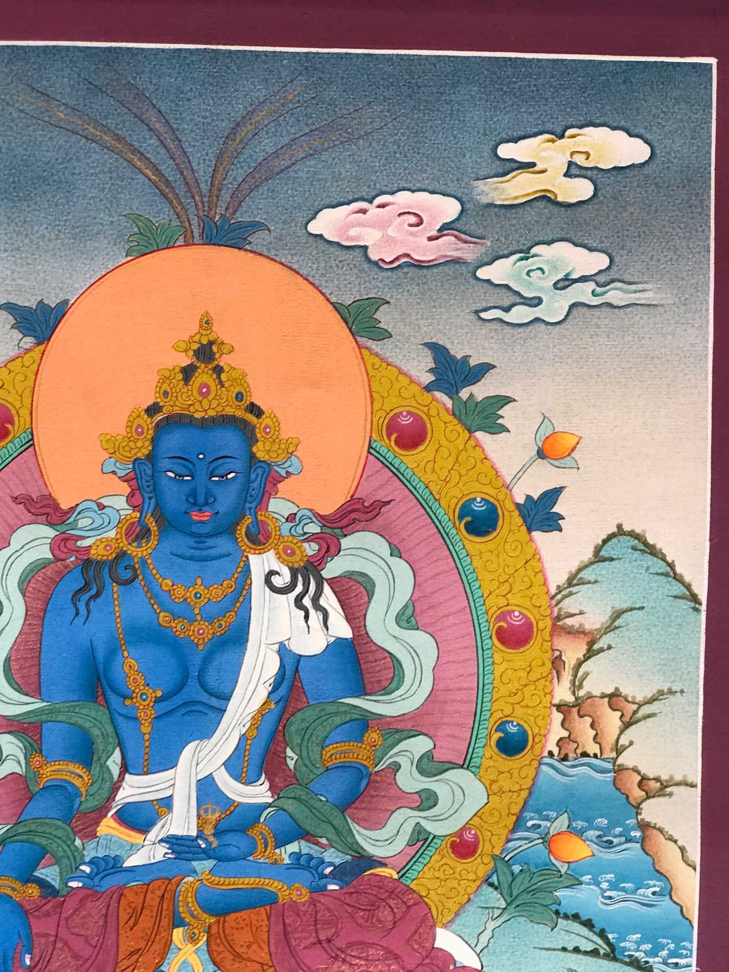 Tibetan Thangka of Blue Buddha light Color , The Enlightened One and Teacher of Humanity