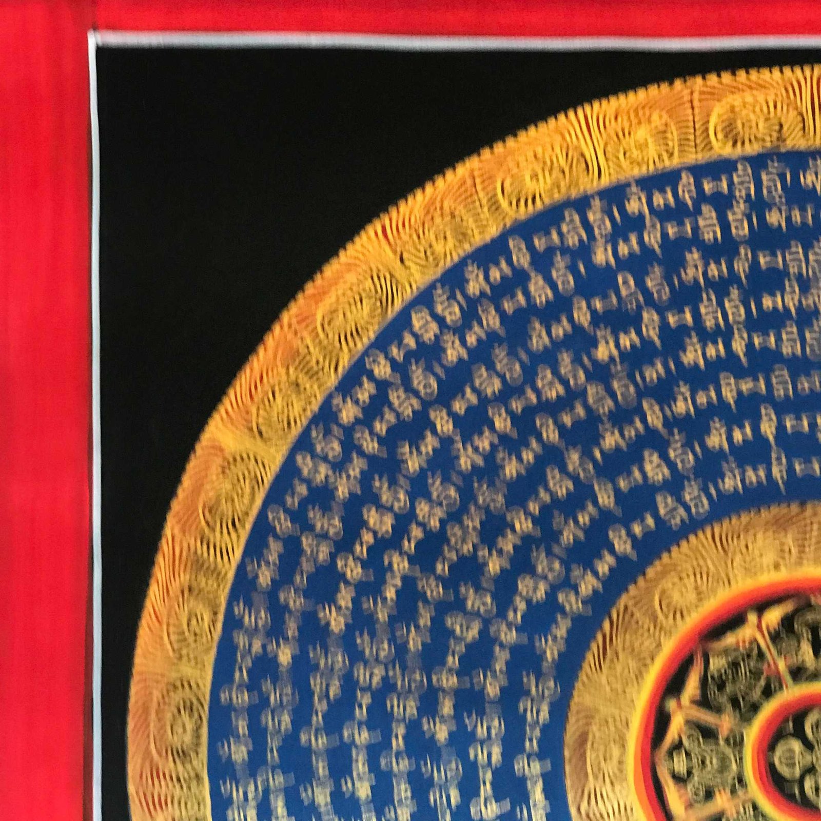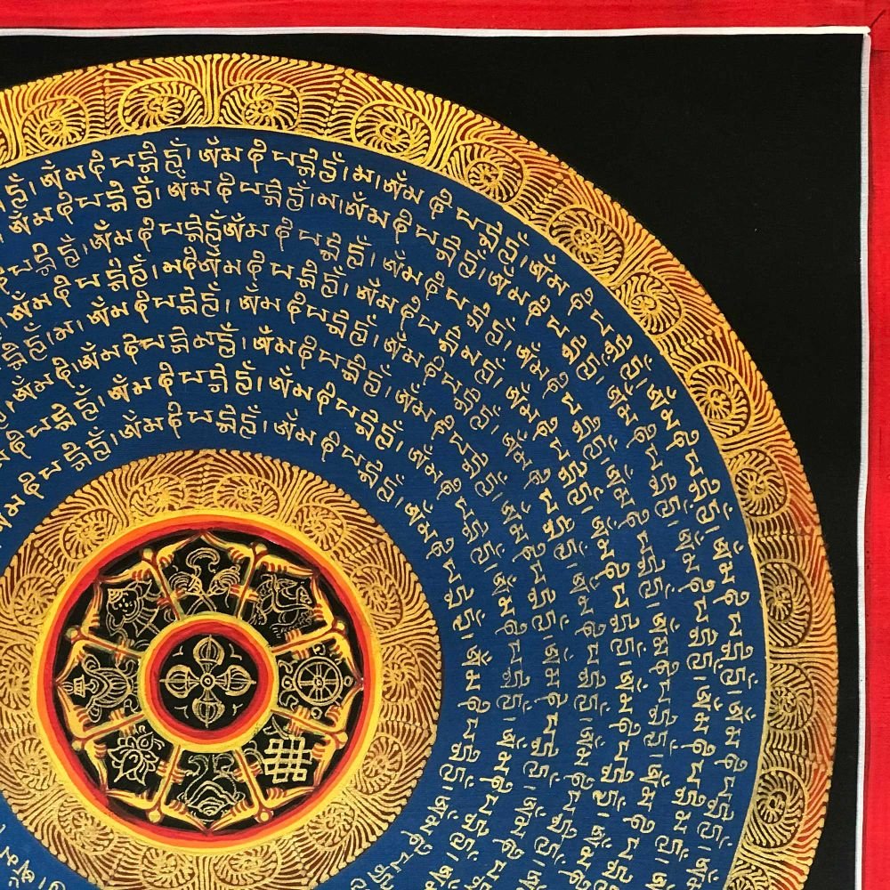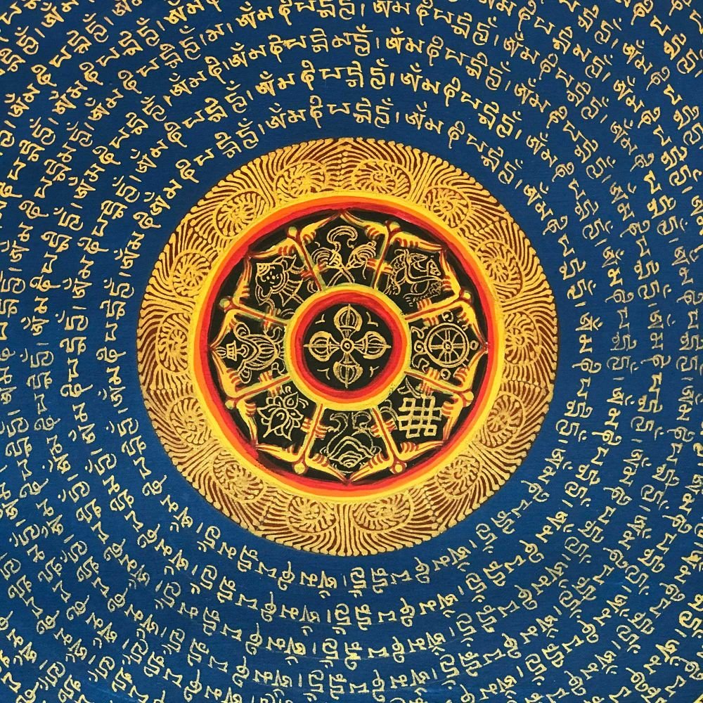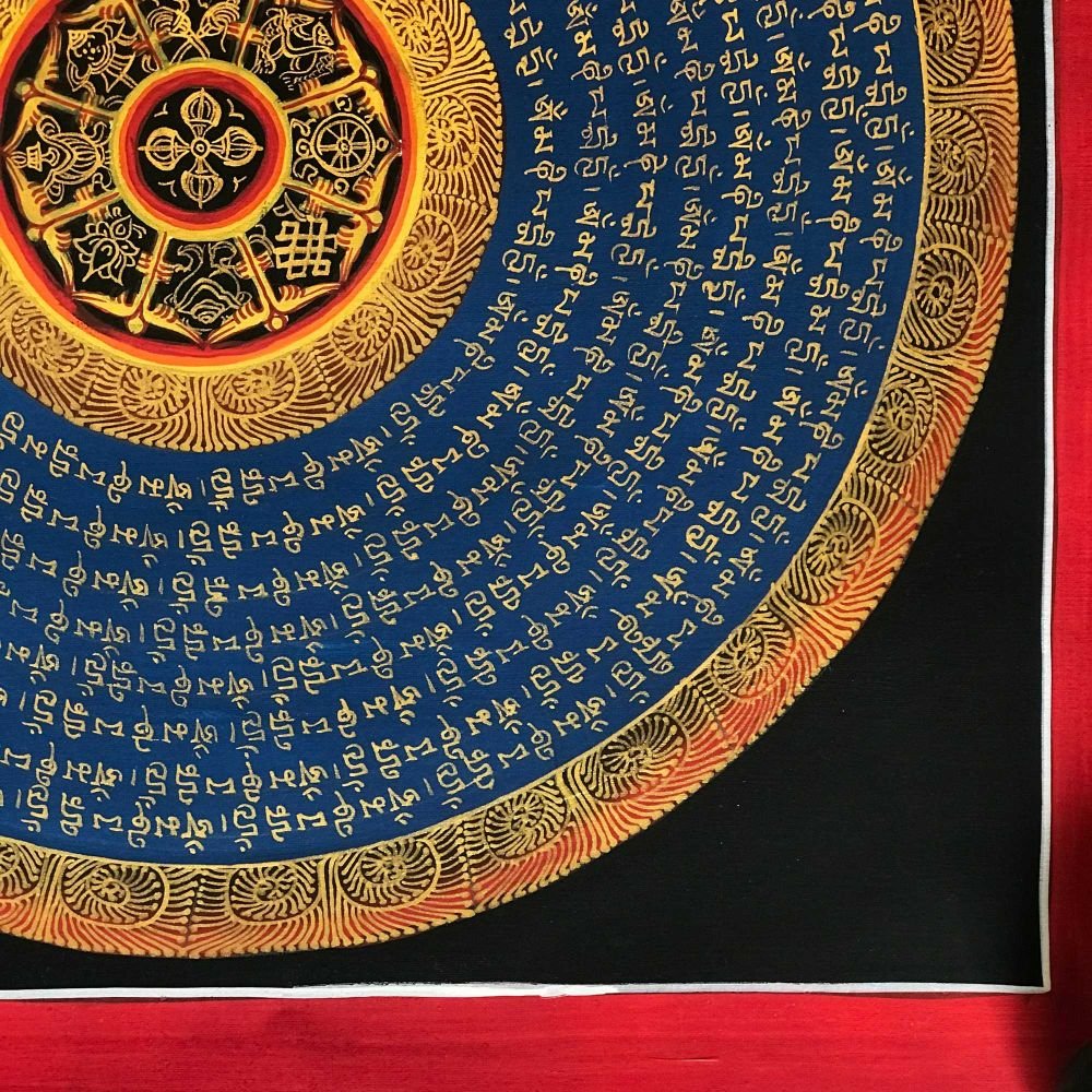 OM MANI PADME HUM is also inscribed in Mandala paintings. Those kinds of mandala have OM MANI PADME HUM in a circular fashion, and mantras are painted in concentric circles from the surface to the center of the circle. They come under the categories of the Mantra Mandala. These mandalas are usually found hanging on the walls of Buddhist monasteries and are often used in meditation halls for focus and concentration purposes.