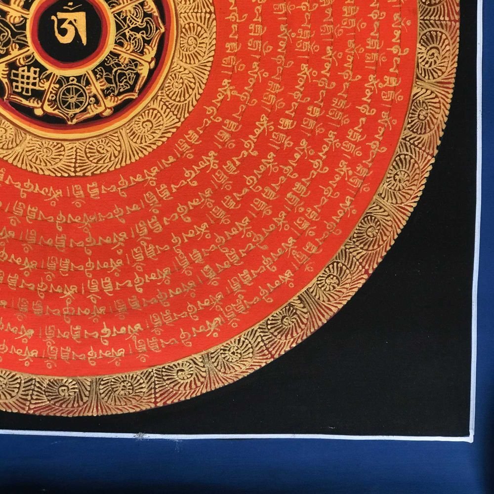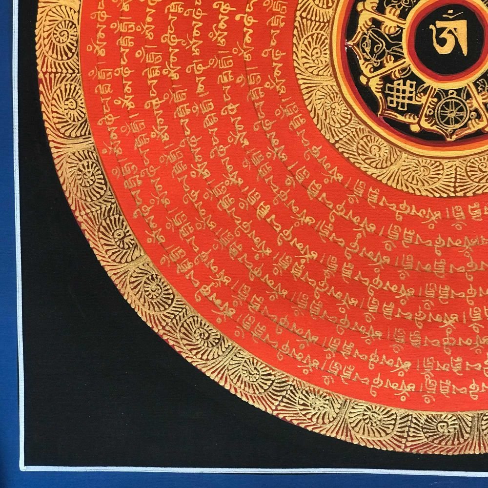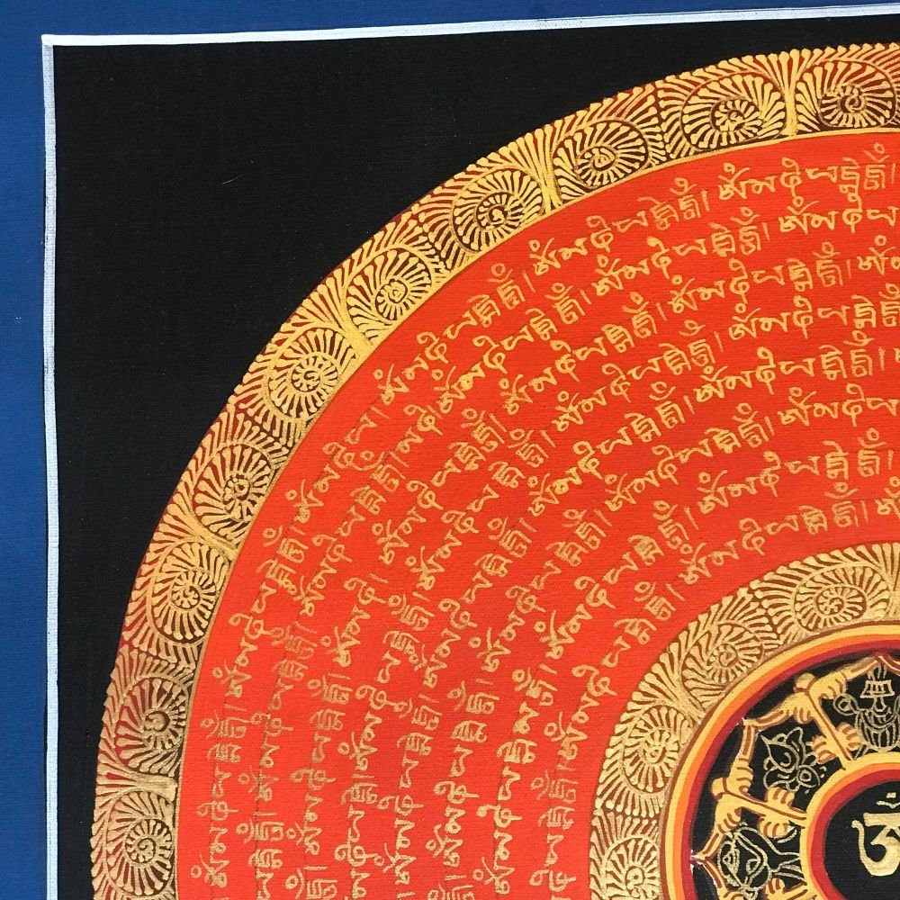 OM MANI PADME HUM is also inscribed in Mandala paintings. Those kinds of mandala have OM MANI PADME HUM in a circular fashion, and mantras are painted in concentric circles from the surface to the center of the circle. They come under the categories of the Mantra Mandala. These mandalas are usually found hanging on the walls of Buddhist monasteries and are often used in meditation halls for focus and concentration purposes.