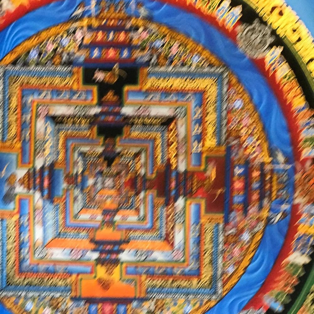 Although depicted here on a flat surface, the mandala is actually three-dimensional, being a five-storeyed "divine mansion", at the centre of which stands the Kalachakra deity the manifest state of Enlightenment.