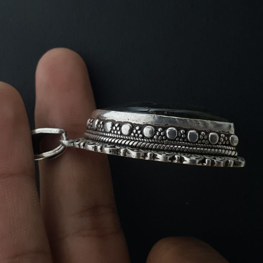 A Nepali silver pendant is a beautiful piece of jewelry that is often adorned with semi-precious stones and intricate designs. These pendants are often made by skilled artisans in Nepal who use traditional techniques and designs that have been passed down through generations.