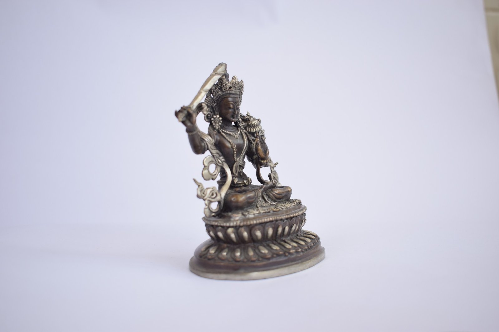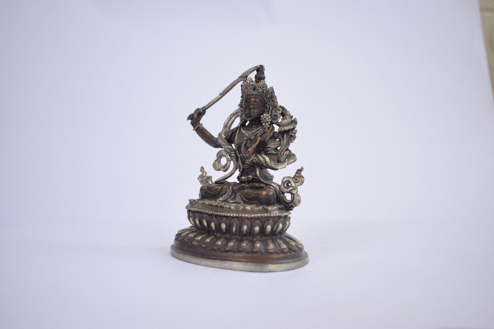Buddhist Statue of Manjushri, On Double Lotus Base Silver Plated Oxidized Finishing , Wisdom Buddha, cutting through ignorance with the sword of insight
