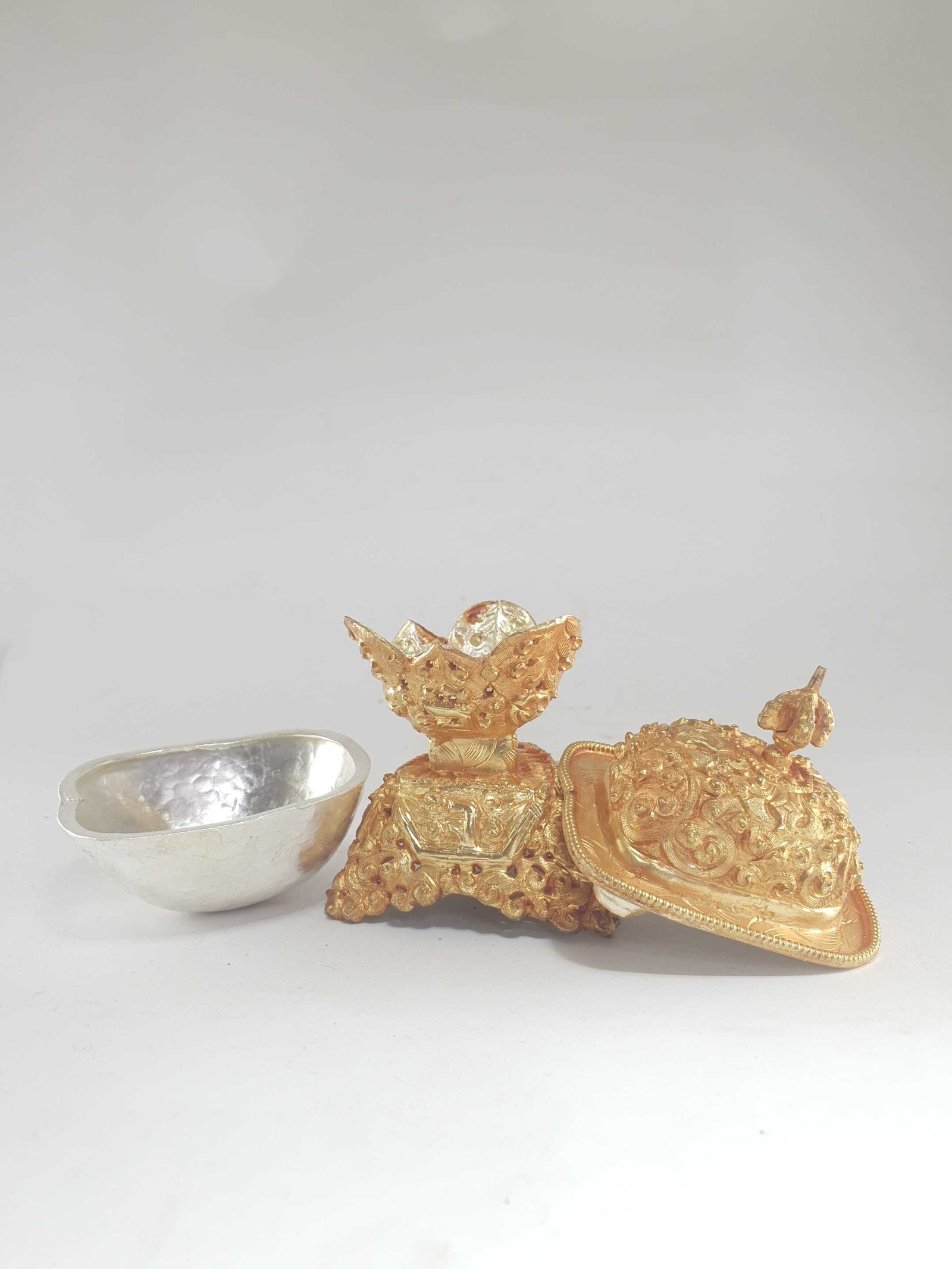 The Kapala has a full Silver plated finish, Sliver plating process involves the application of a thin layer of genuine silver onto the surface of the Kapala, creating a stunning and lustrous appearance. Skilled artisans handle the silver plating, ensuring even coverage and a flawless finish. The silver plating adds a touch of elegance and sophistication to the Kapala, enhancing its overall aesthetic appeal. Read More