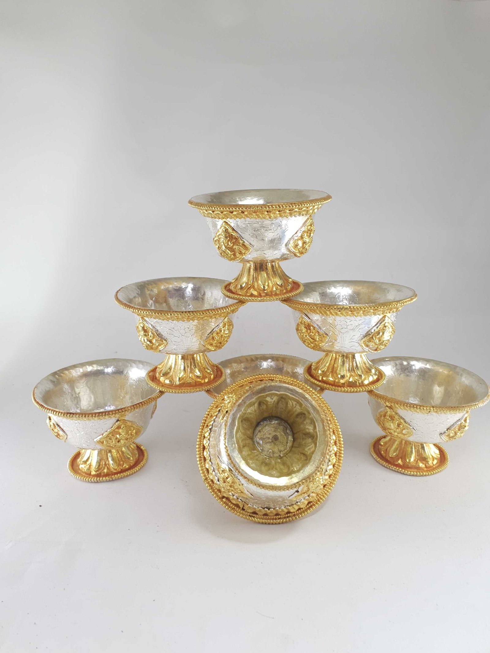 Small Copper offering Bowl with Stand and Hand Carving 7 Pcs Set, Gold and Silver Plated |