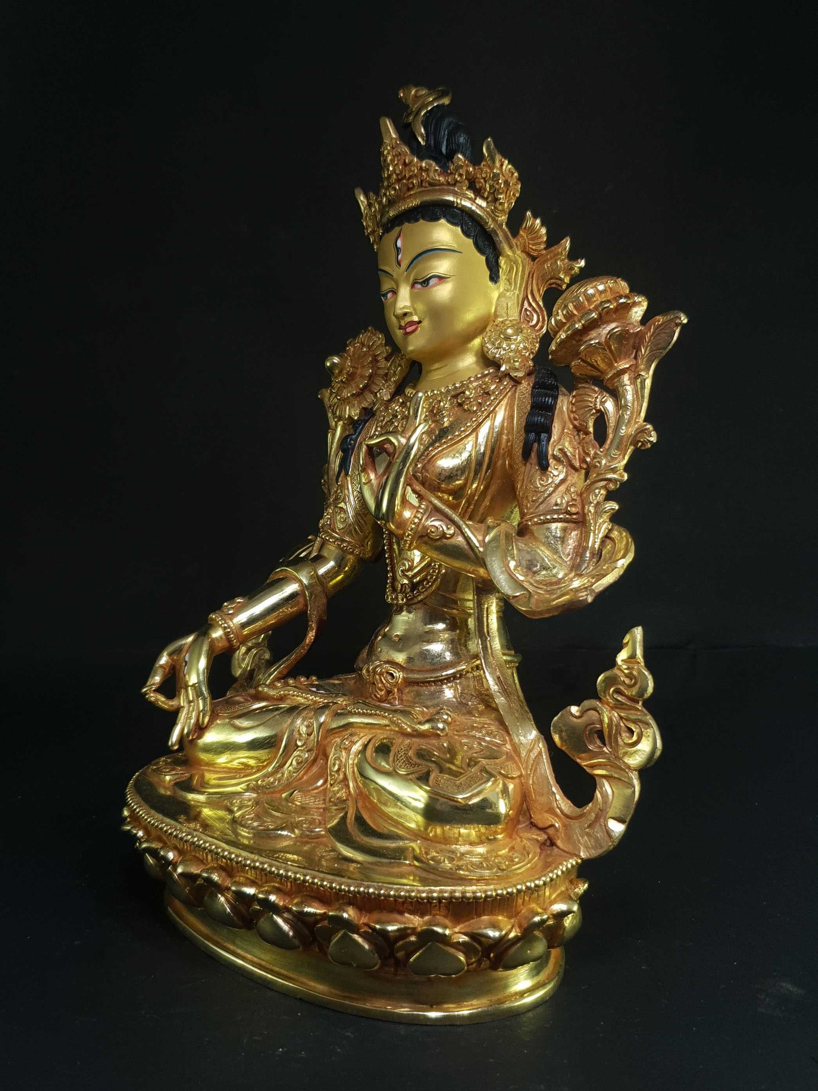 The face of White Tara is painted with gold to enhance its significant features, particularly the eyes, and lips. This detailed painting is essential as it brings forth the crucial attributes of the expression of eyes and lips that metal carving alone cannot capture.