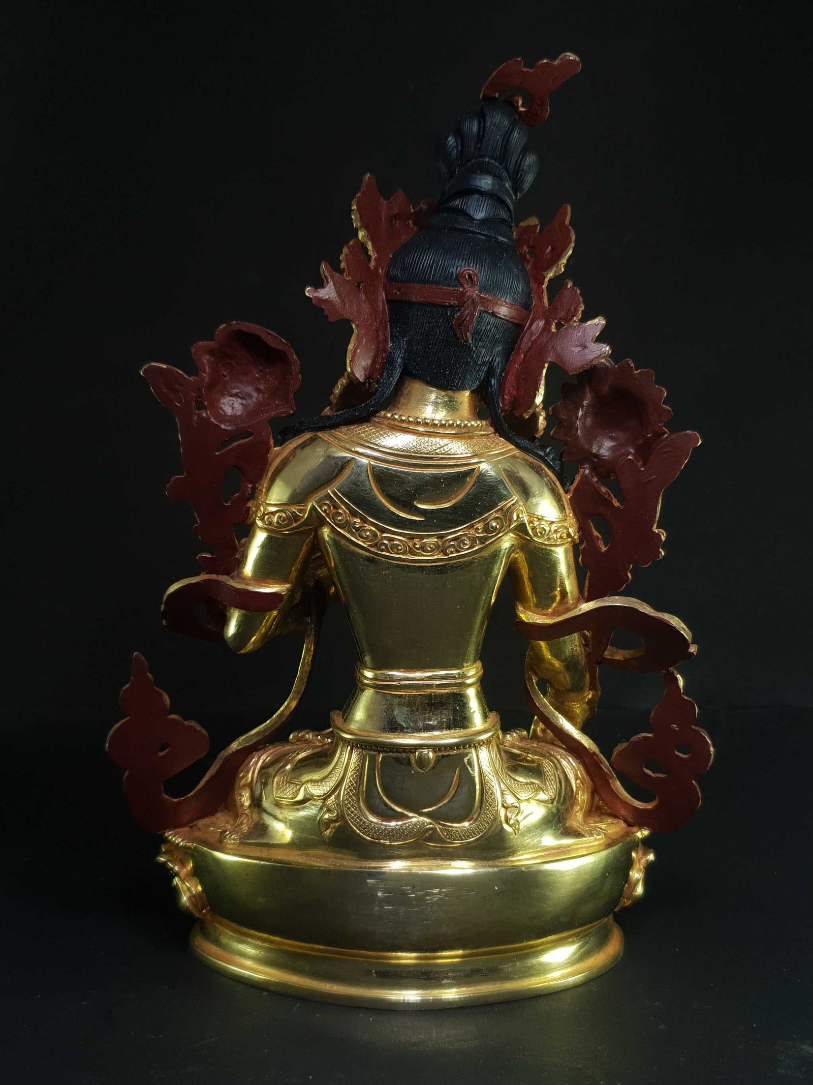 This White Tara is finished with full gold plating. also known as mercury gold plating or fire gold plating. This traditional technique involves the application of a genuine layer of gold onto the White Tara. Referred to as mercury gold plating, it is considered the correct and authentic form of gold plating in Nepal. Despite being more expensive than electroplating, this traditional mercury gold plating is gaining popularity again in Nepal. People are drawn to its authenticity, longevity, and the unmatched beauty it brings to the White Tara. The resurgence of interest in this traditional form of gold plating reflects a growing appreciation for the craftsmanship and cultural heritage of Nepal Read More