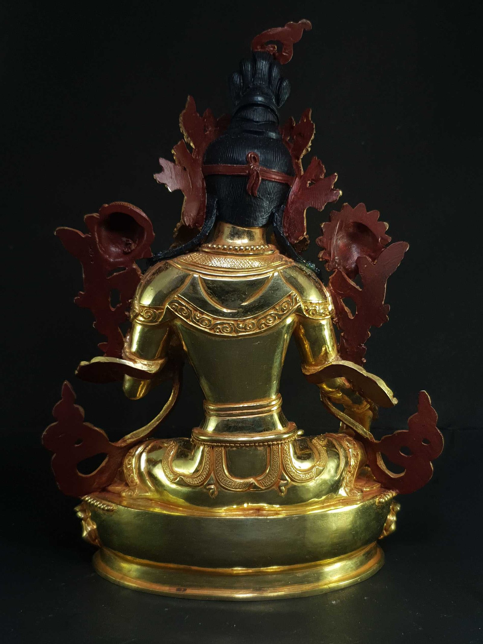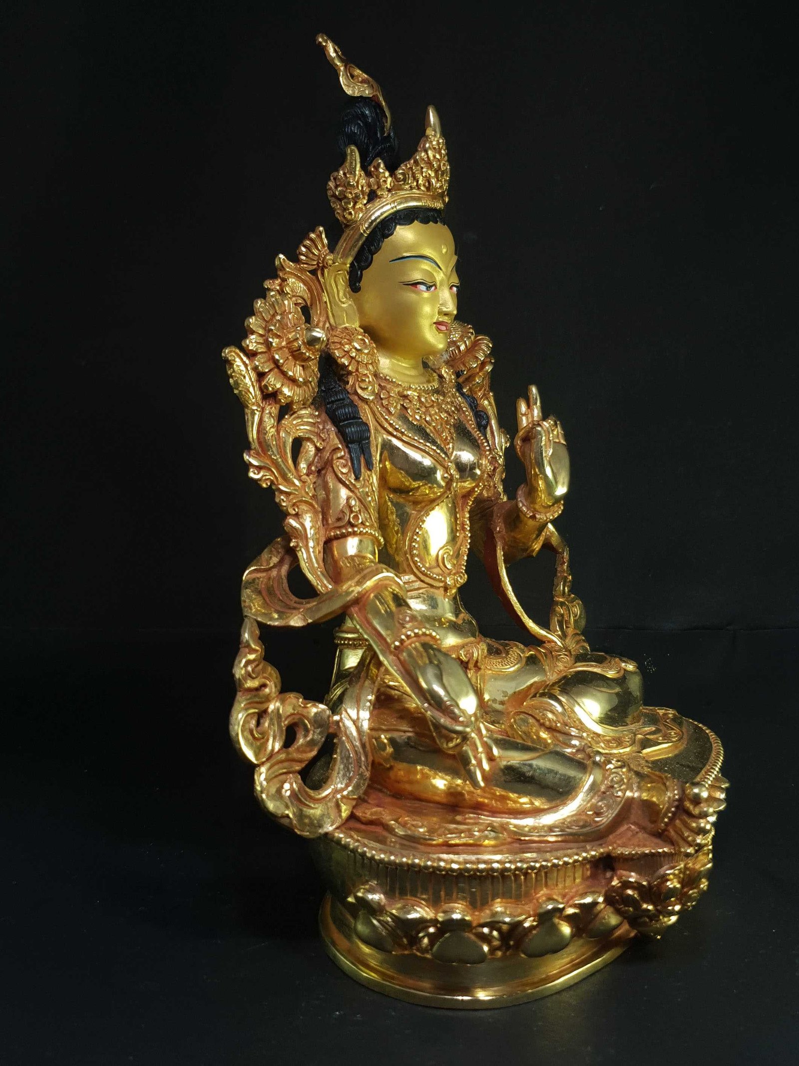 This Green Tara is finished with full gold plating. also known as mercury gold plating or fire gold plating. This traditional technique involves the application of a genuine layer of gold onto the Green Tara. Referred to as mercury gold plating, it is considered the correct and authentic form of gold plating in Nepal. Despite being more expensive than electroplating, this traditional mercury gold plating is gaining popularity again in Nepal. People are drawn to its authenticity, longevity, and the unmatched beauty it brings to the Green Tara. The resurgence of interest in this traditional form of gold plating reflects a growing appreciation for the craftsmanship and cultural heritage of Nepal Read More