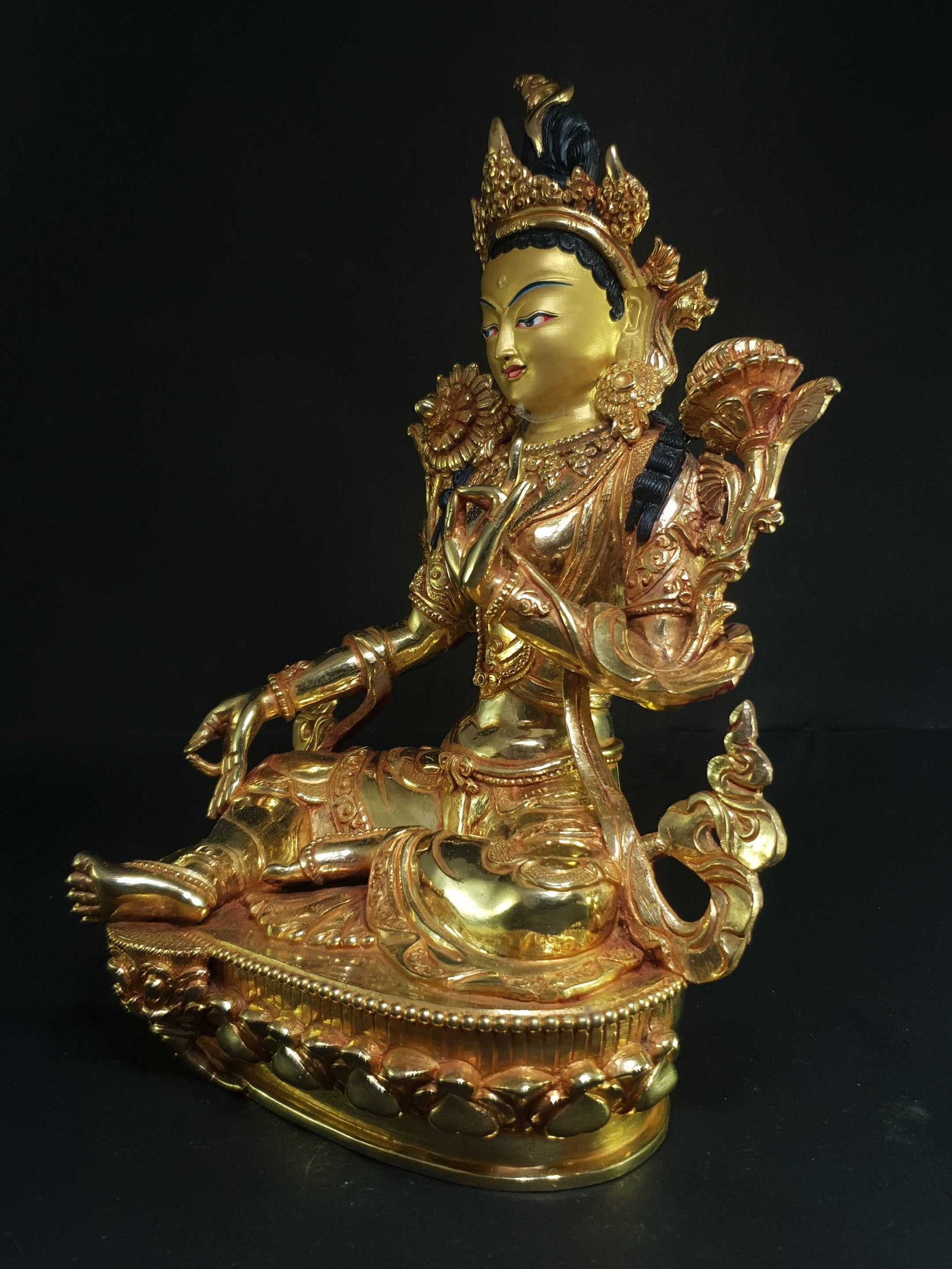 The face of Green Tara is painted with gold to enhance its significant features, particularly the eyes, and lips. This detailed painting is essential as it brings forth the crucial attributes of the expression of eyes and lips that metal carving alone cannot capture.